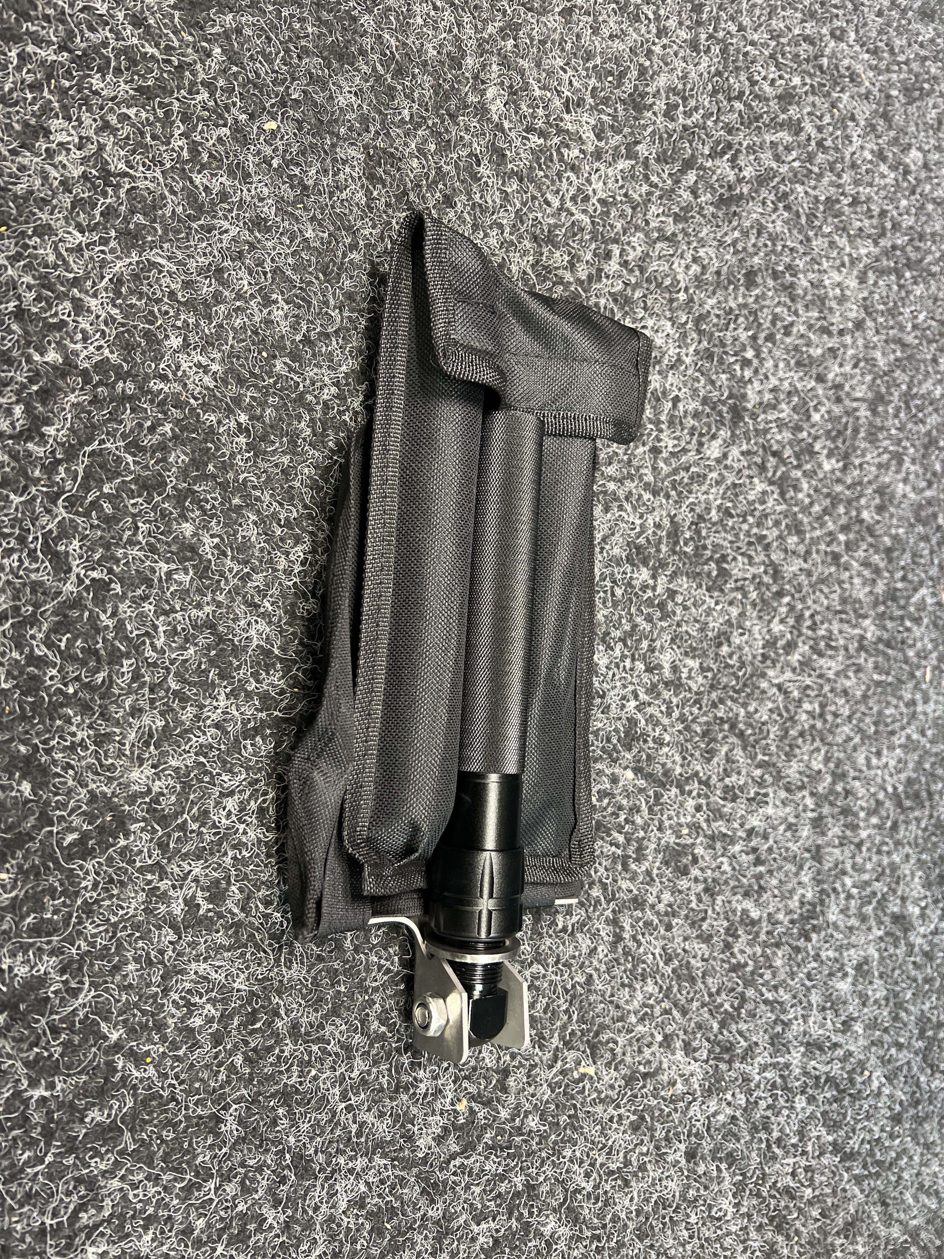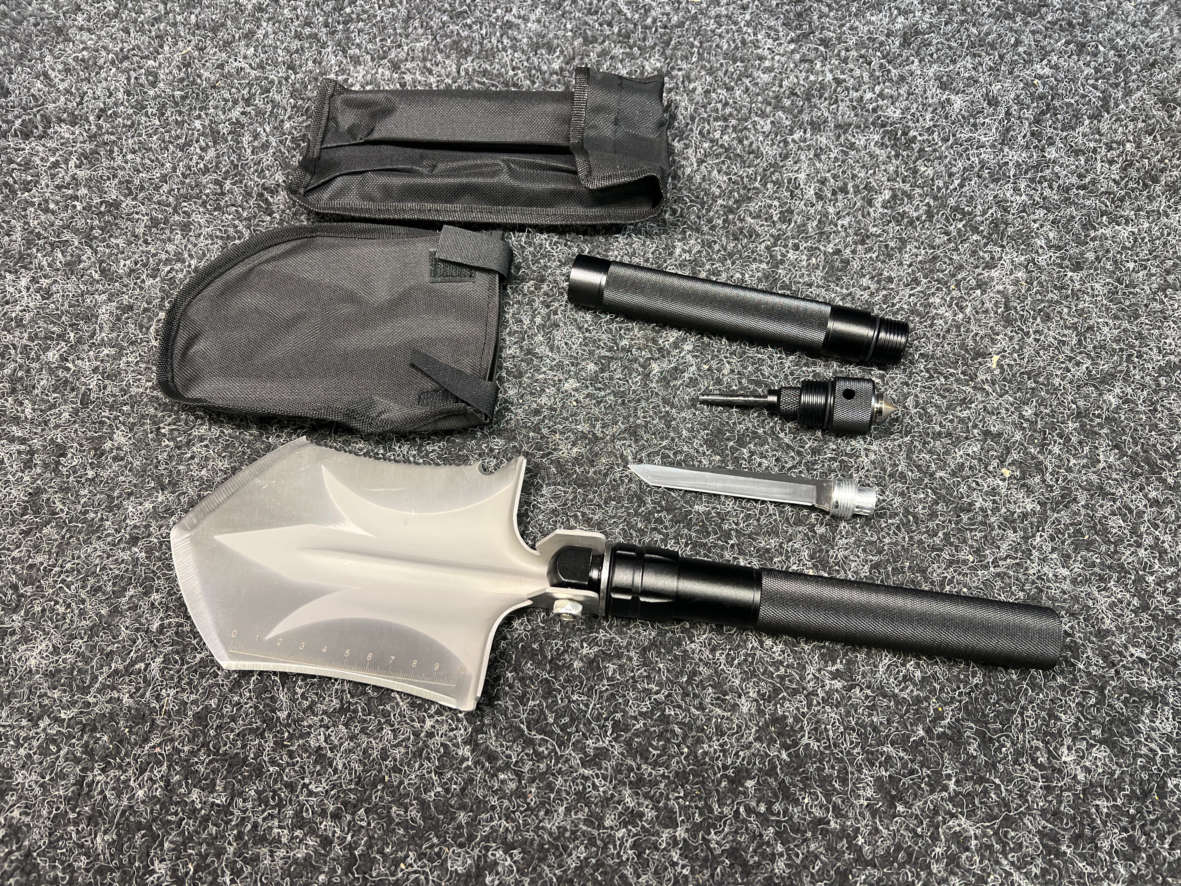 Folding shovel, knife, whistle with fire steel, glass breaker, protective case