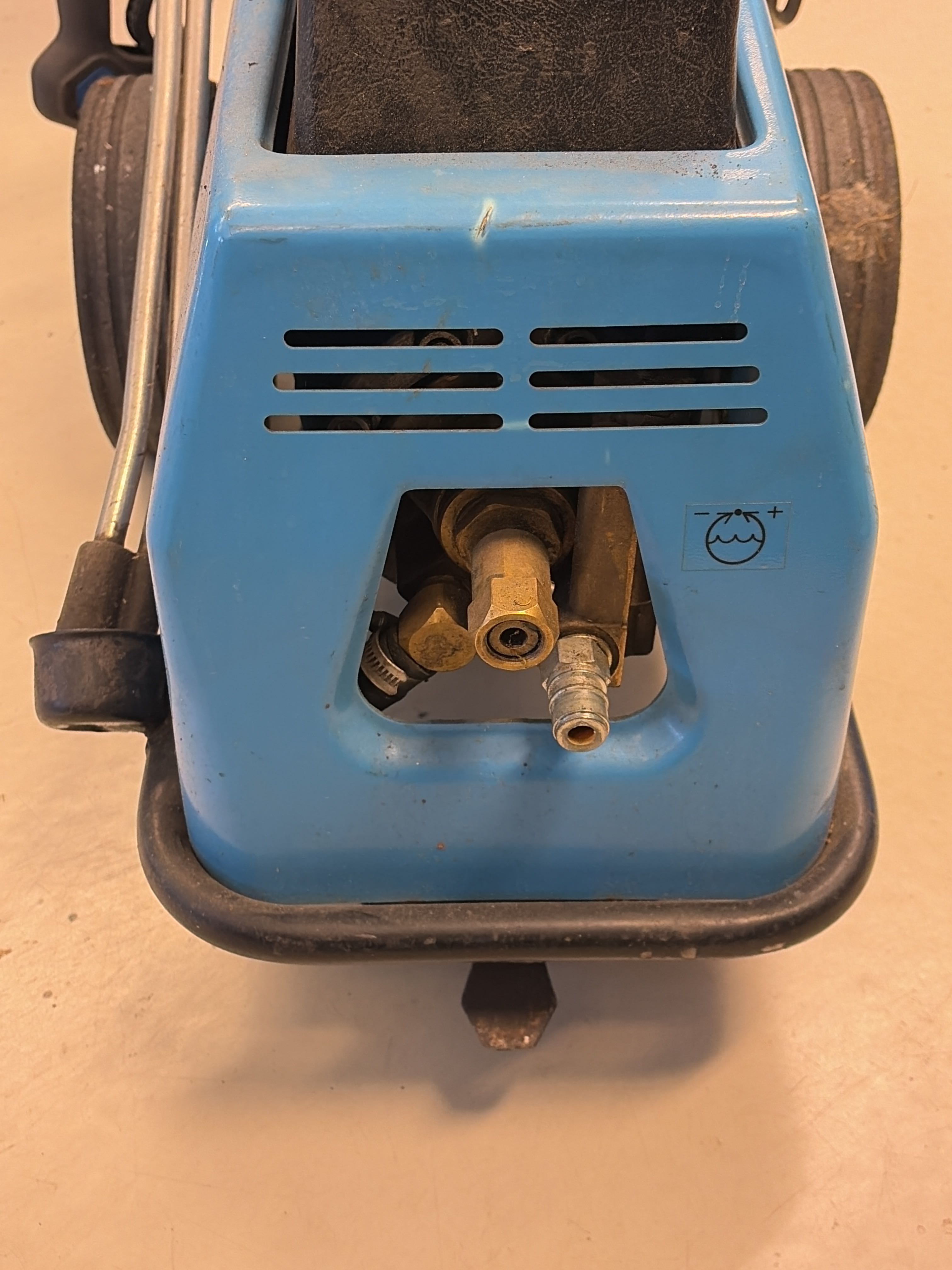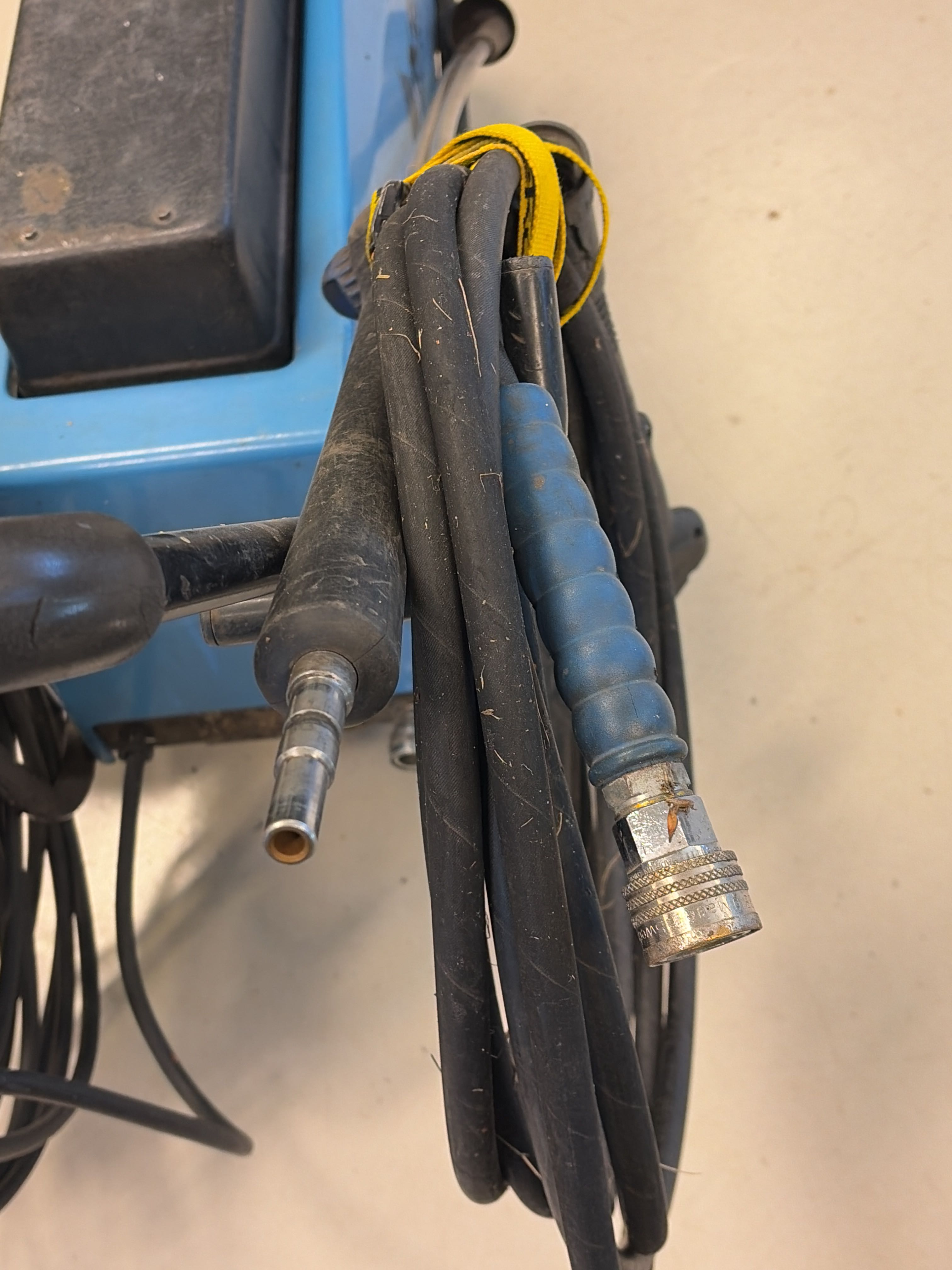 The machine is mobile with wheels and handles and is equipped with a high-pressure hose and spray gun as well as a drain cleaner.
