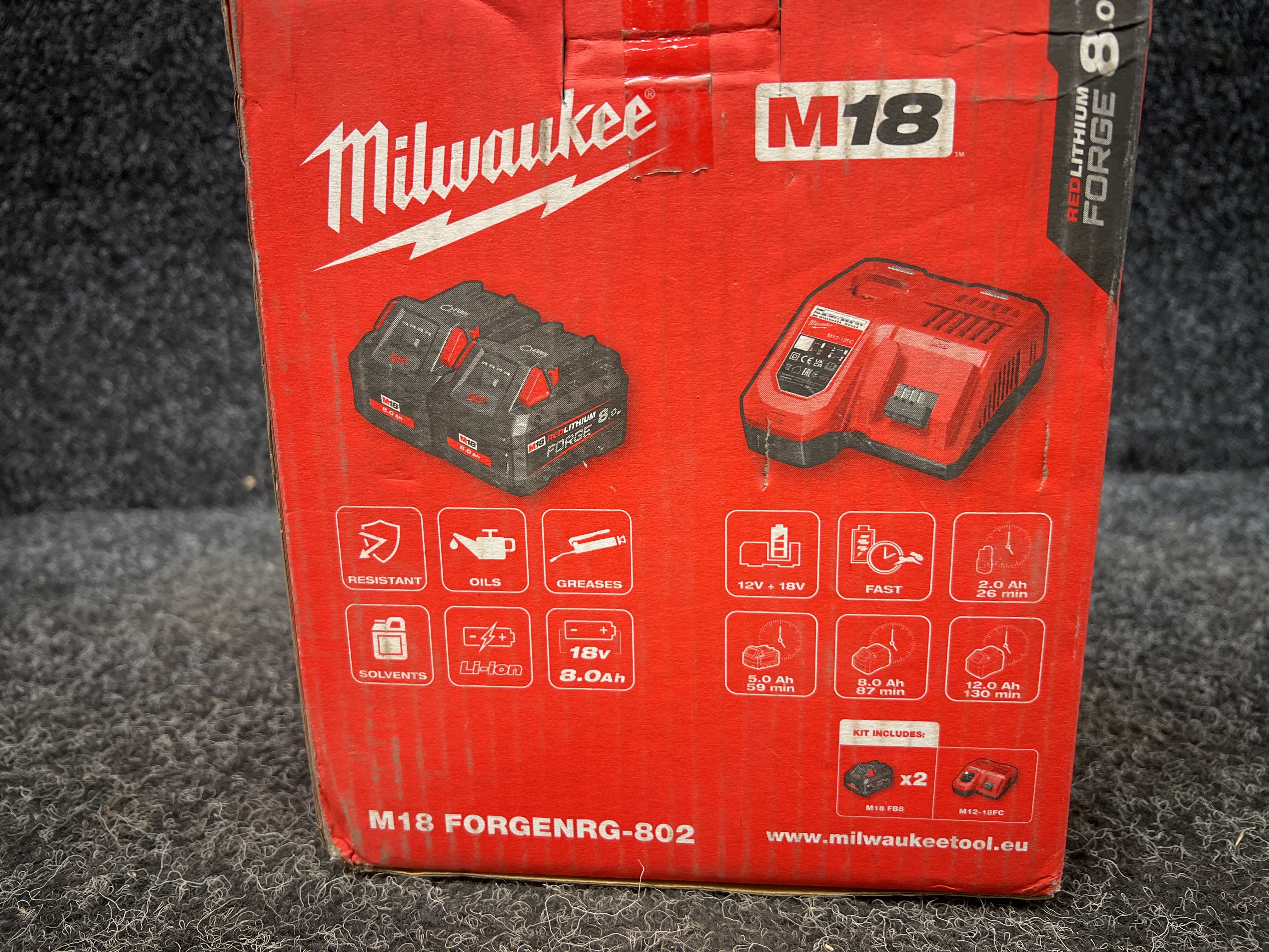 Charging pack containing 2 x M18 FB8 FORGE batteries and an M12-18FC rapid charger (87 min.). Compatible with all M18 tools.