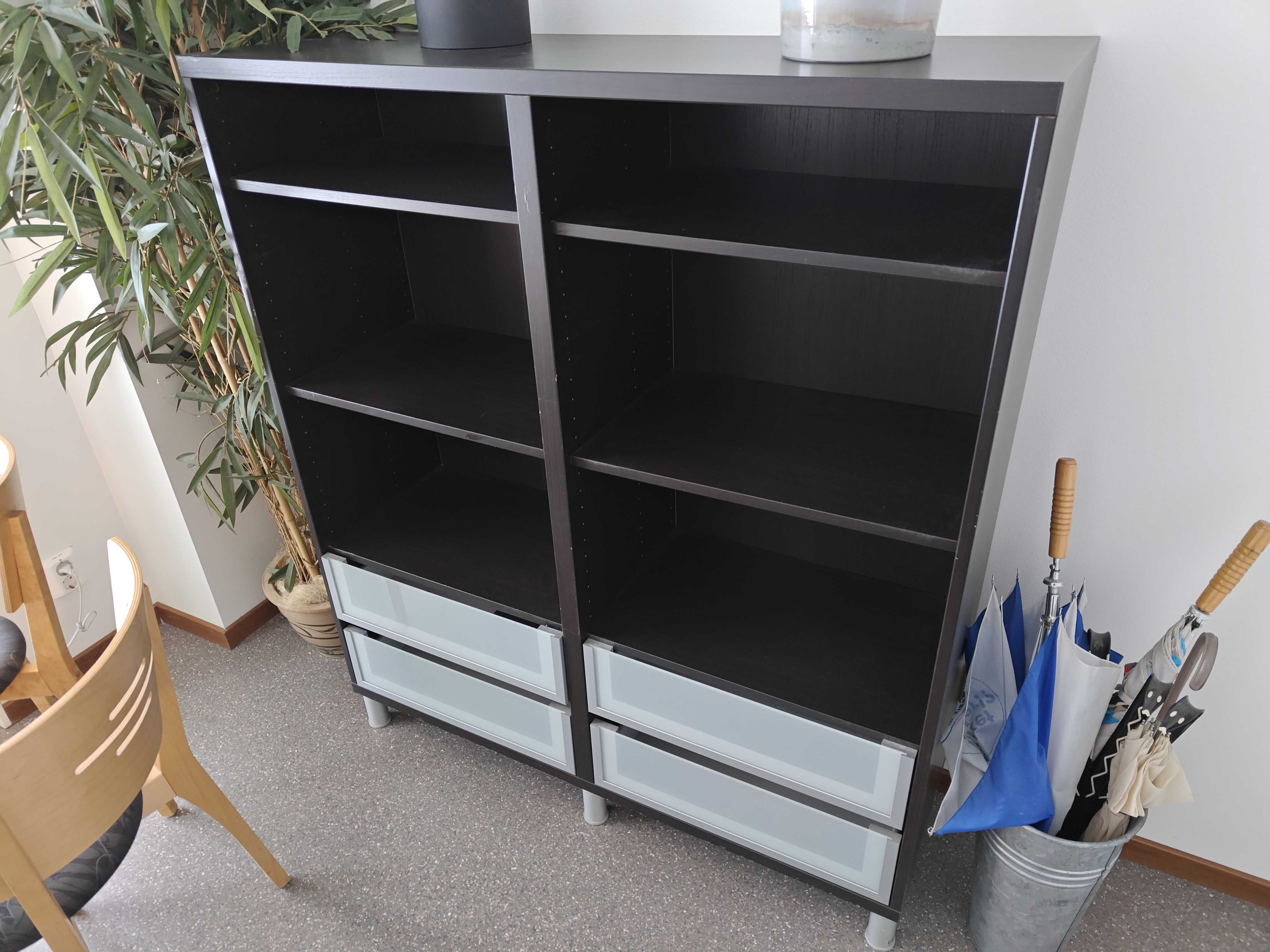 Dark bookcase with glass drawers at the bottom, height 138cm.