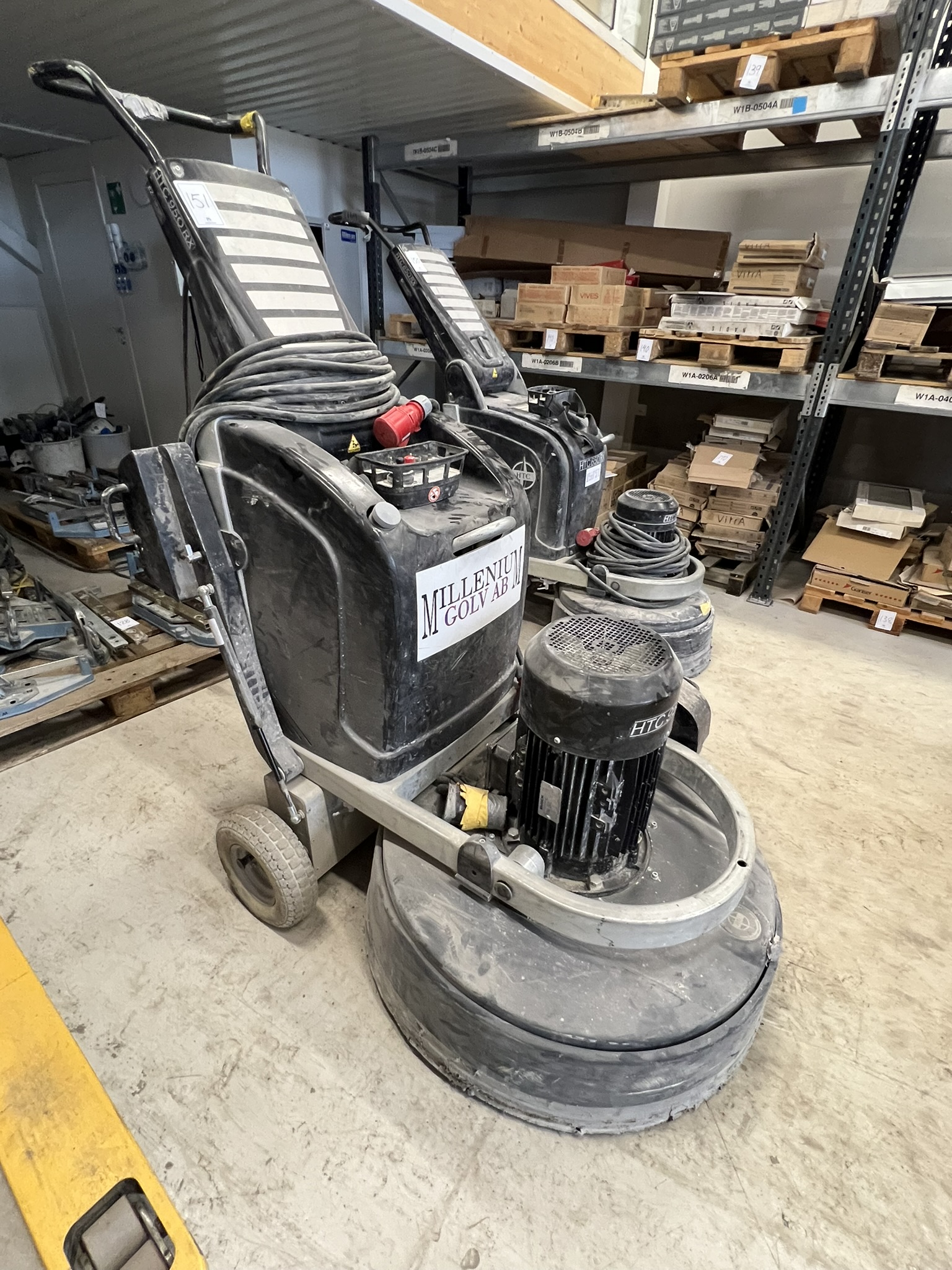 The auction includes cars, concrete grinders, tools, plastic mats, tiles, and much more.