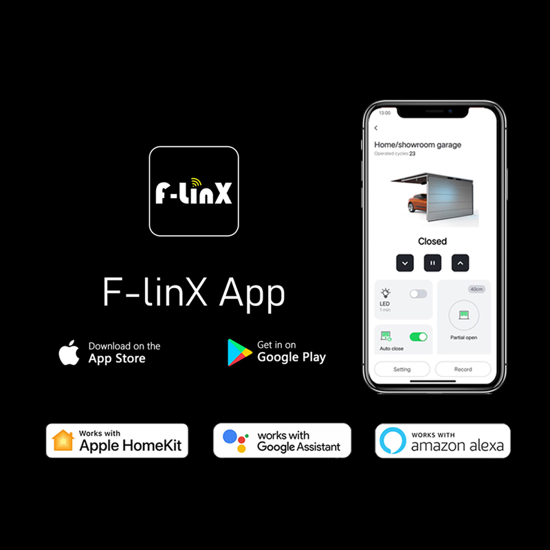 - Garage motor opener with built-in WiFi module to enable control and operation with the F-LinX App available for download in the Apple App Store and Google Play