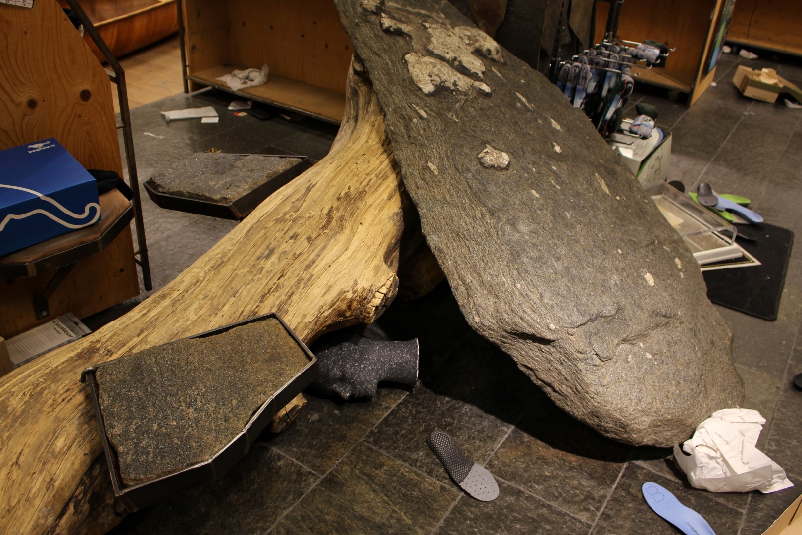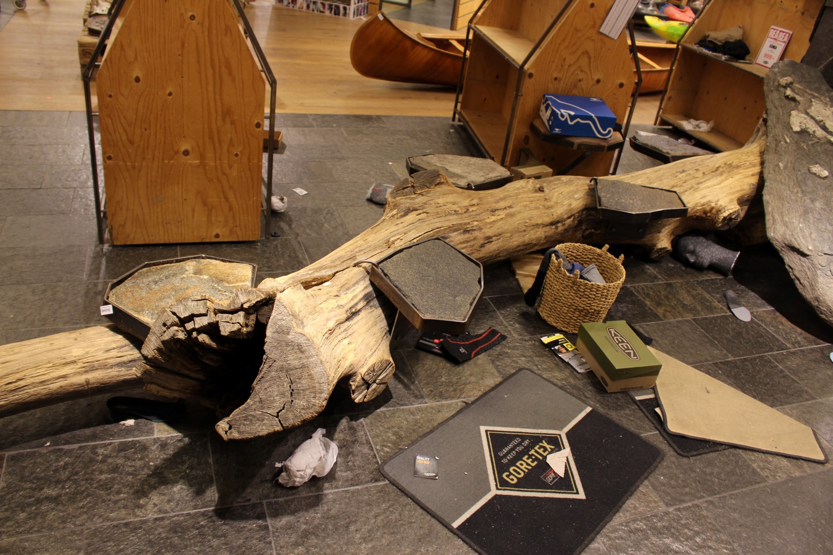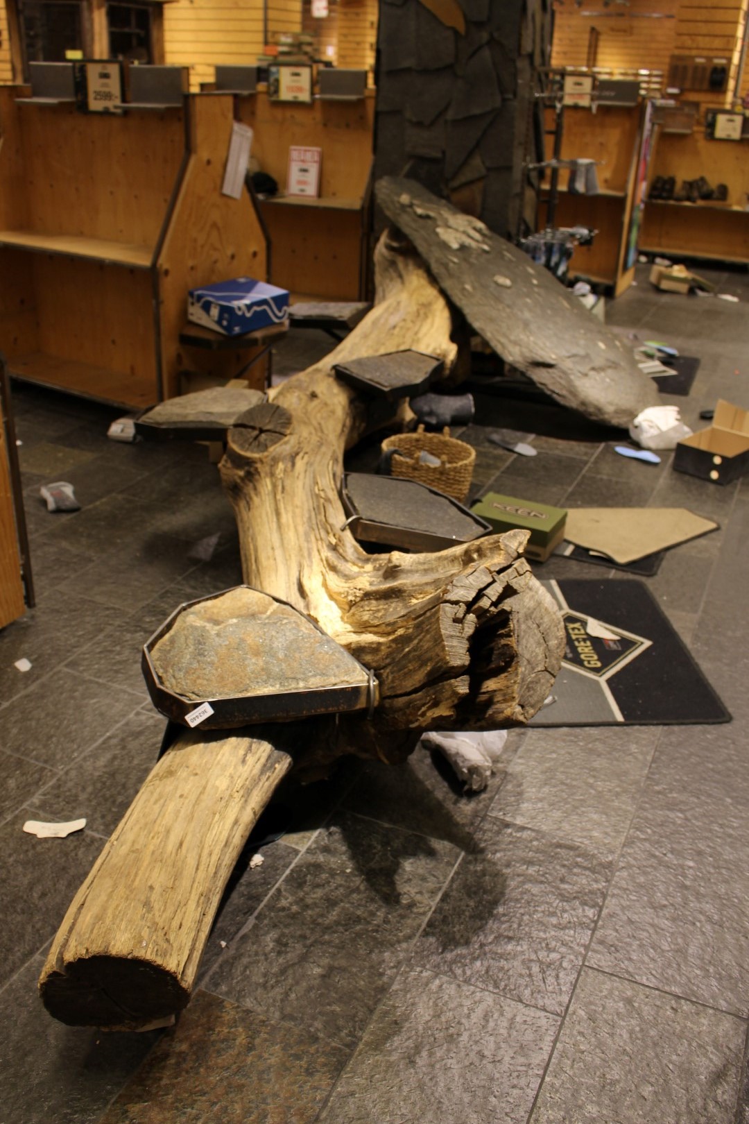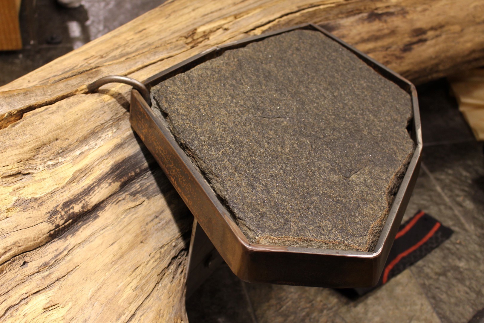 Trästam med 5 sittplatser och stor sten.