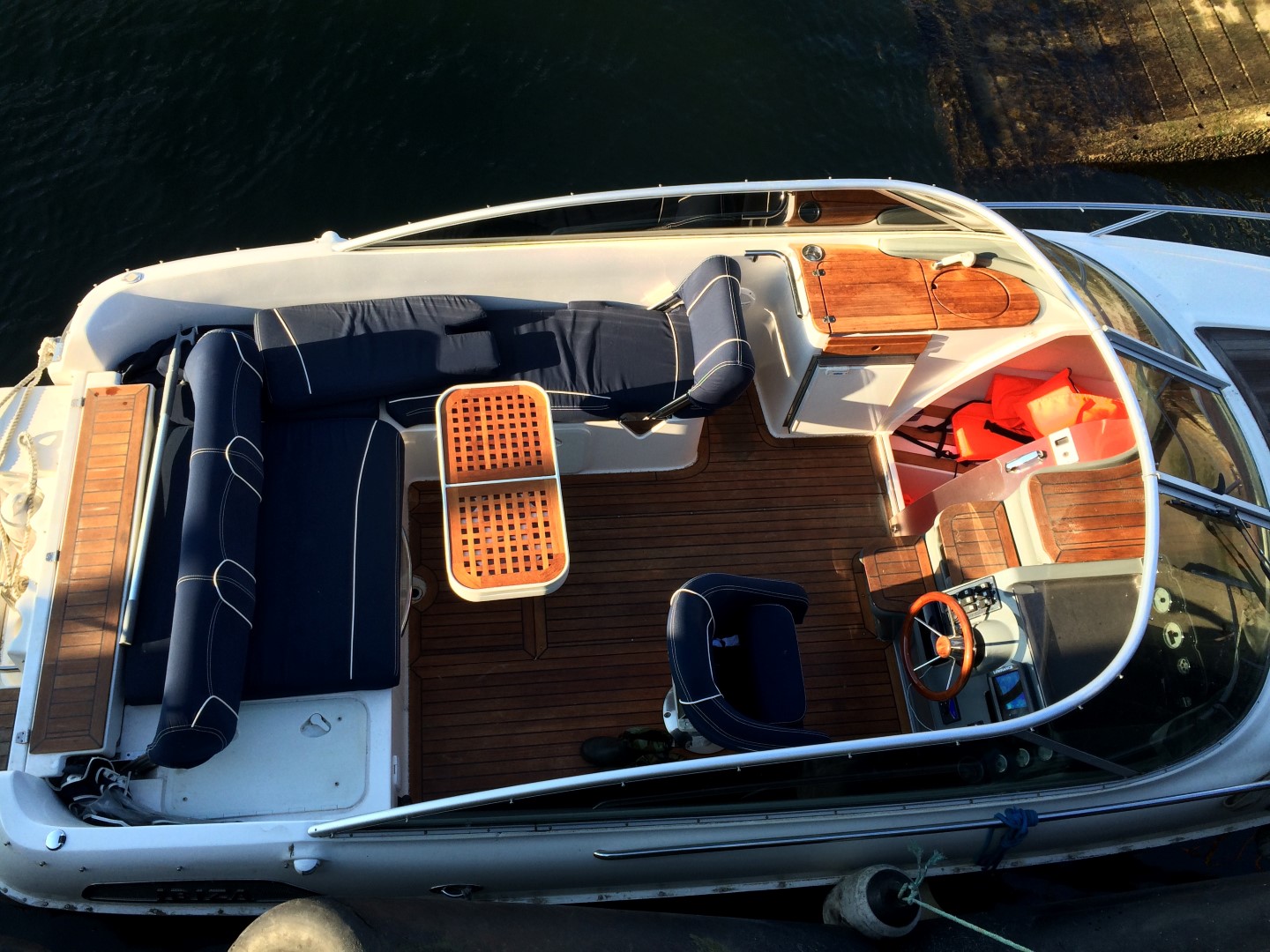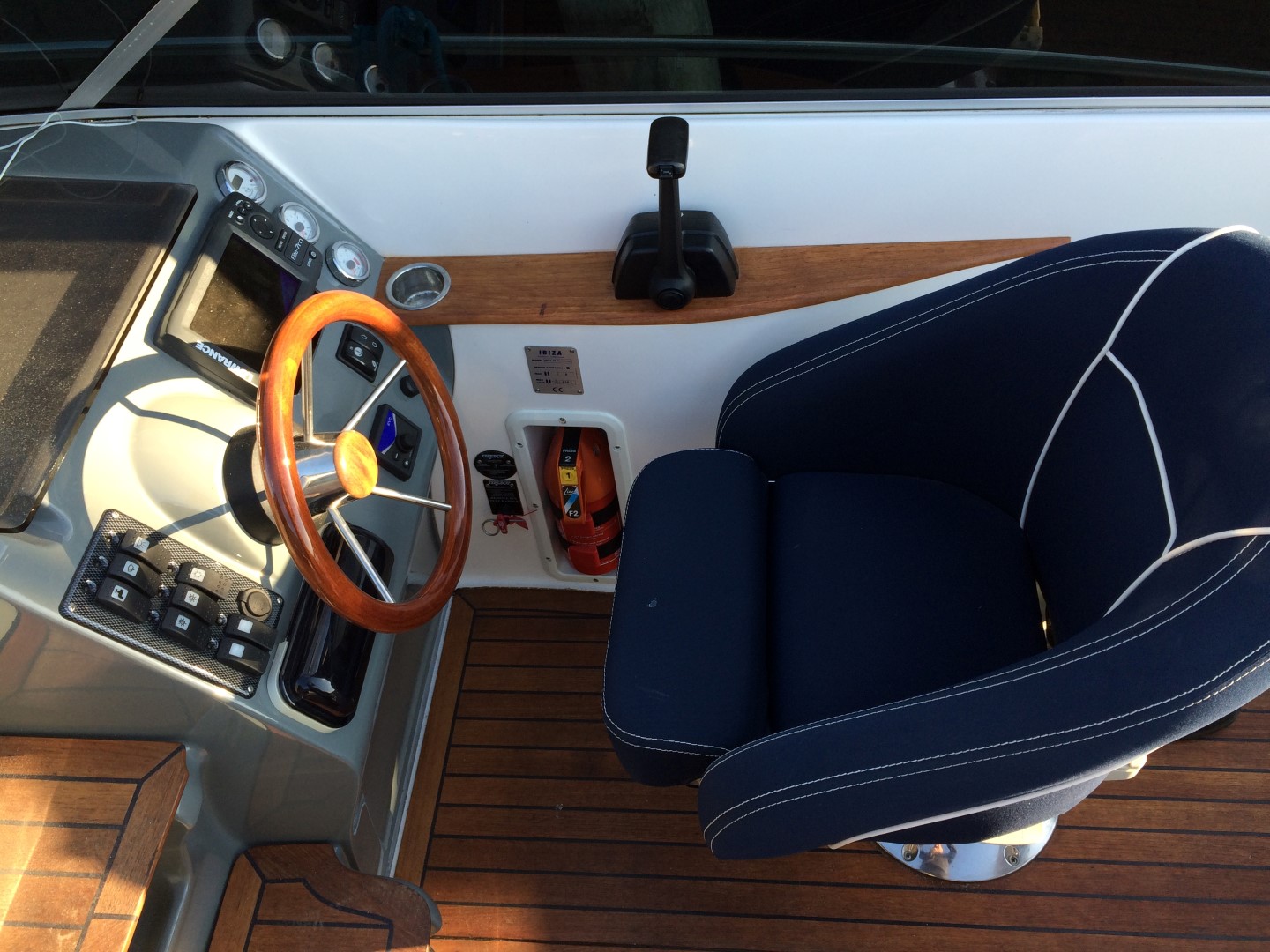 car stereo (CD, MP3), stainless steel rails, bilge pump, shower, navigation lights, Plotter Lowrance, CD / radio, 8 speakers, Toilet / septic, Teak Package, Hood, Full cover (harbor,) Full cover (driving), Upholstery, Swimming Ladder, Manual electric bilge pump, Running water tank 40ltr, Fridge / Freezer ,Fire extinguisher, Teak Table, Fixed fuel tank 190ltr, Fender