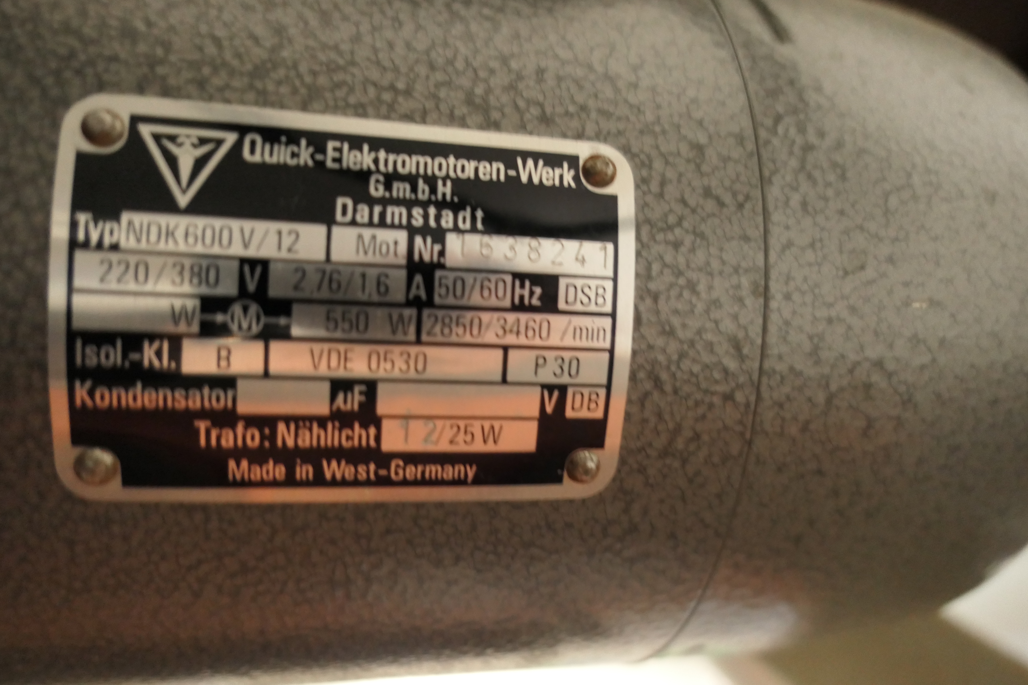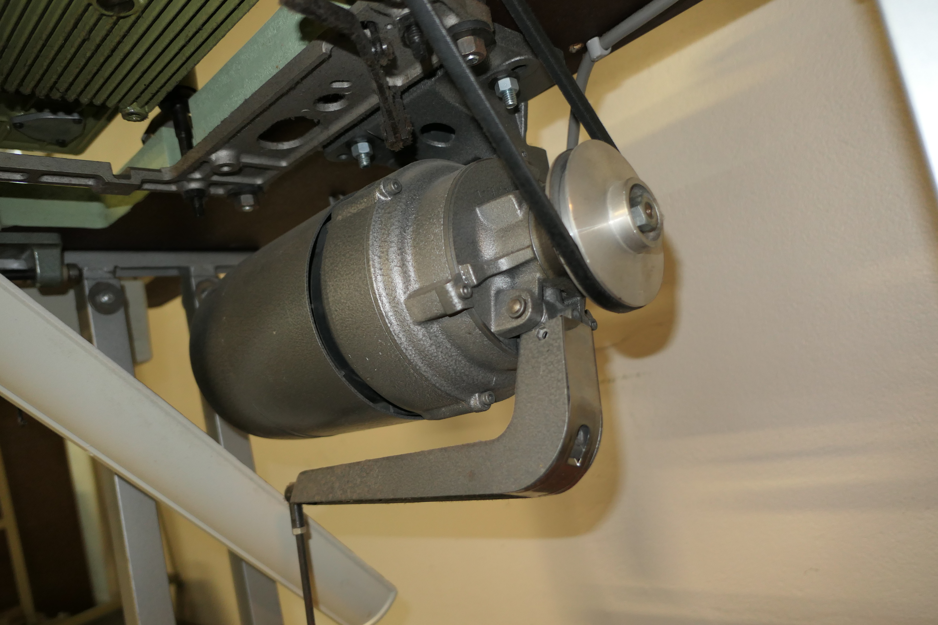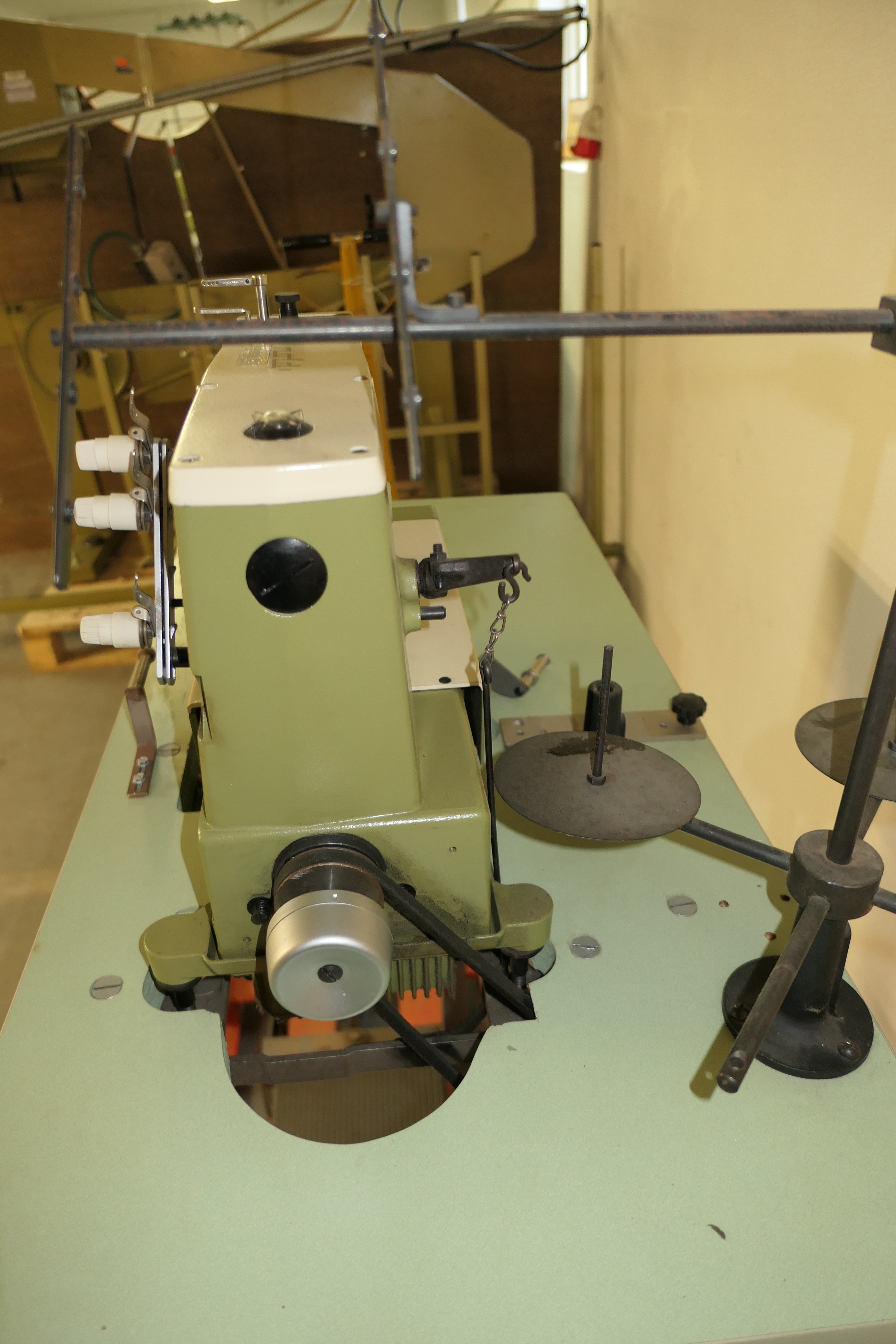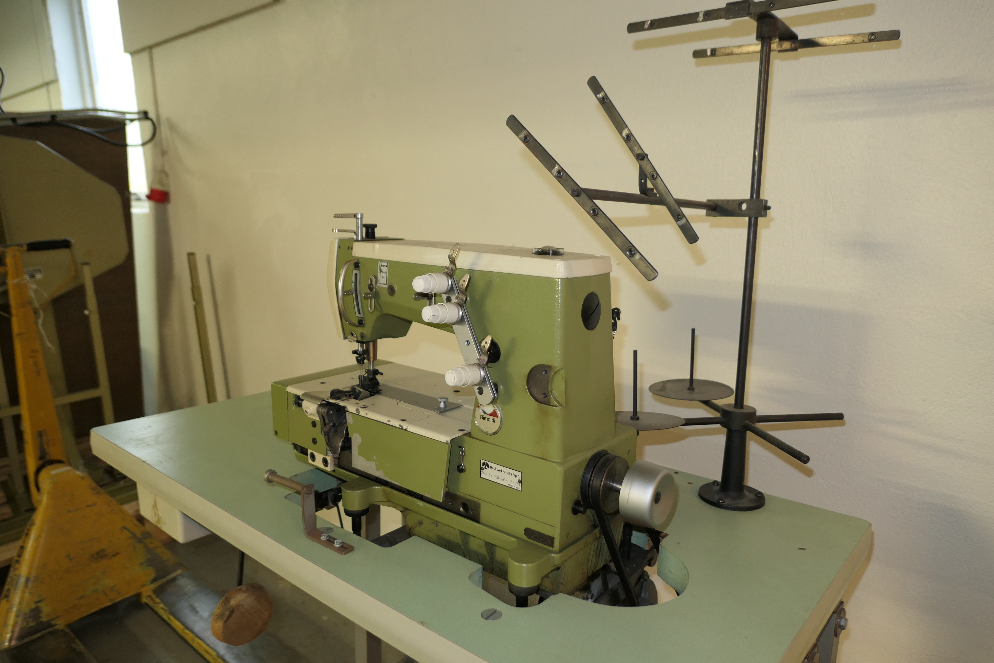 Industrial sewing machine with bench and various details.