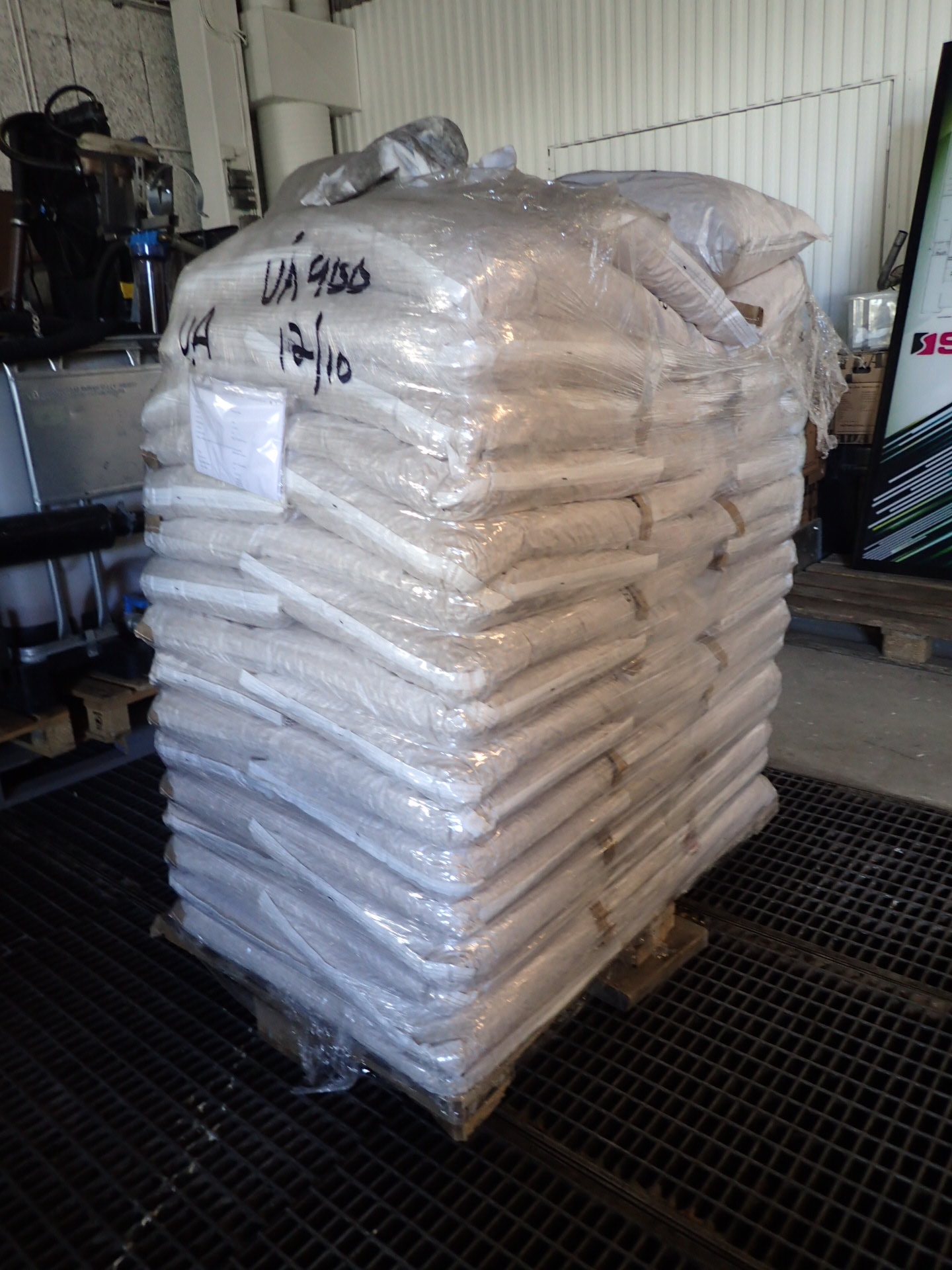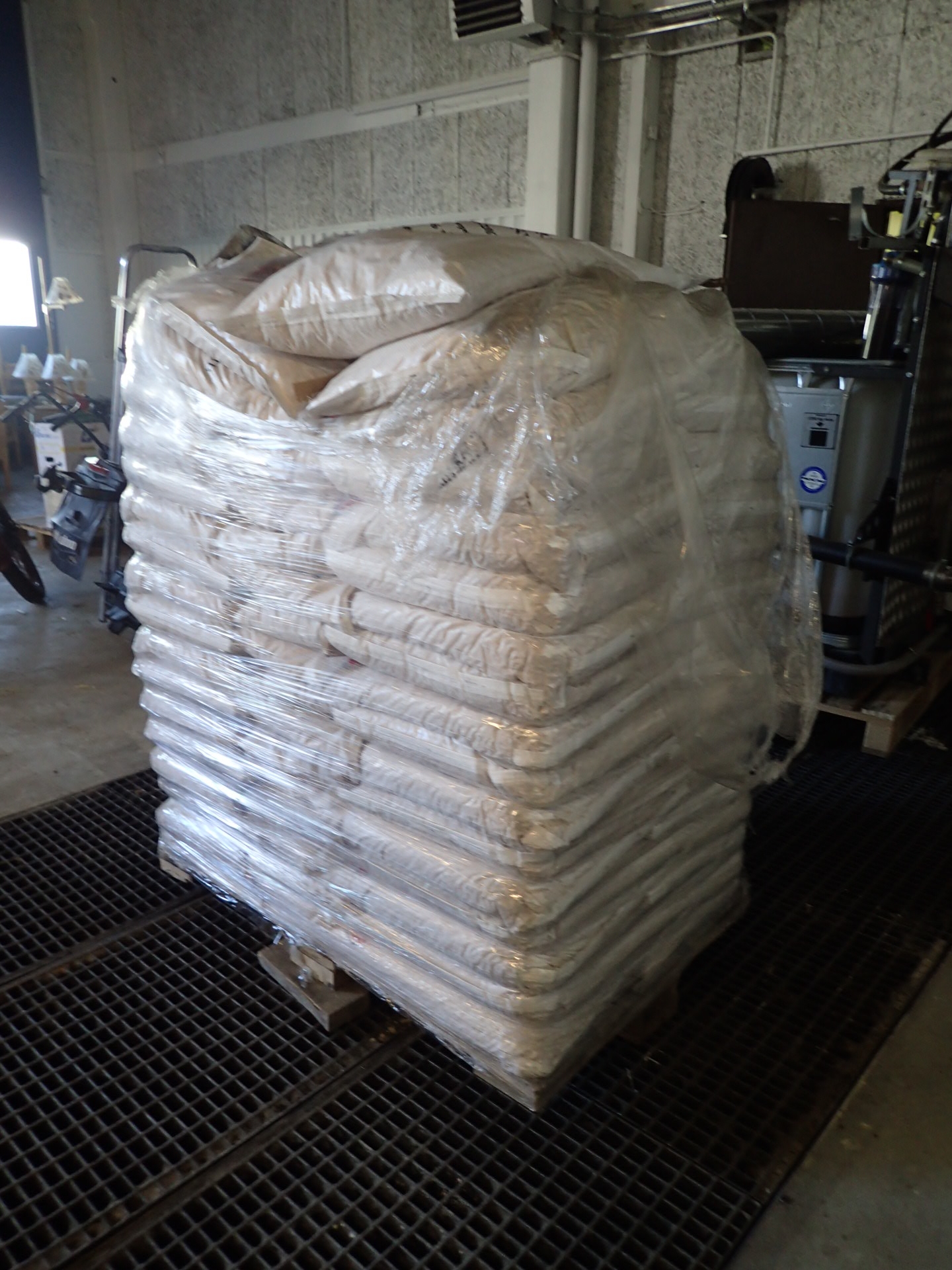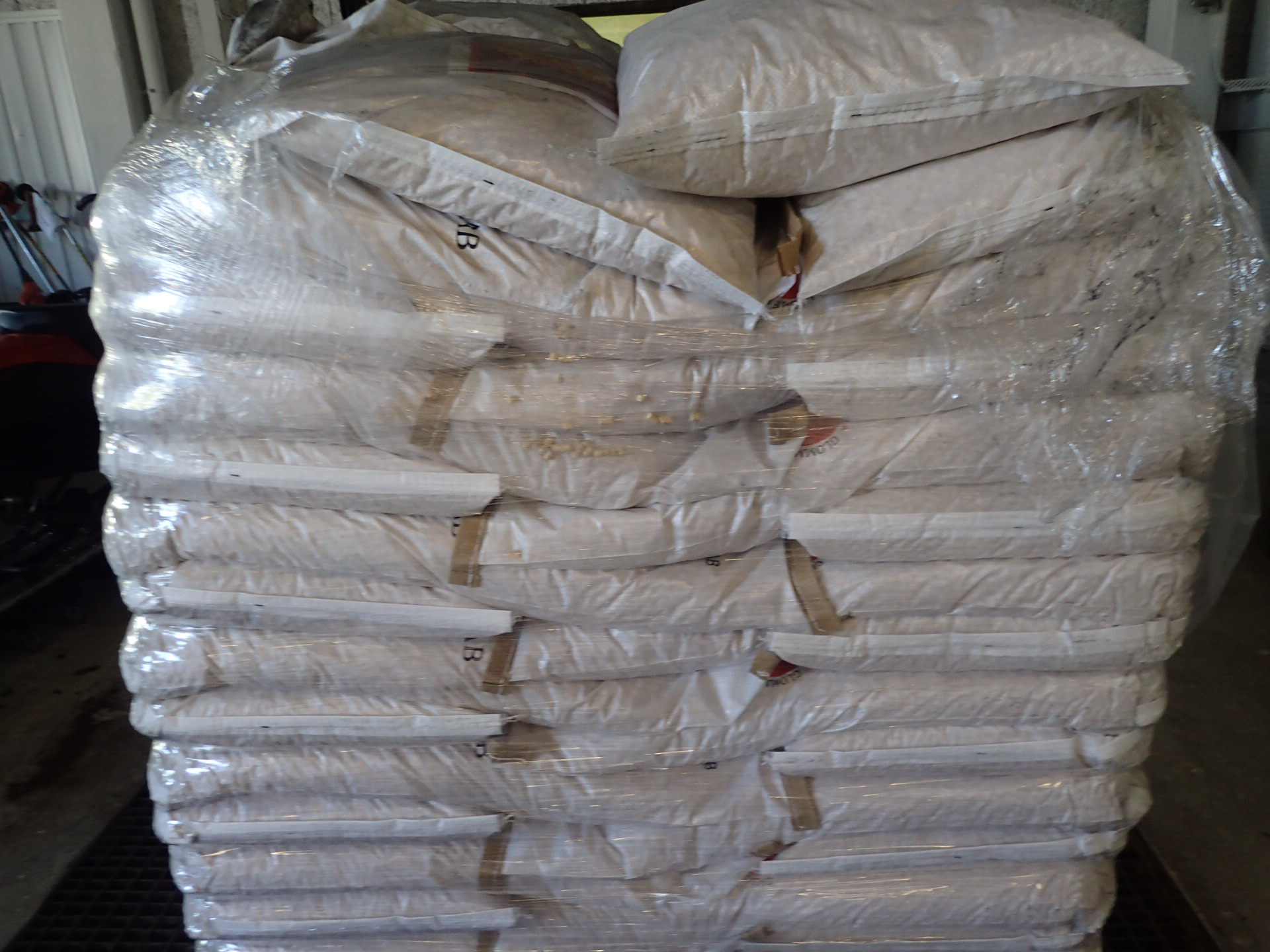 A pallet of about 48 bags of pellets