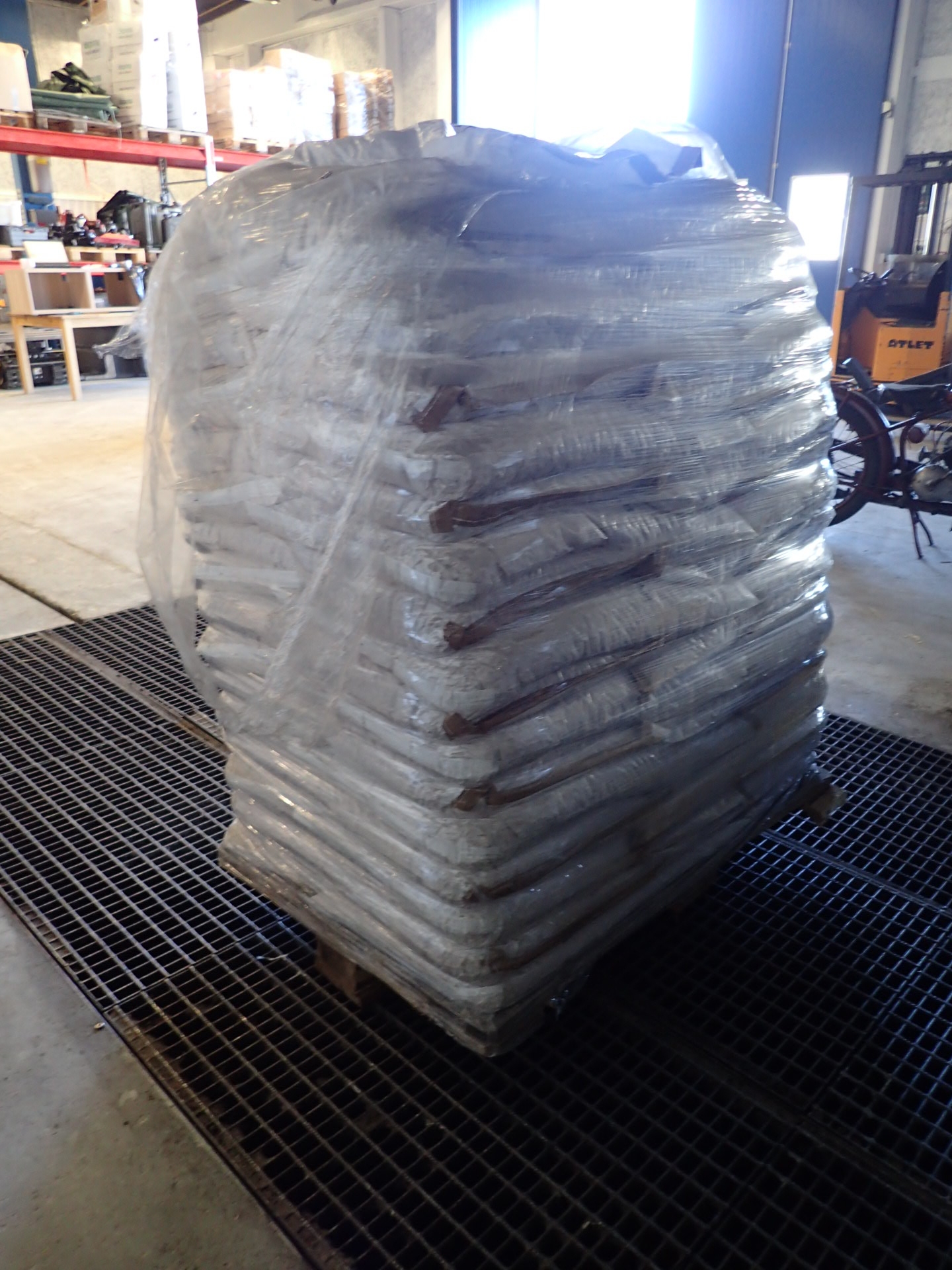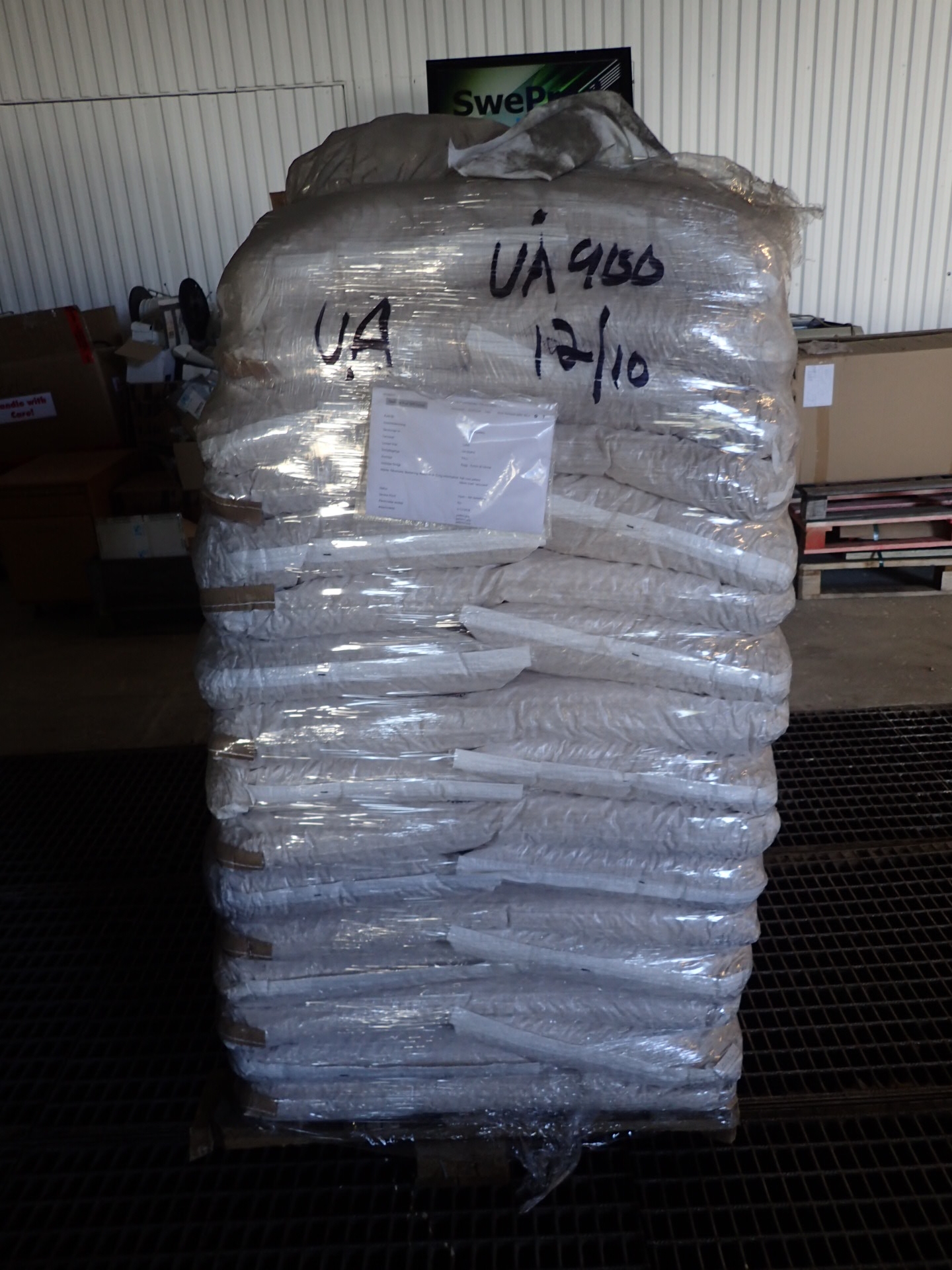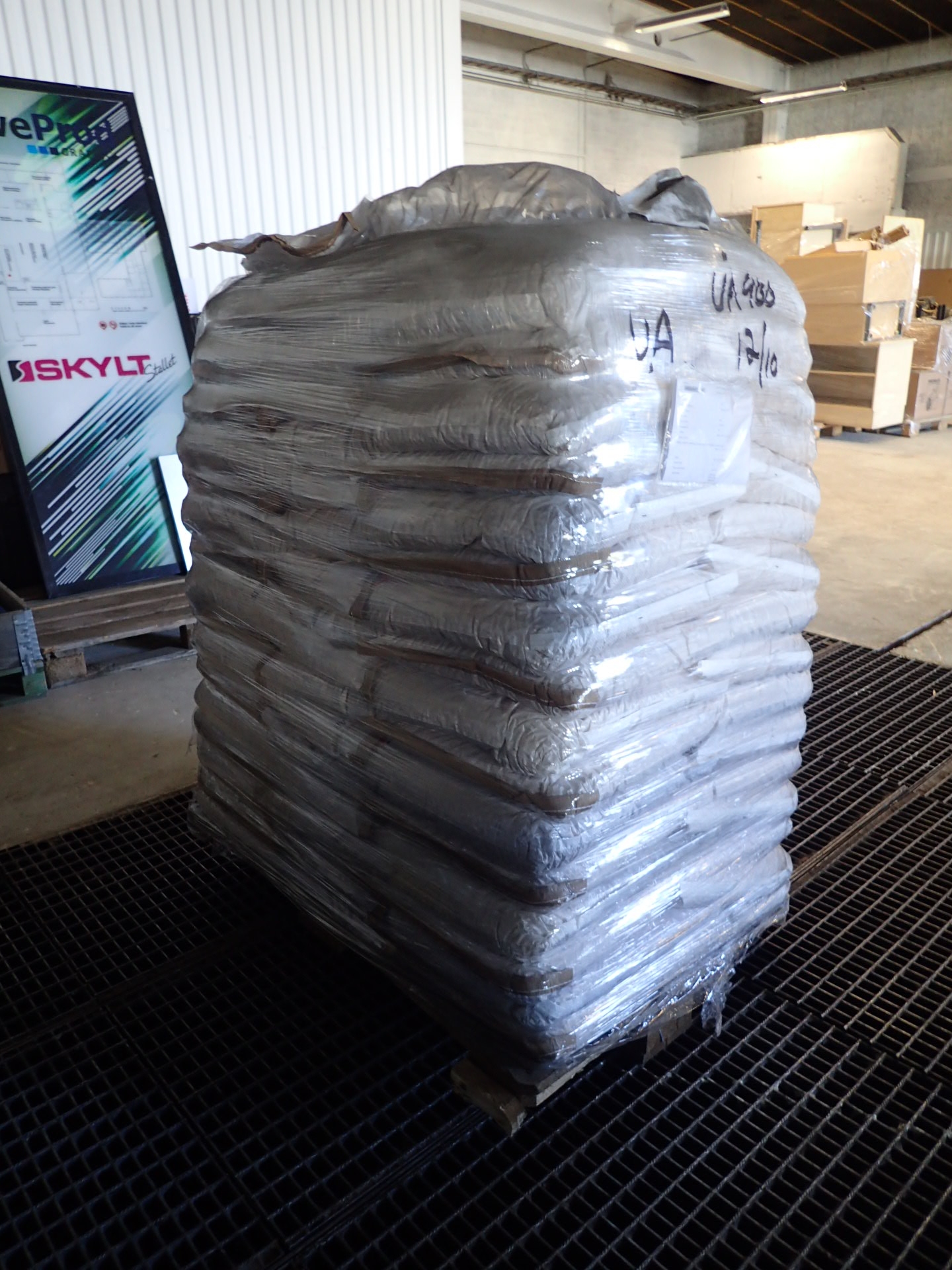 A pallet of about 48 bags of pellets