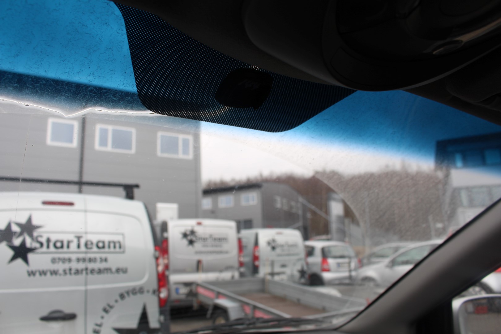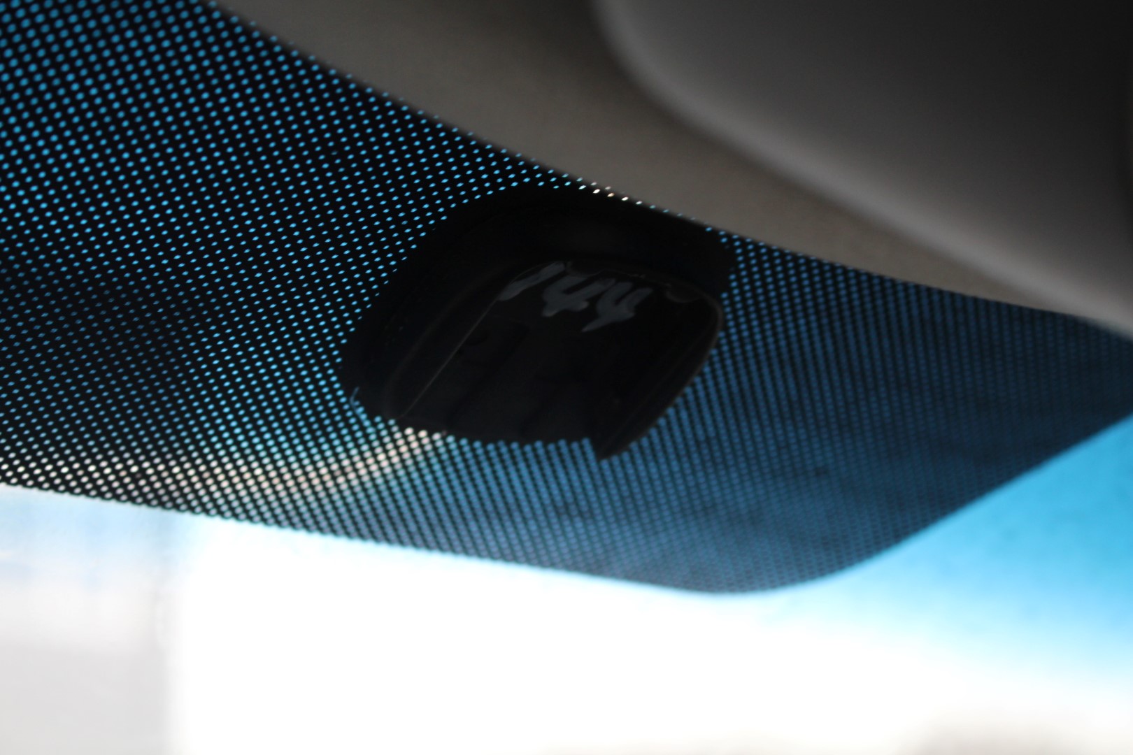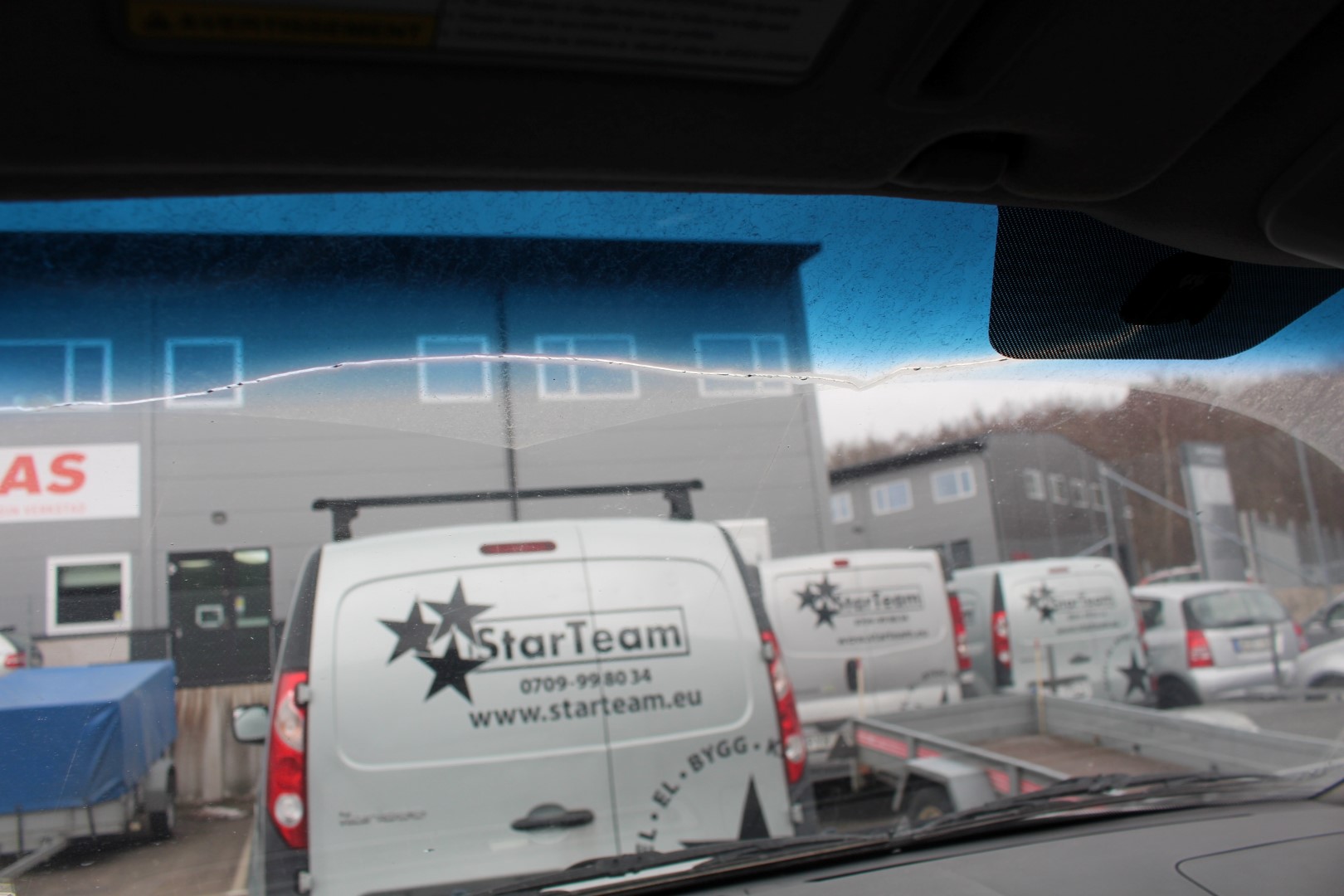 No rearview mirror and a crack at the top of the front window.