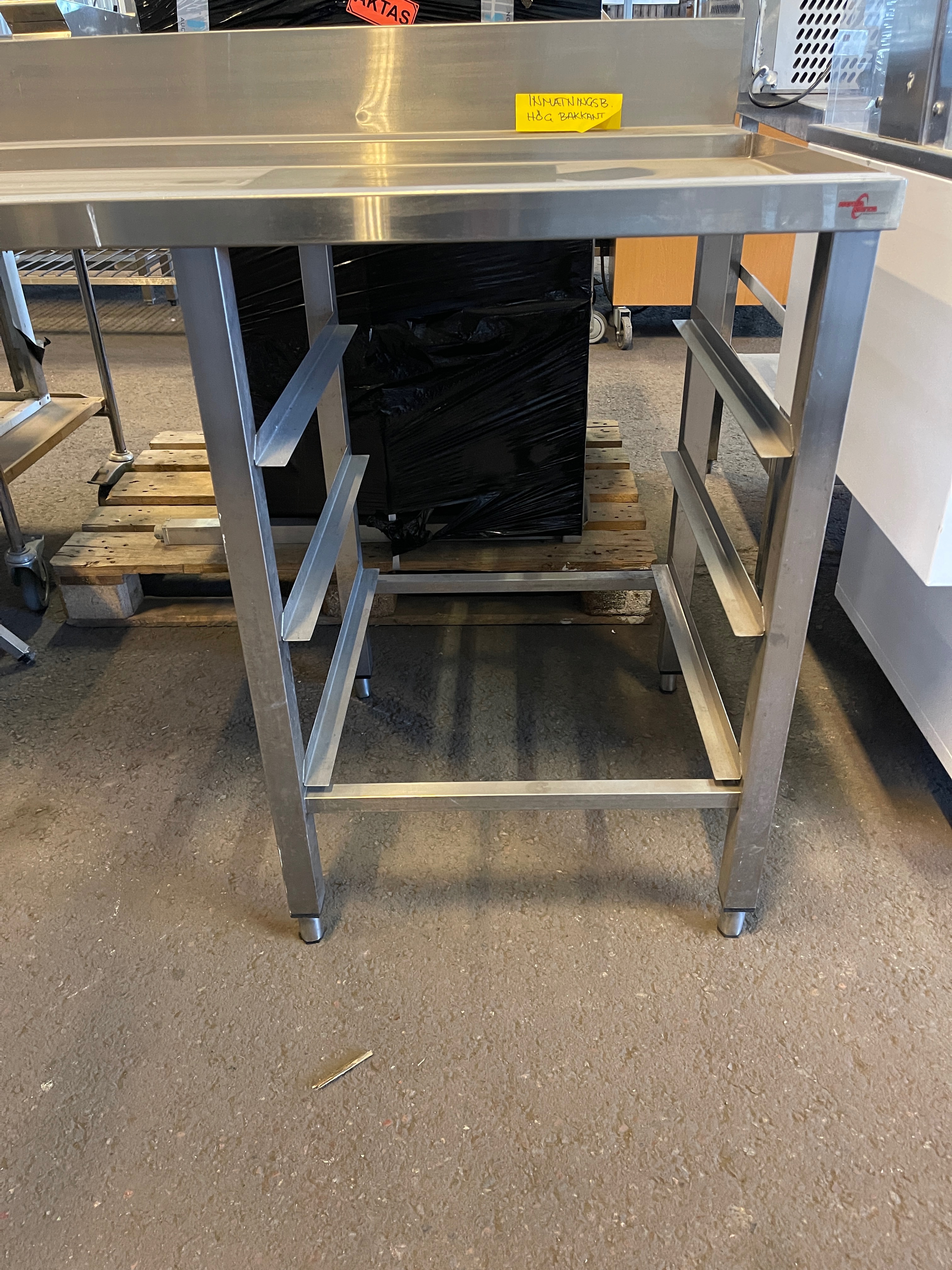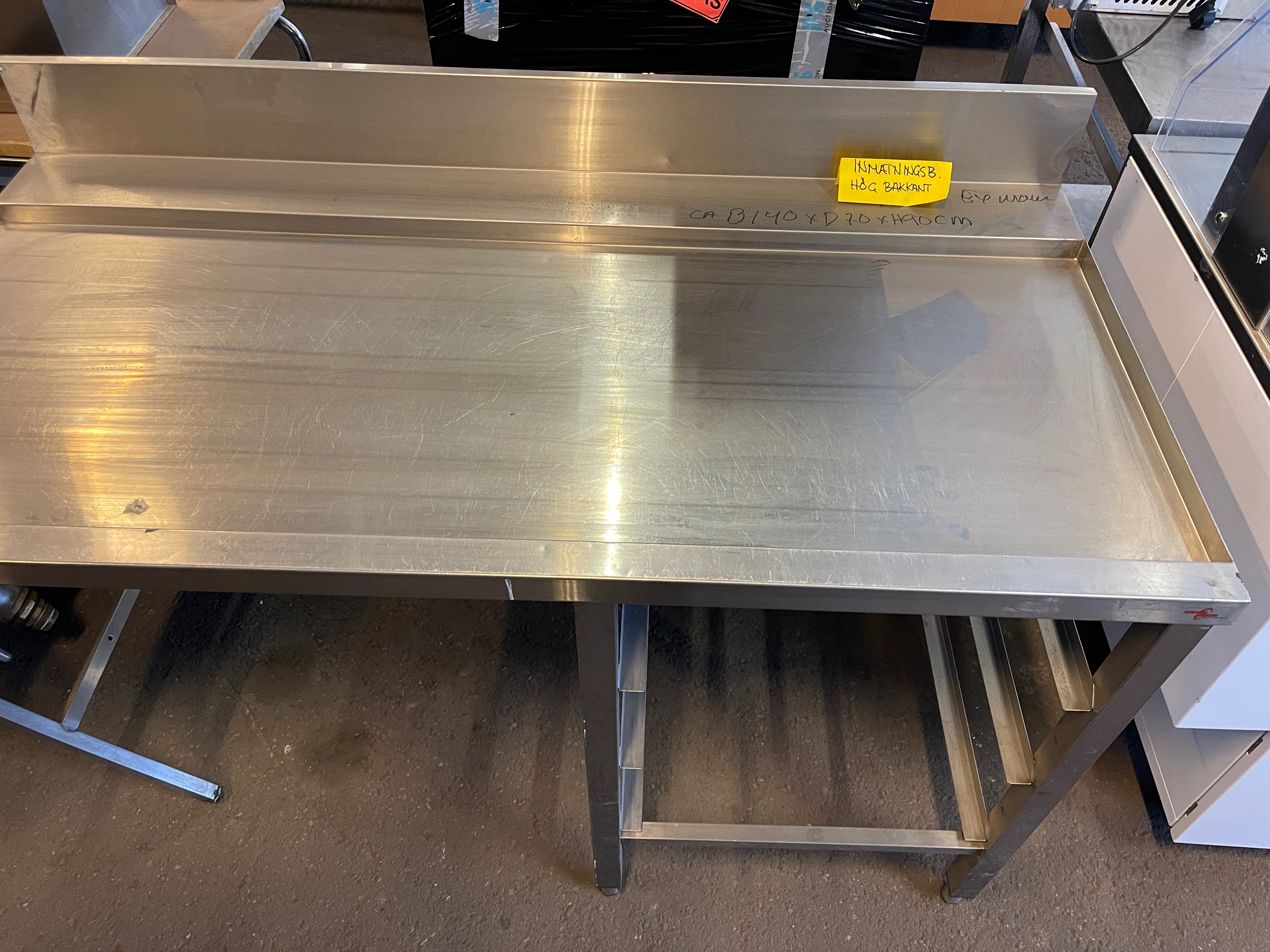 Dispensing bench with guides for dish baskets. About 140x65x90cm