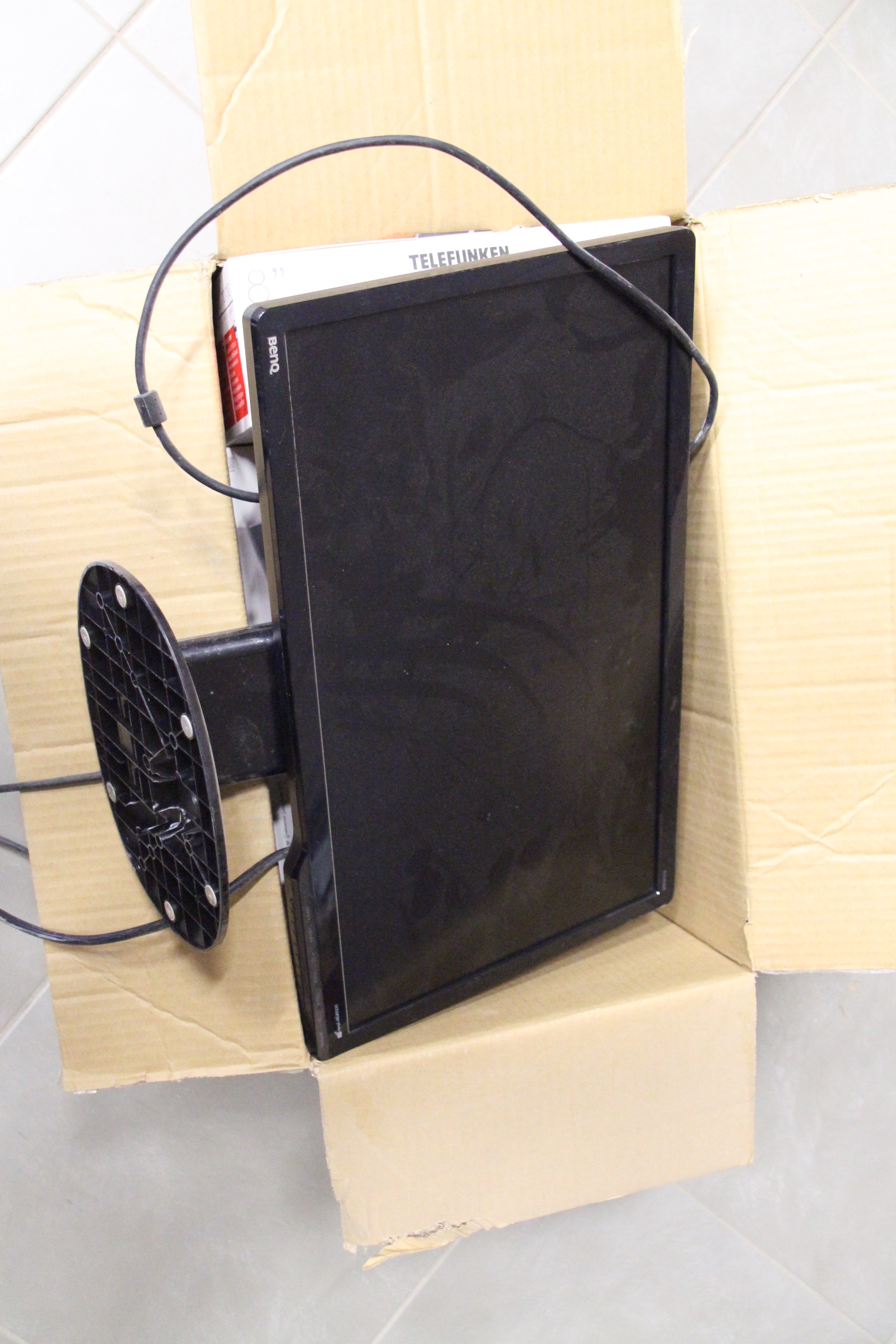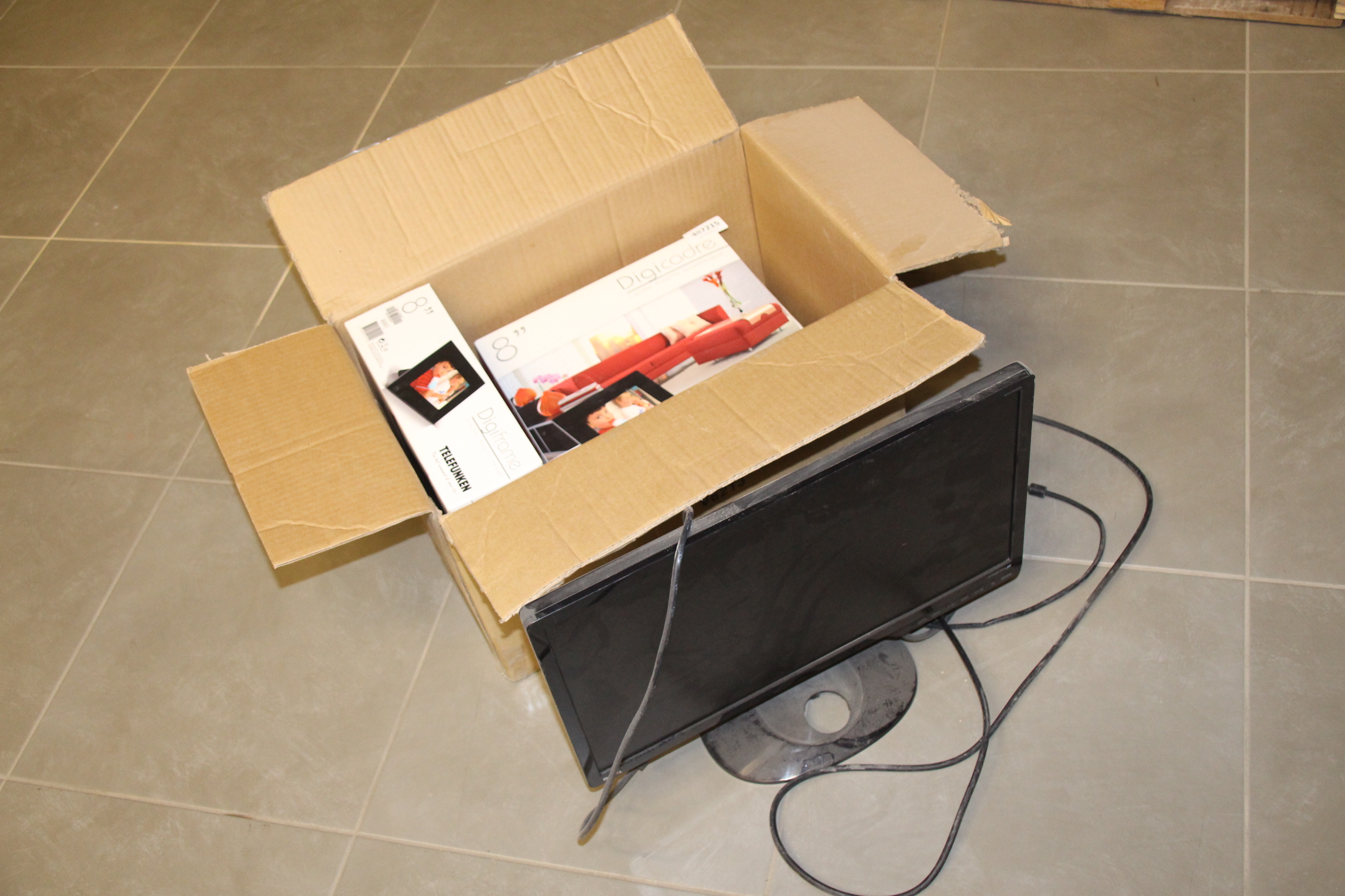 Three Digital Photo Frames, New Telefunken in Original Card, and a 2009 BENQ LCD Monitor.