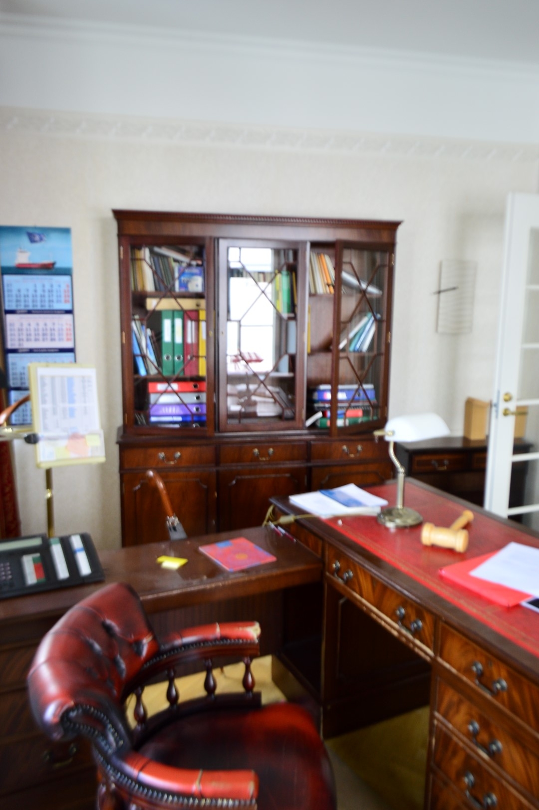Antique workdesk with chair + Showcase cabinet + Suit stand rack – used!