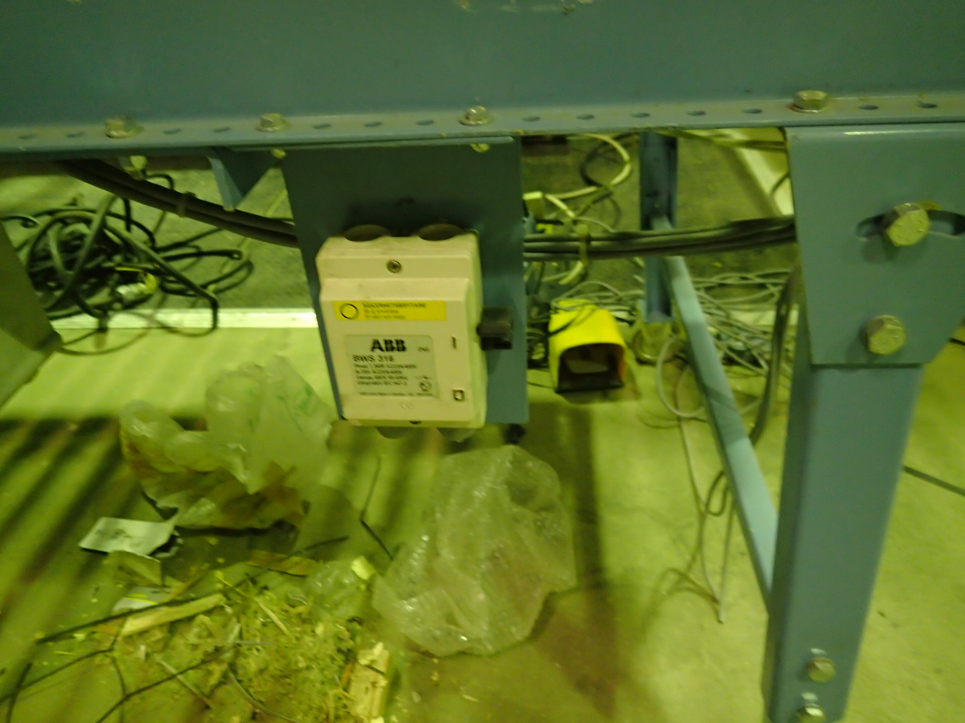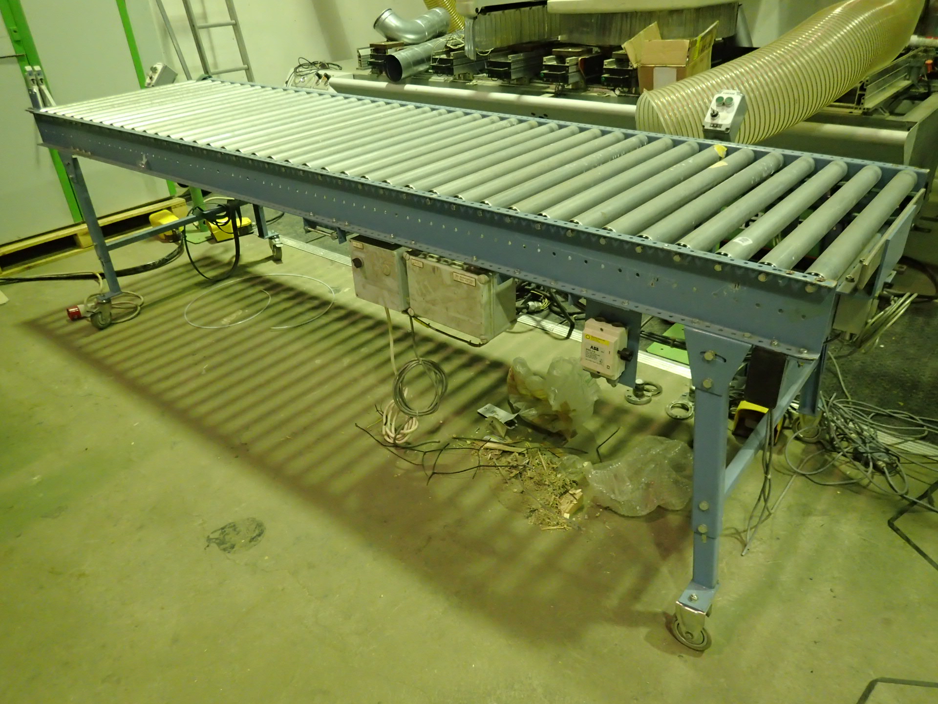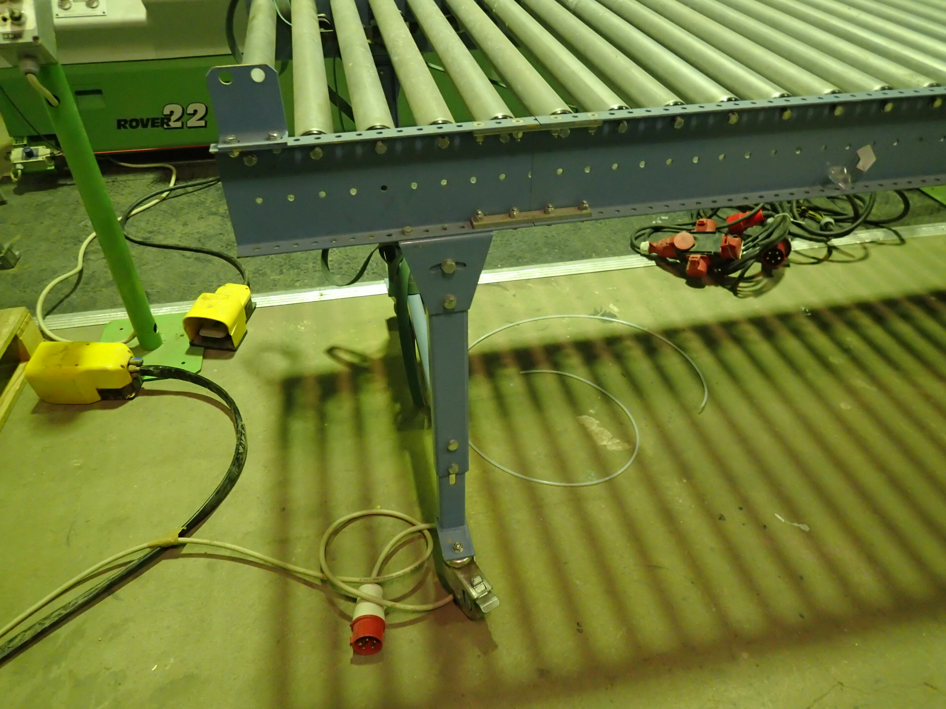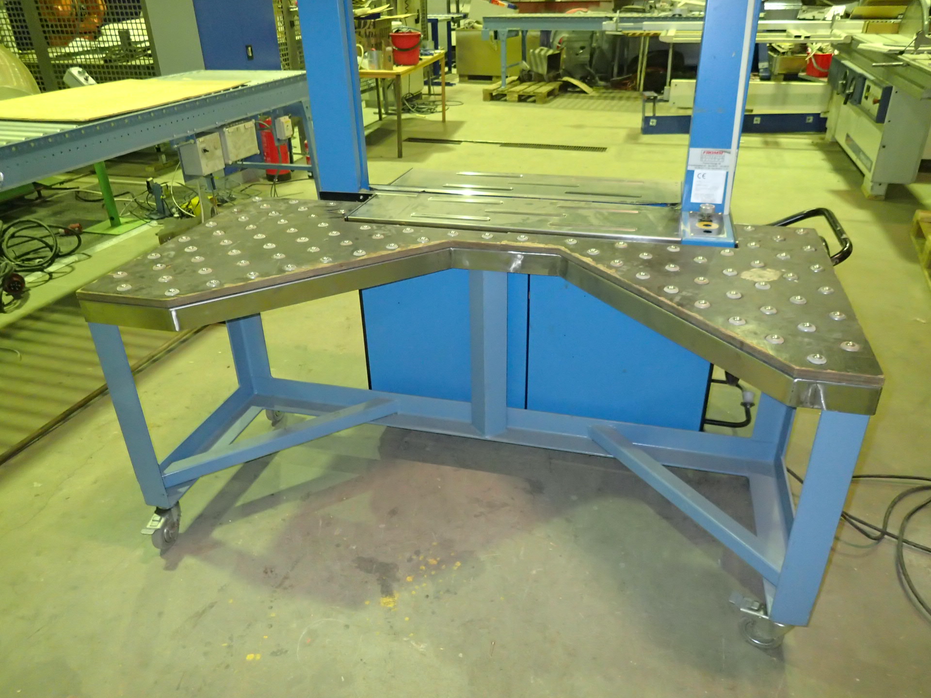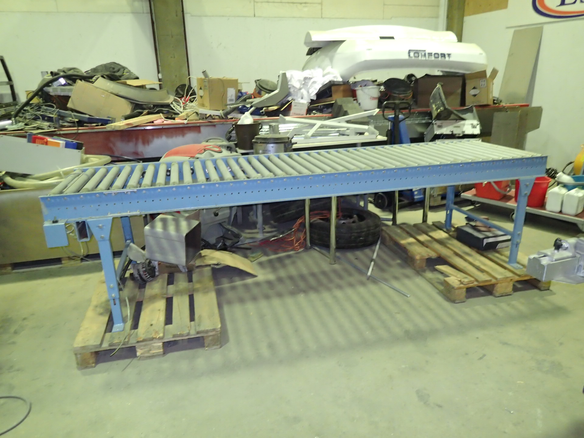 A plastic strapping machine with ball table and conveyor belt, one of which is motor-driven.