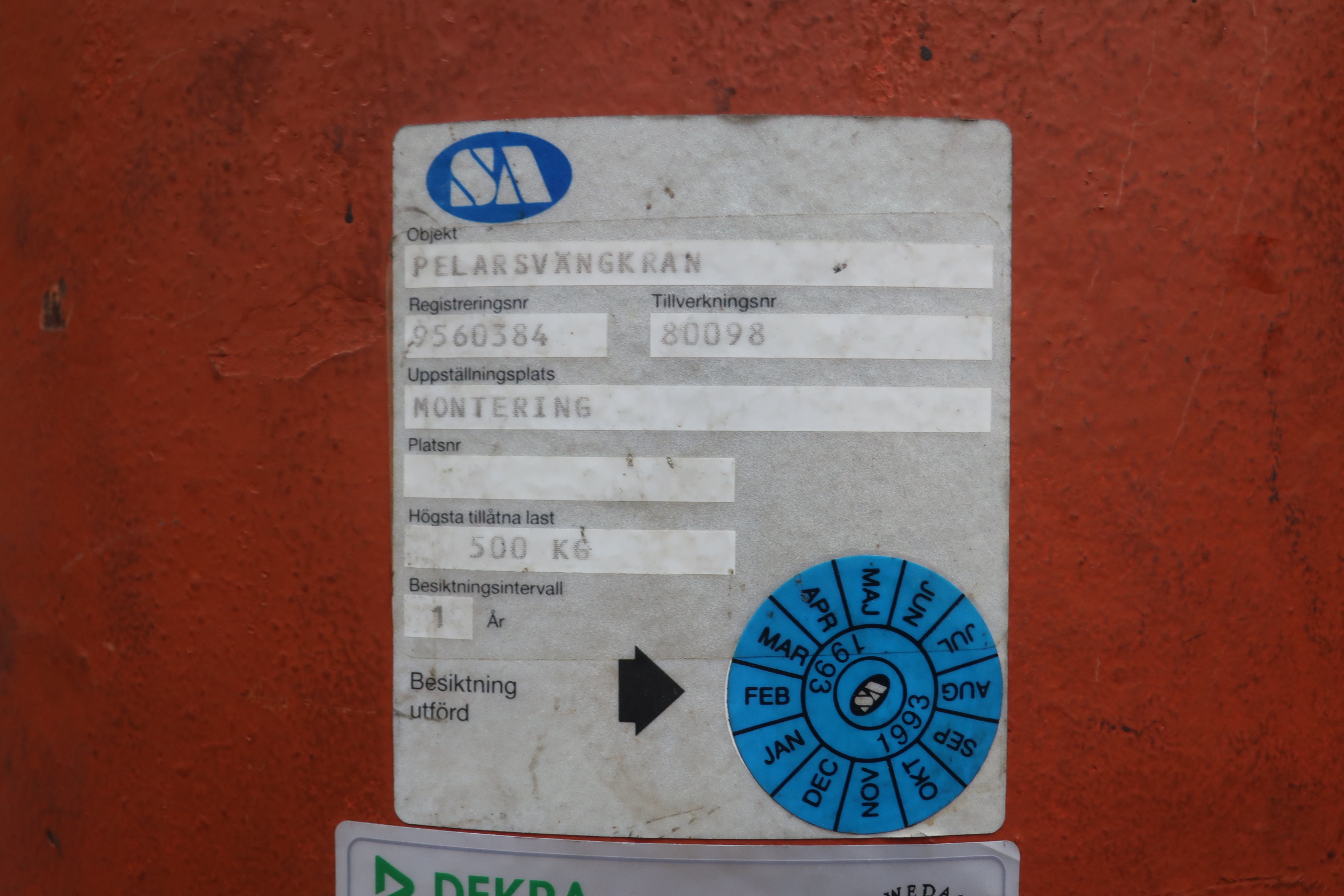 Pillar swing crane with chain hoist from DEMAG, 500kg.