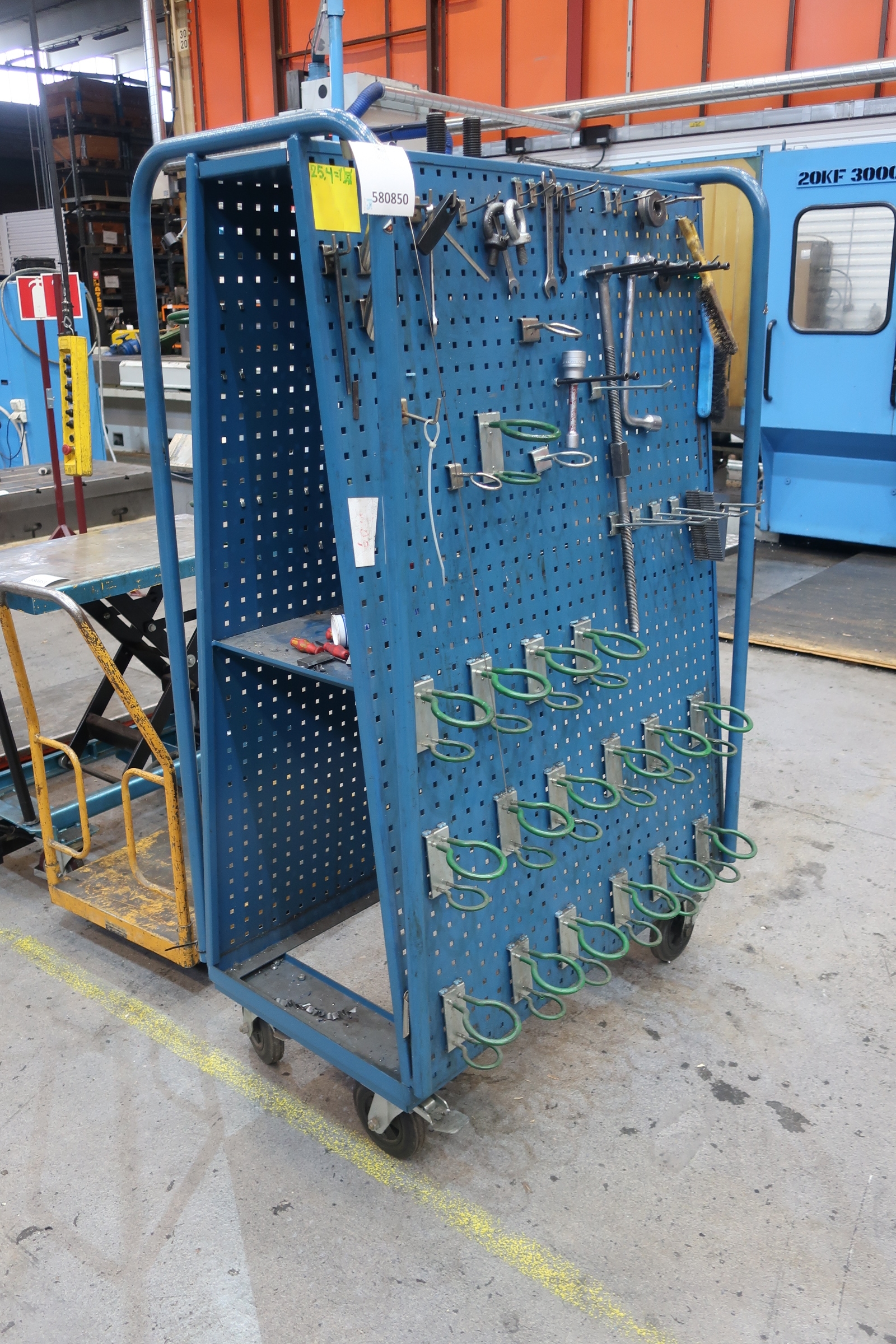 Cart on wheels with tool board on both sides and shelves in between.