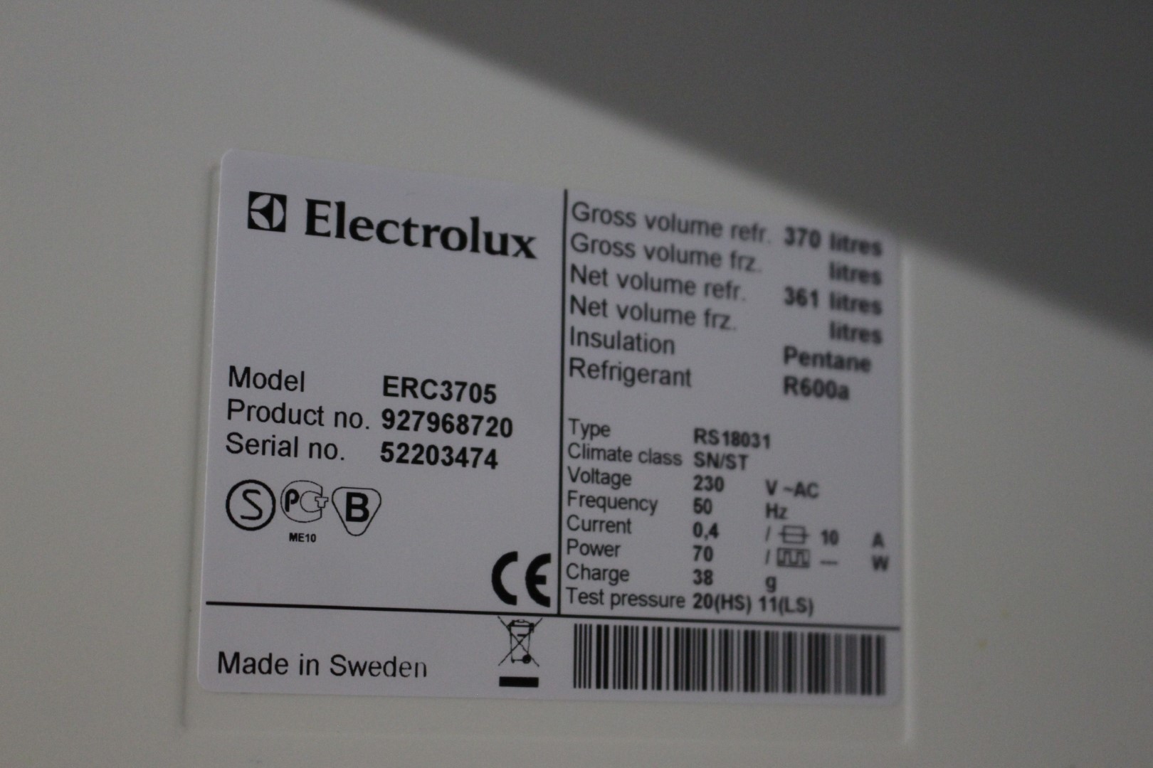 Refrigerator from Electrolux model, ERC3705. about 60 x 180 cm.