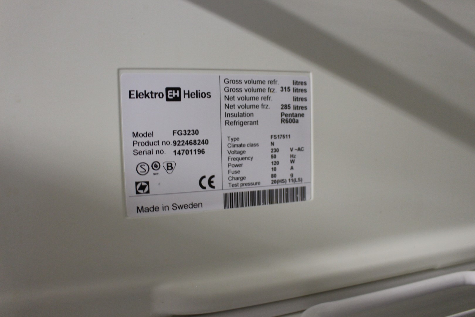 Freezer from Elektro Helios, model FG3230. about 60 x 174 cm.