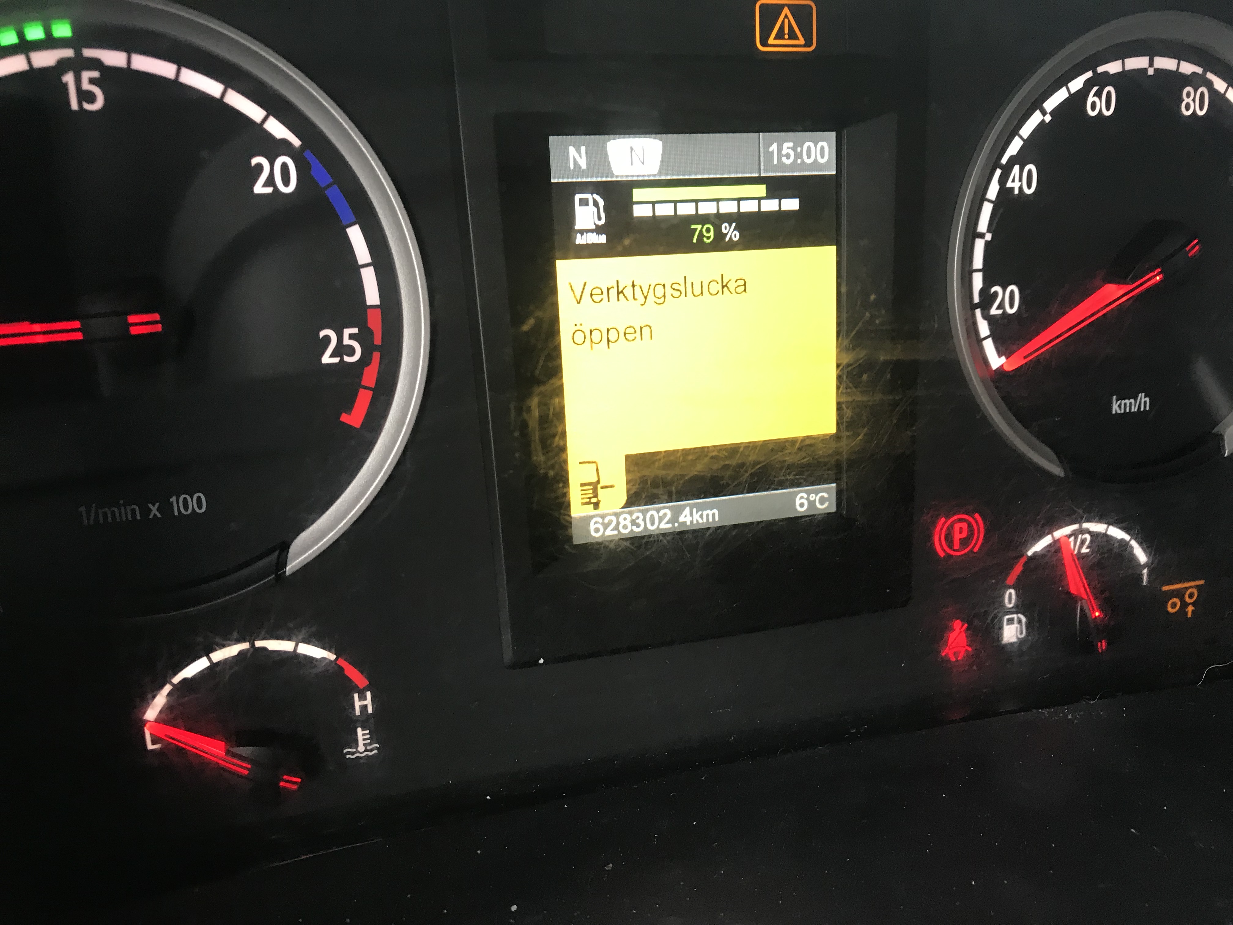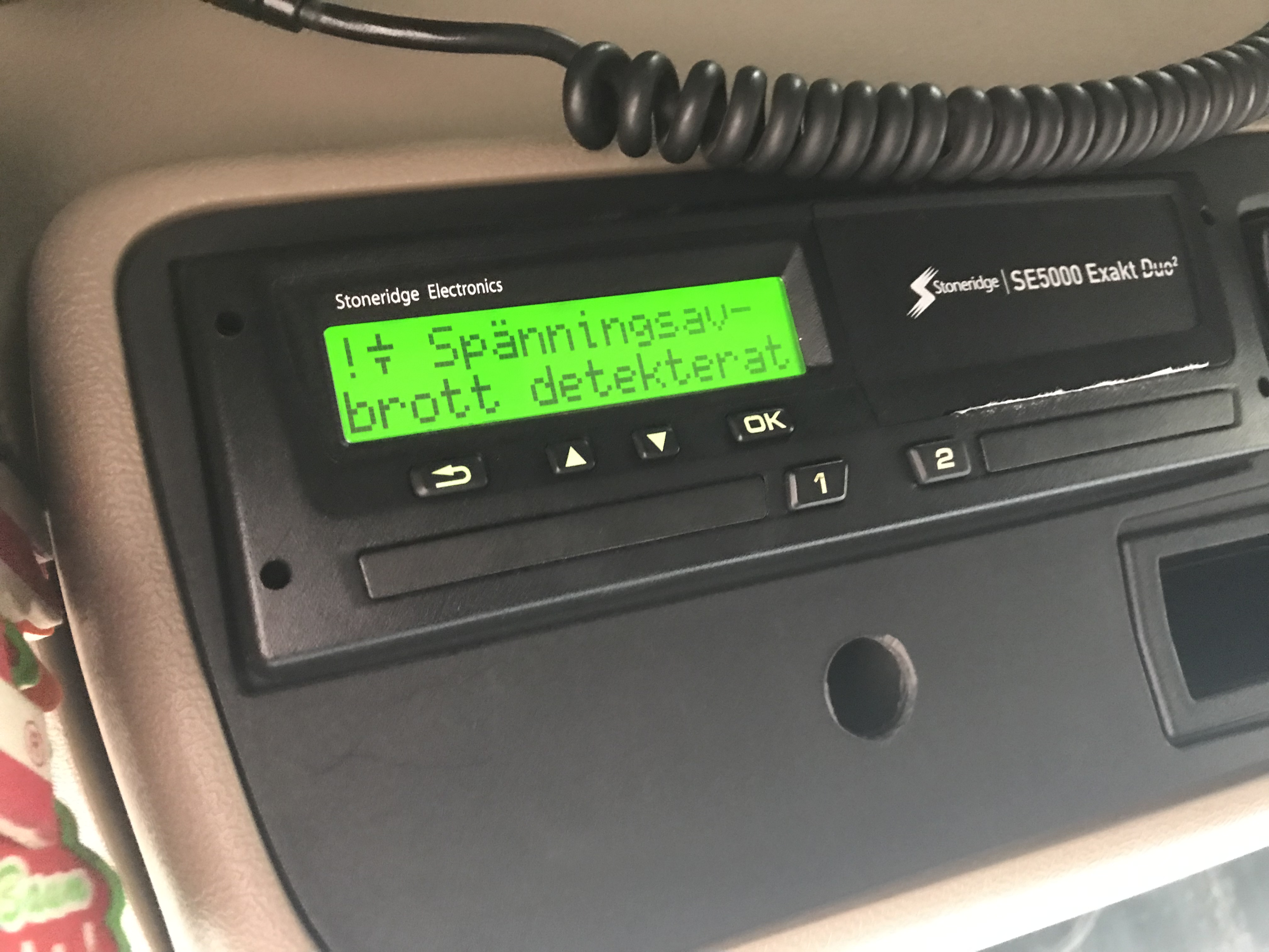 The tachograph shows error messages due to voltage failure, uncertain if other functions have been affected.