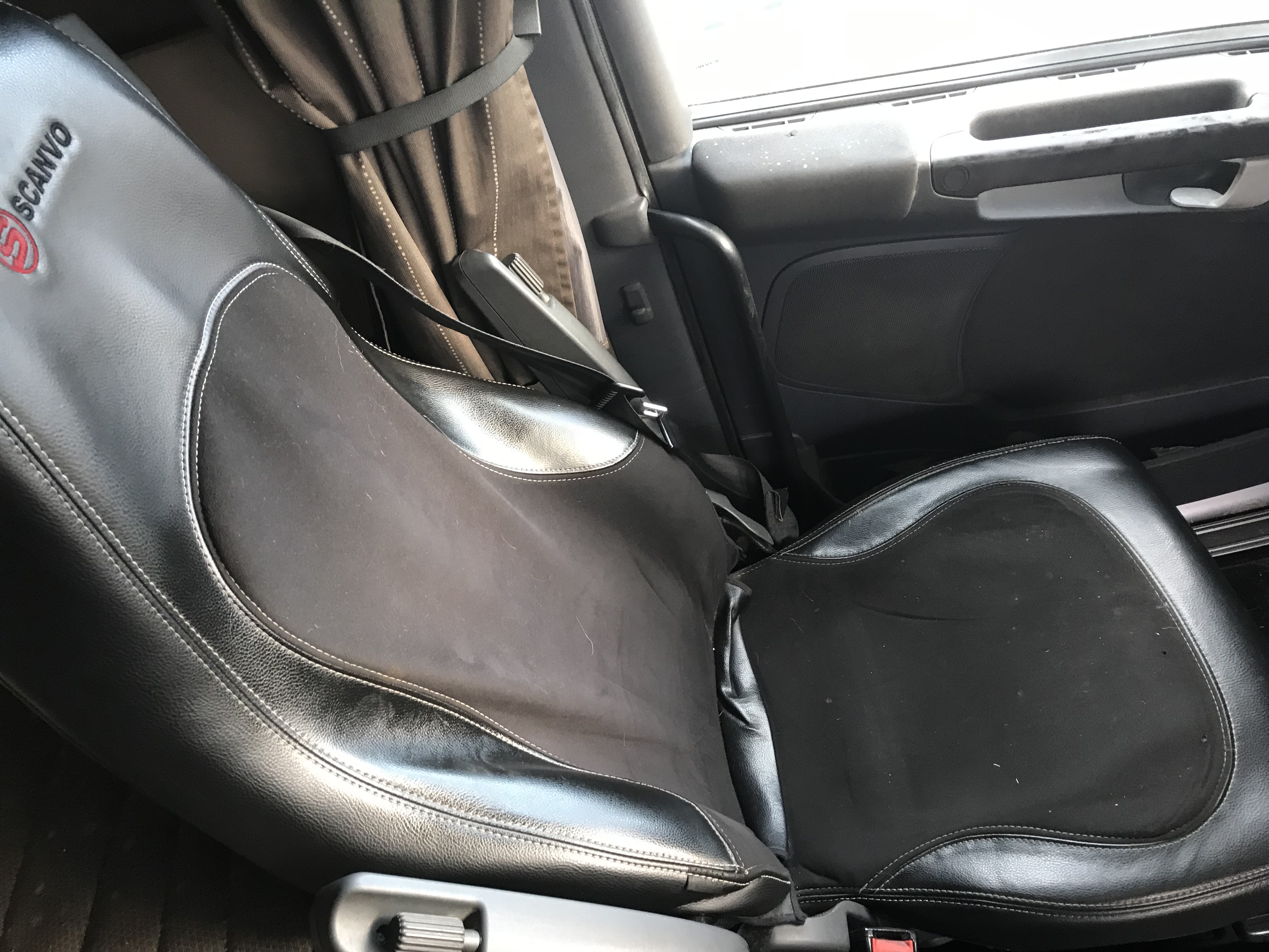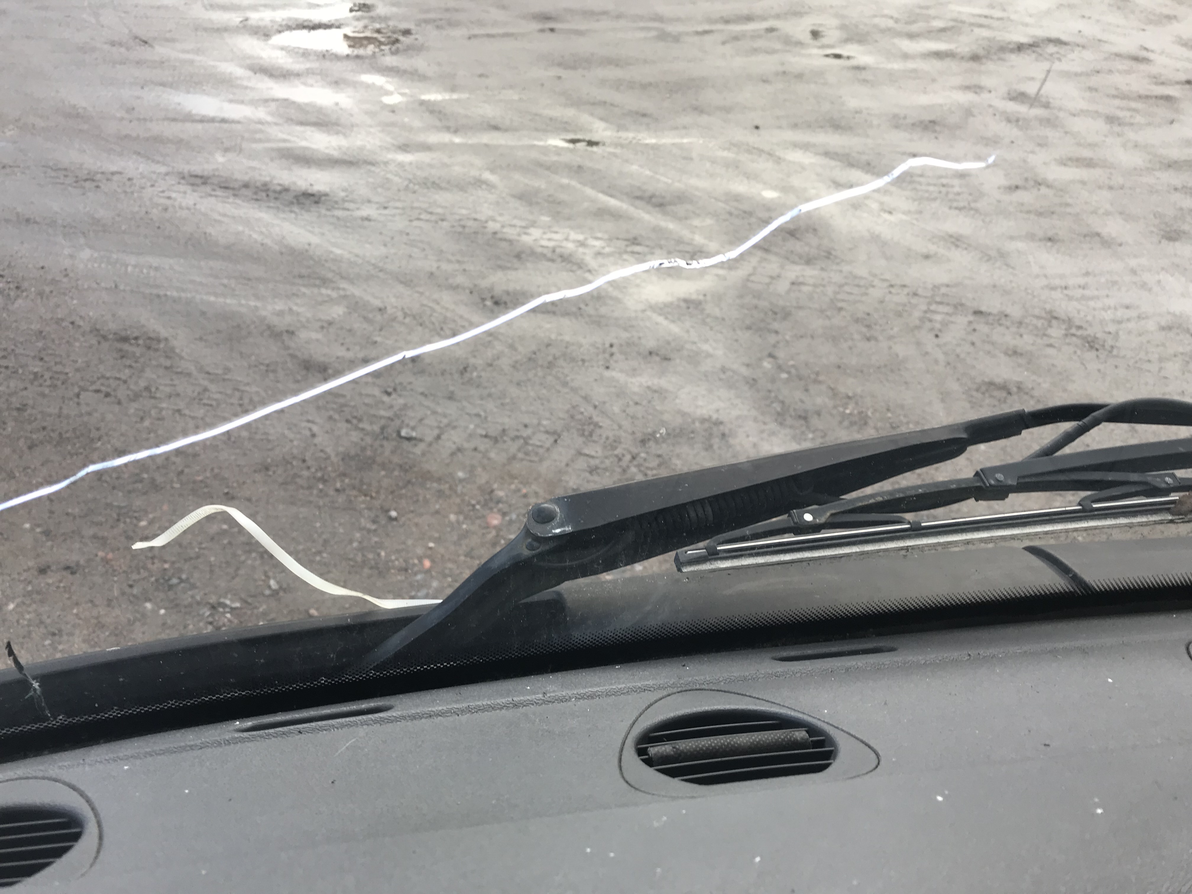Crack in the windshield, worn in the paint with tears and cracks in plastic details, dirty interior with traces of fur animals.