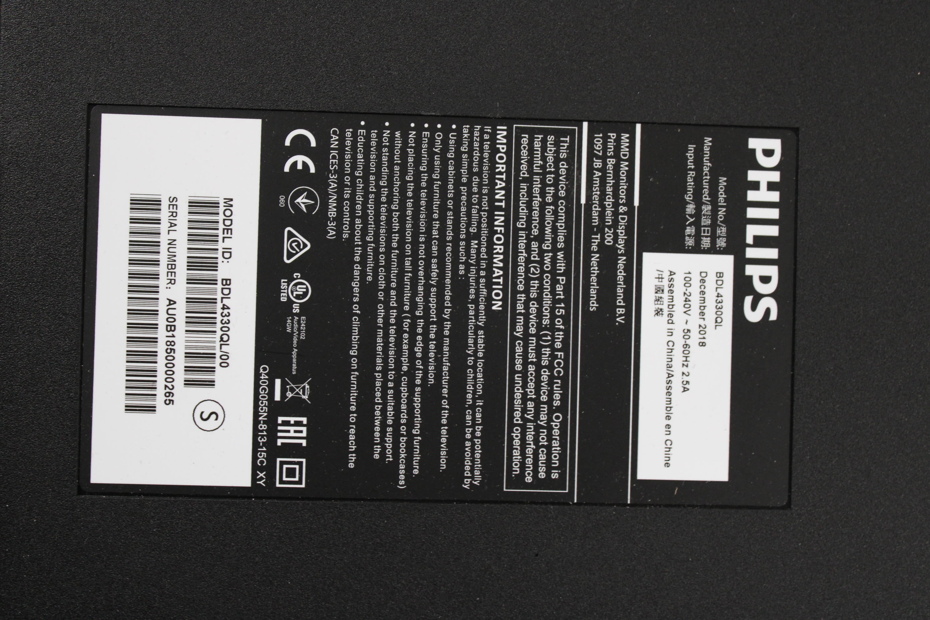 Philips TV screen BDL4330QL -18 incl. Wall mount and remote control