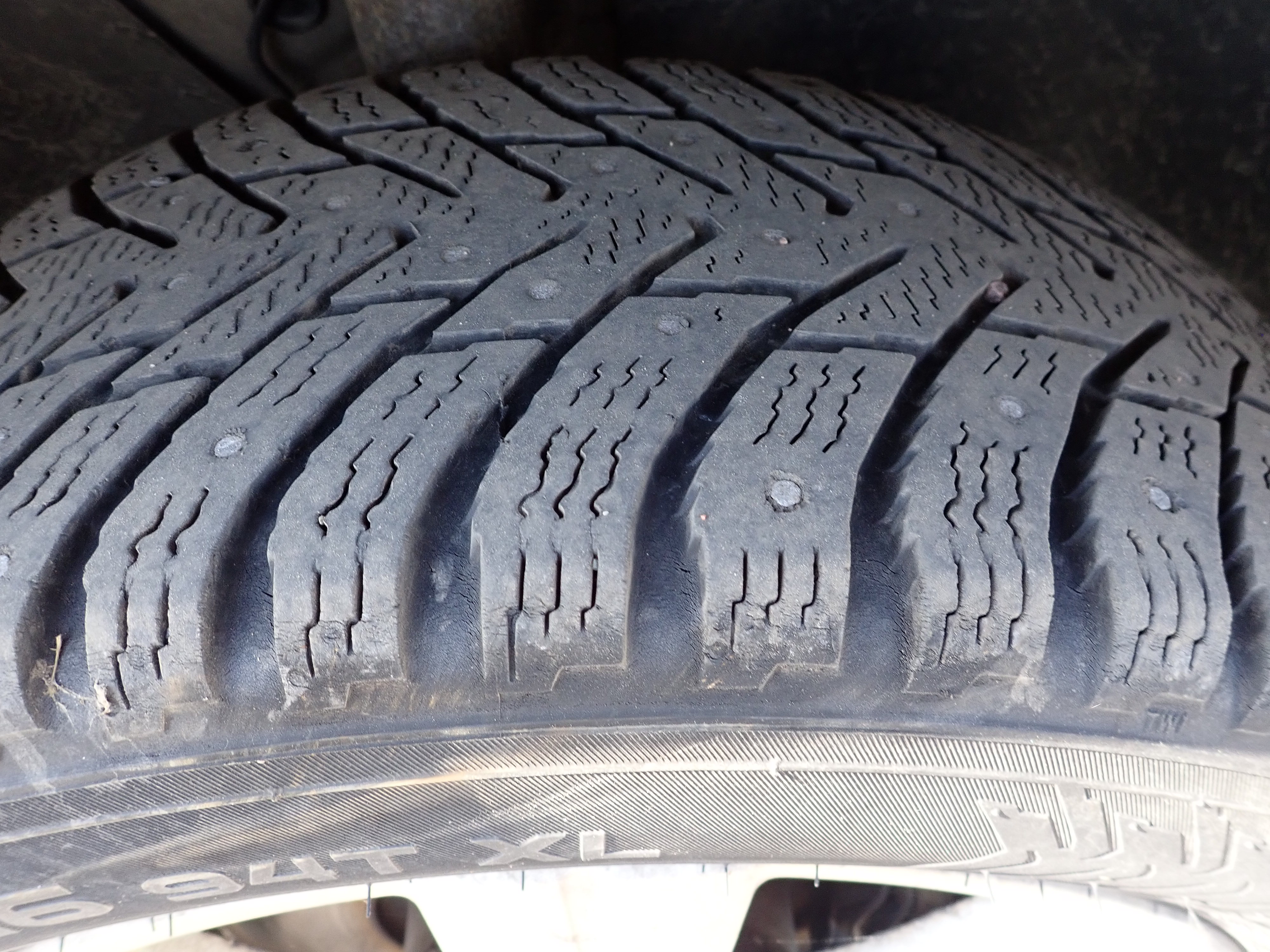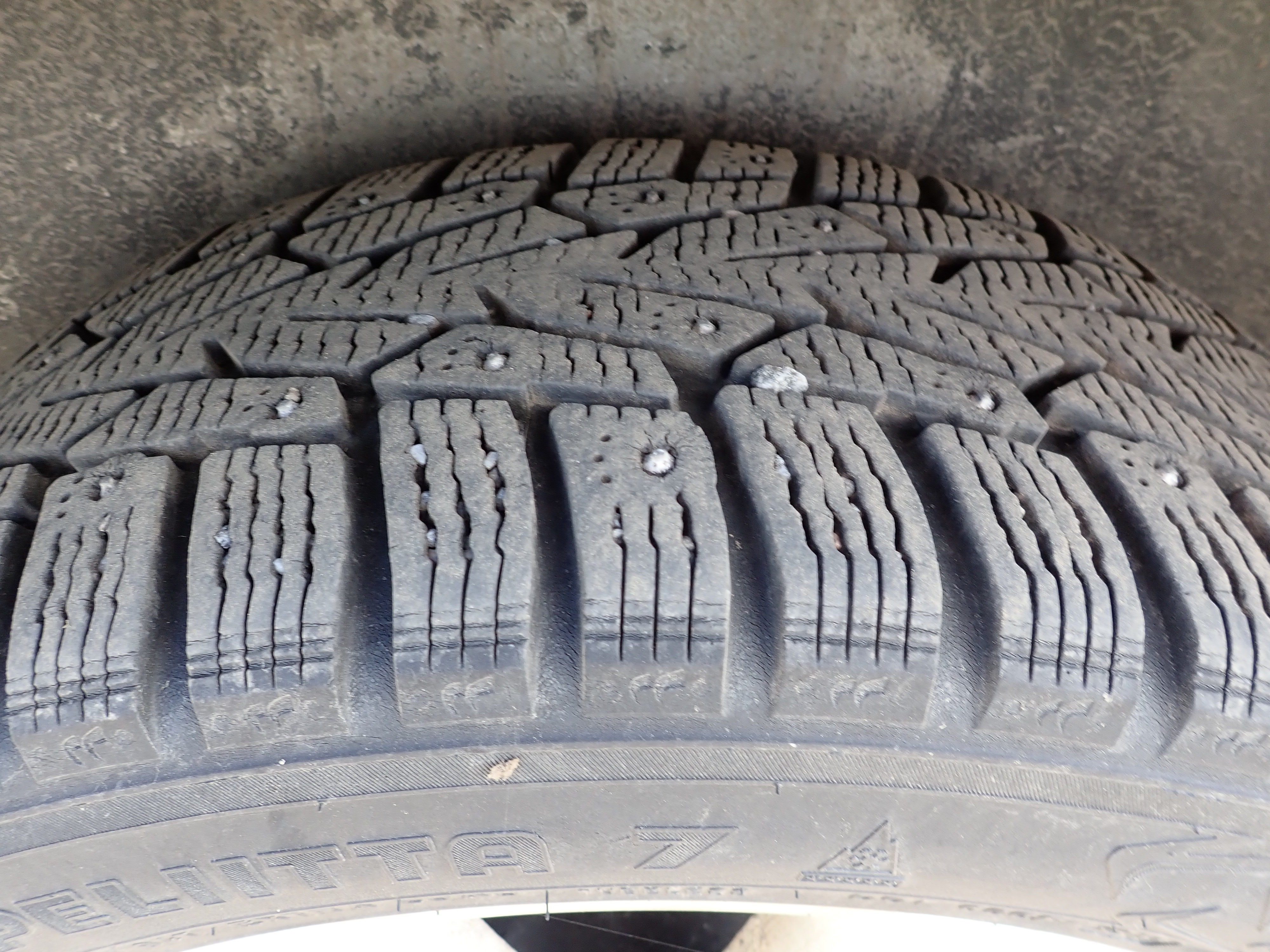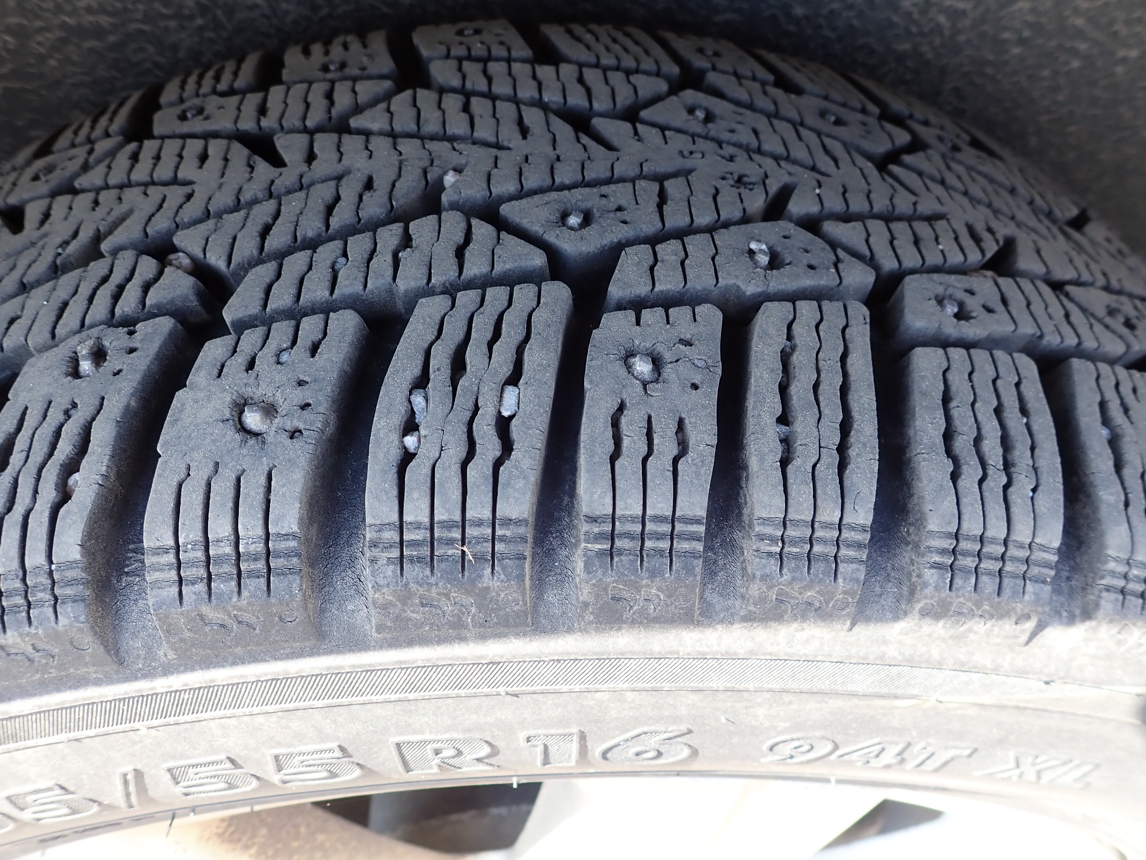 Studded winter tires on steel rims, about 50% remain of the tread depth. Only this set of tires is included.