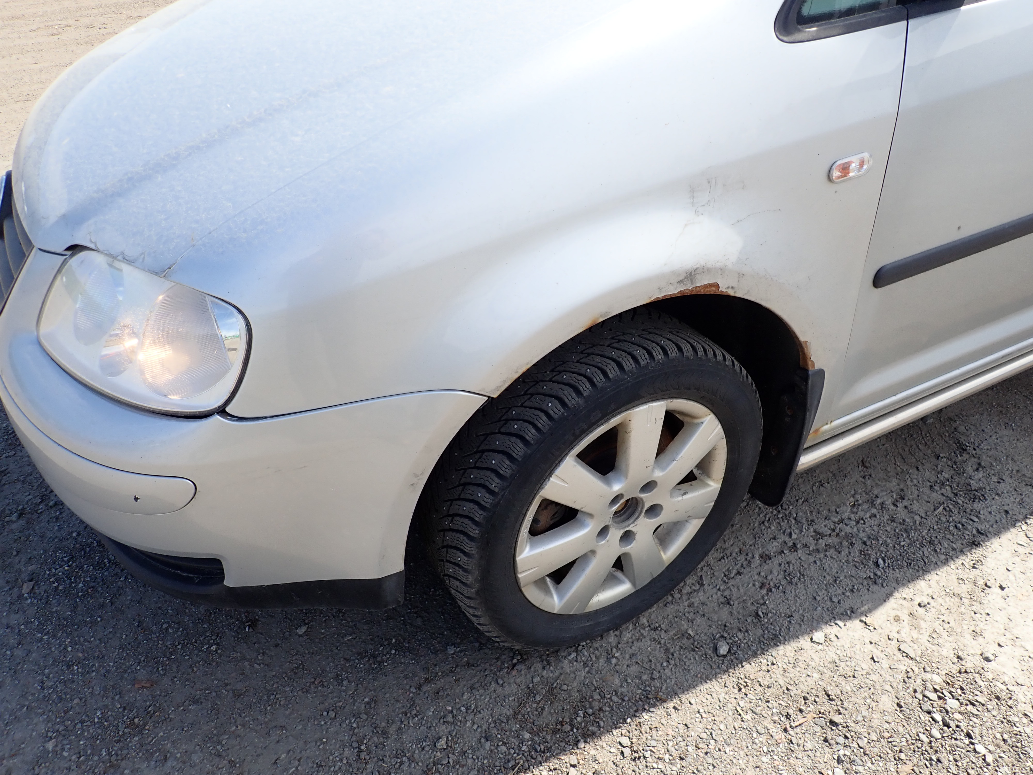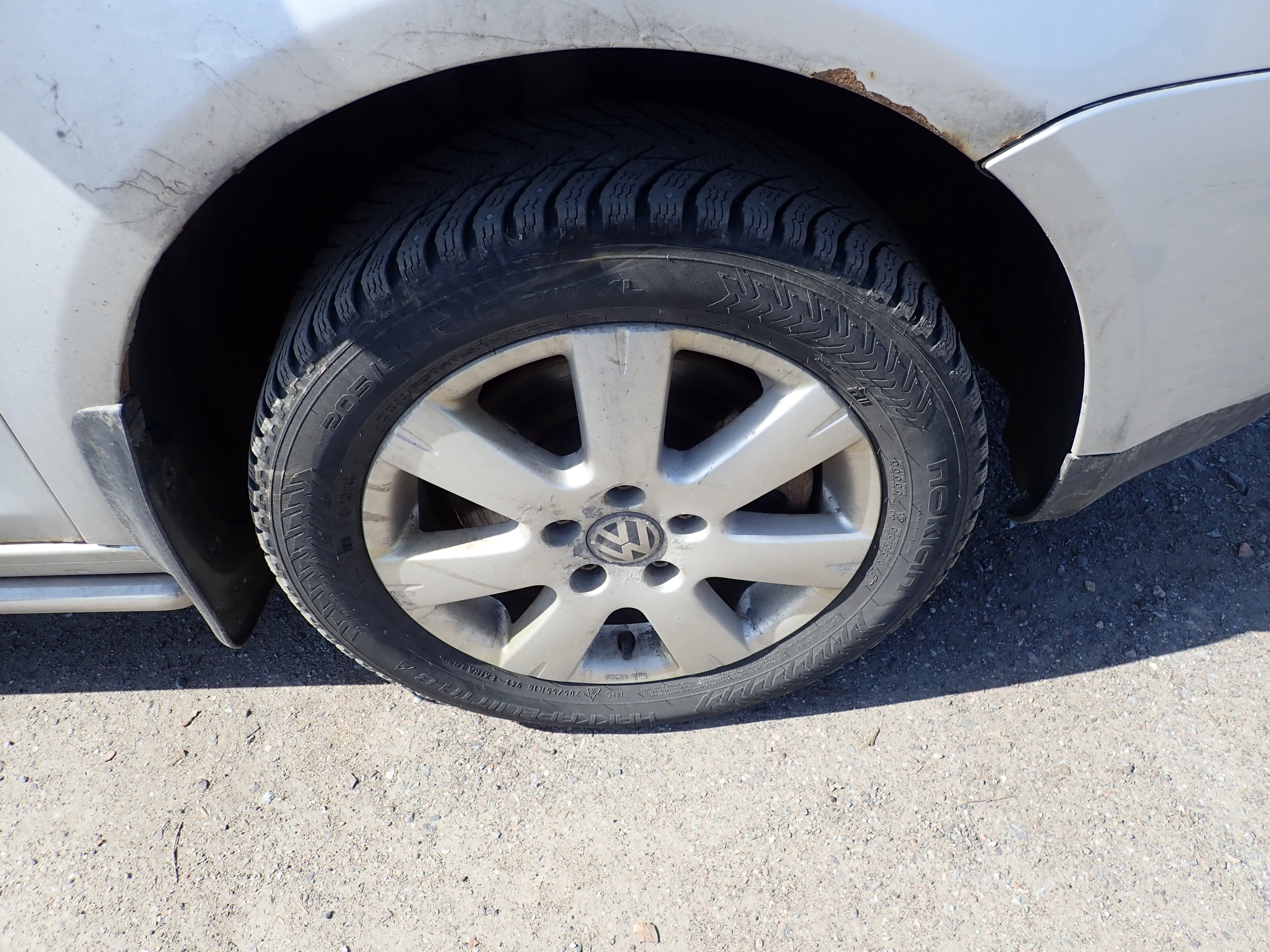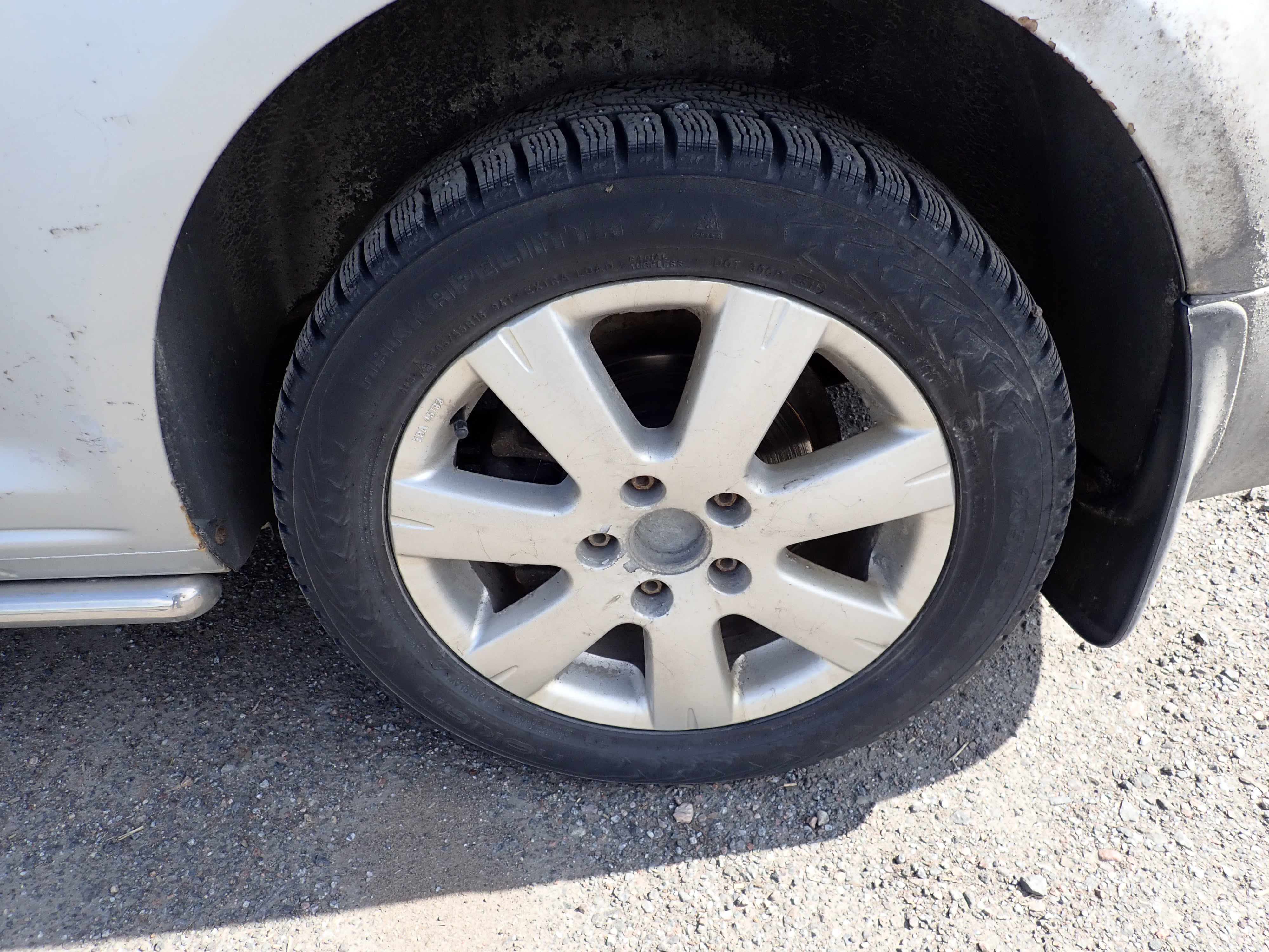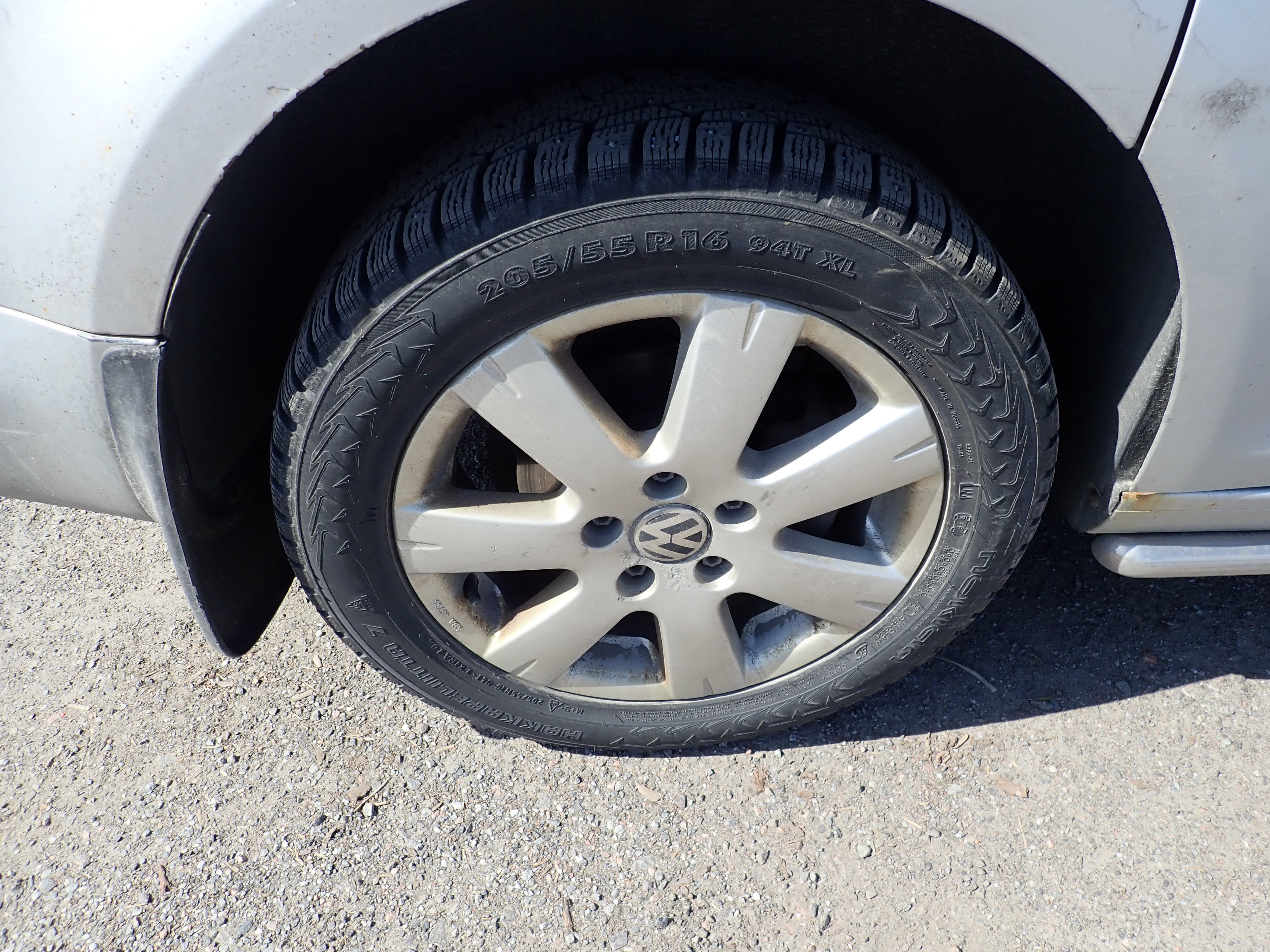 Studded winter tires on steel rims, about 50% remain of the tread depth. Only this set of tires is included.