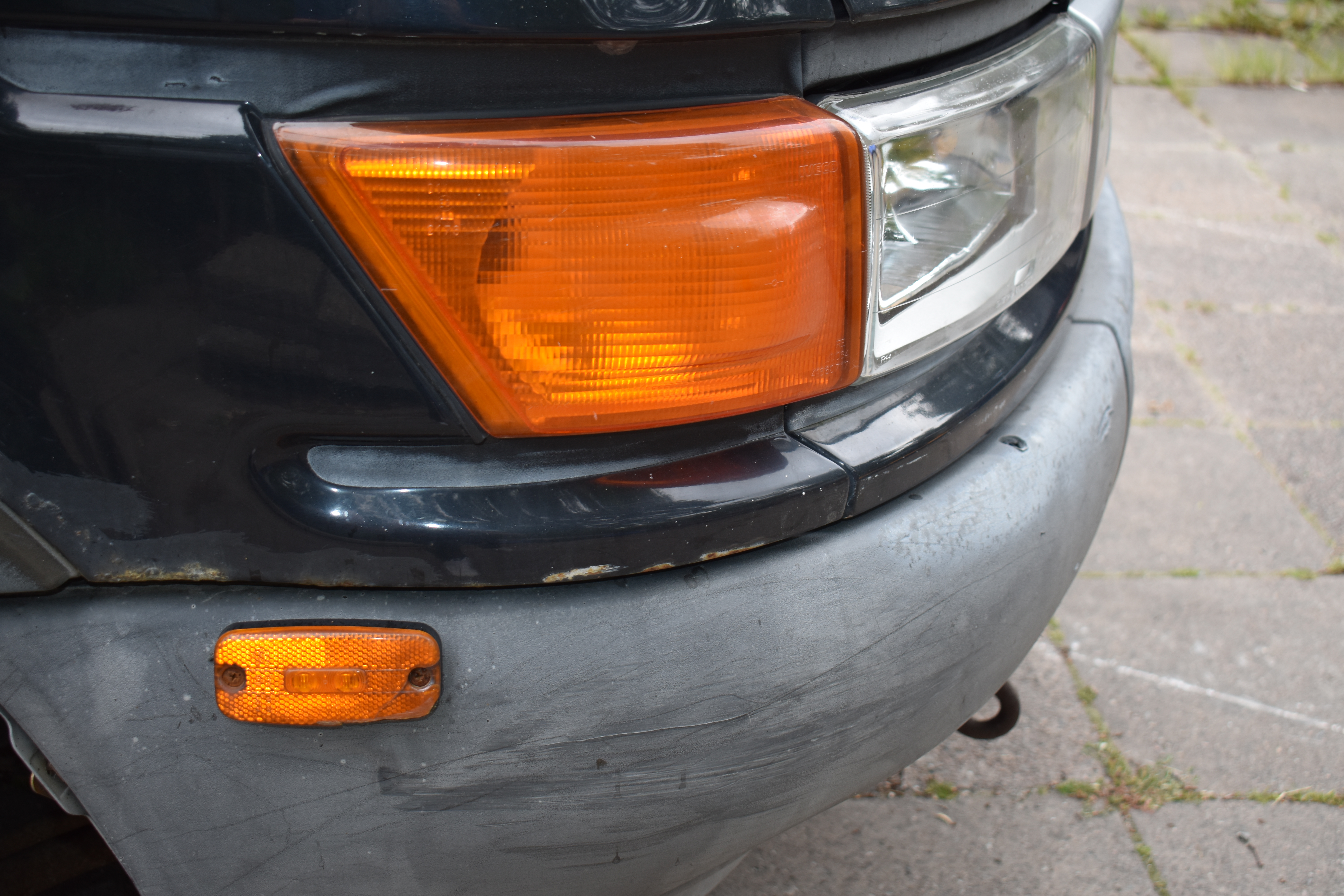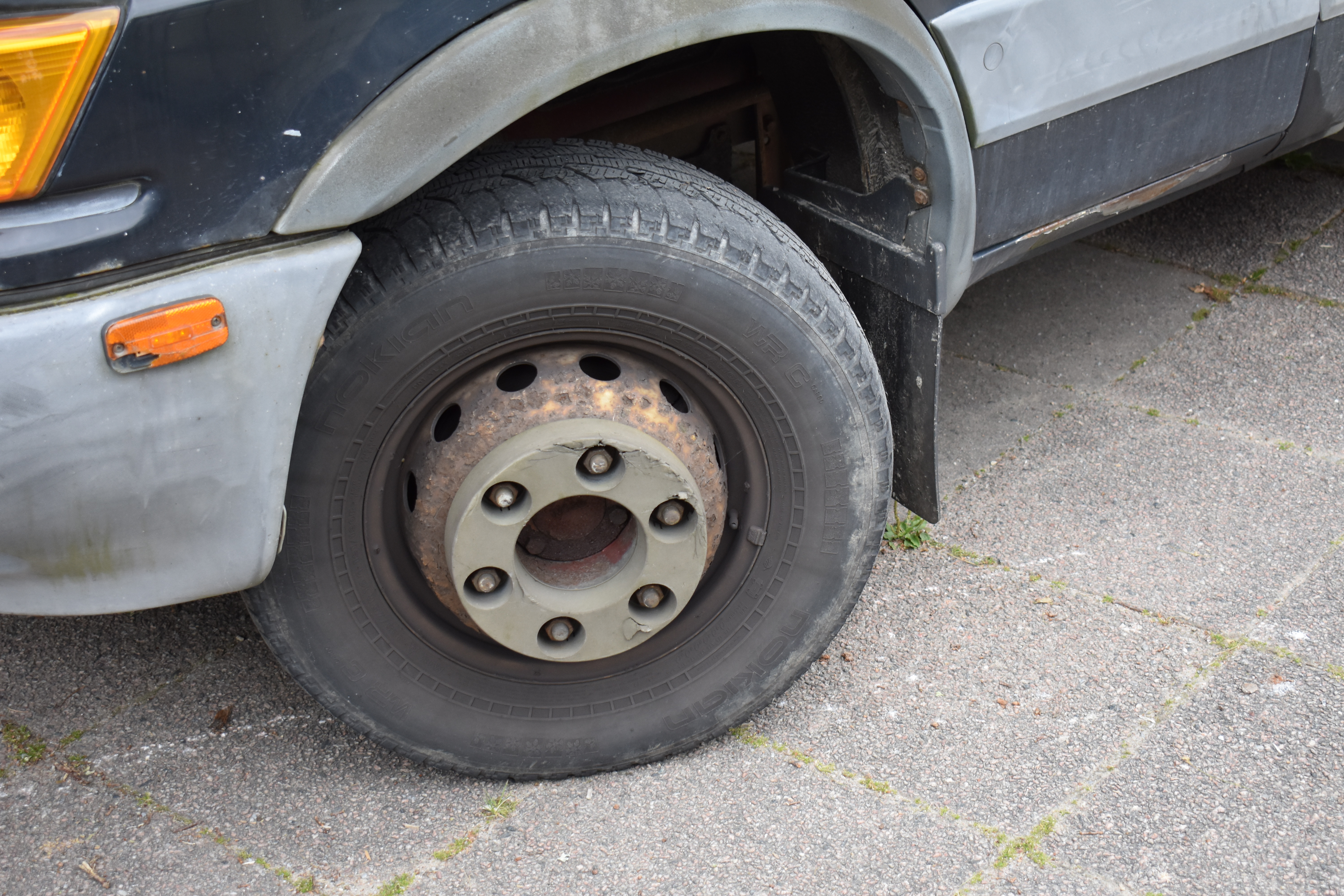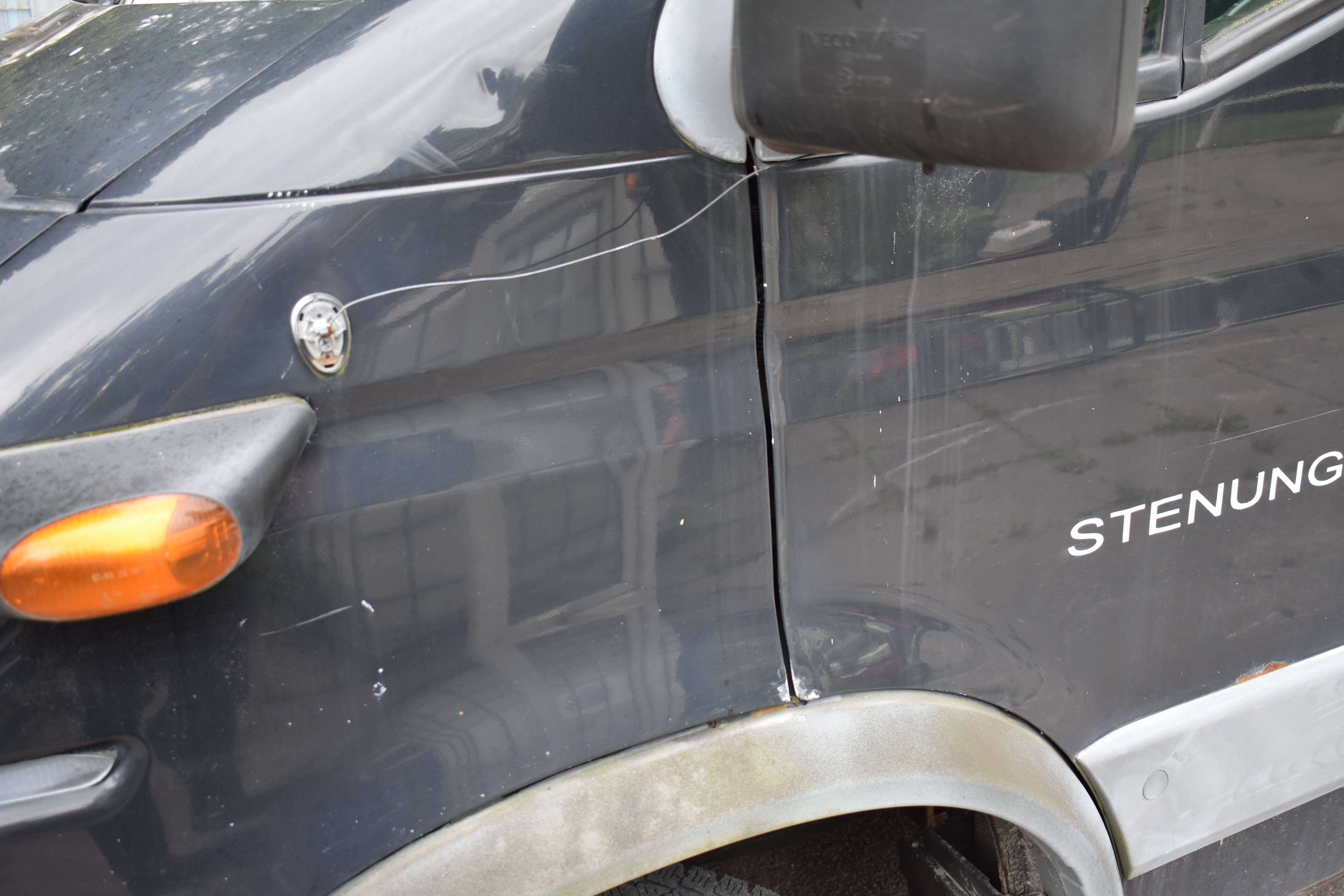 External condition: Antenna missing. Rust with paint release, scratches and chafing are found in several places around the body. Indentation is located above the right turn signal.