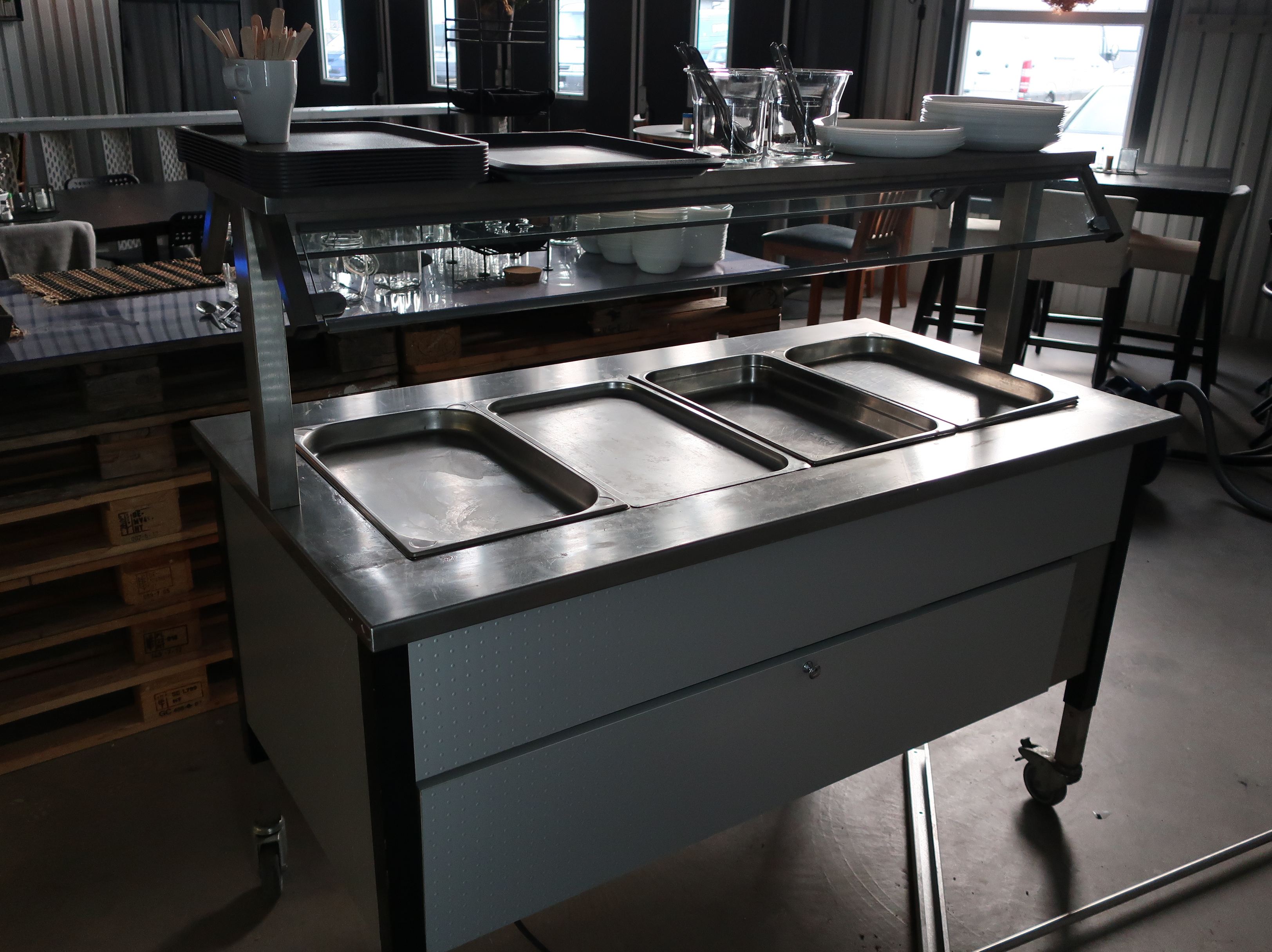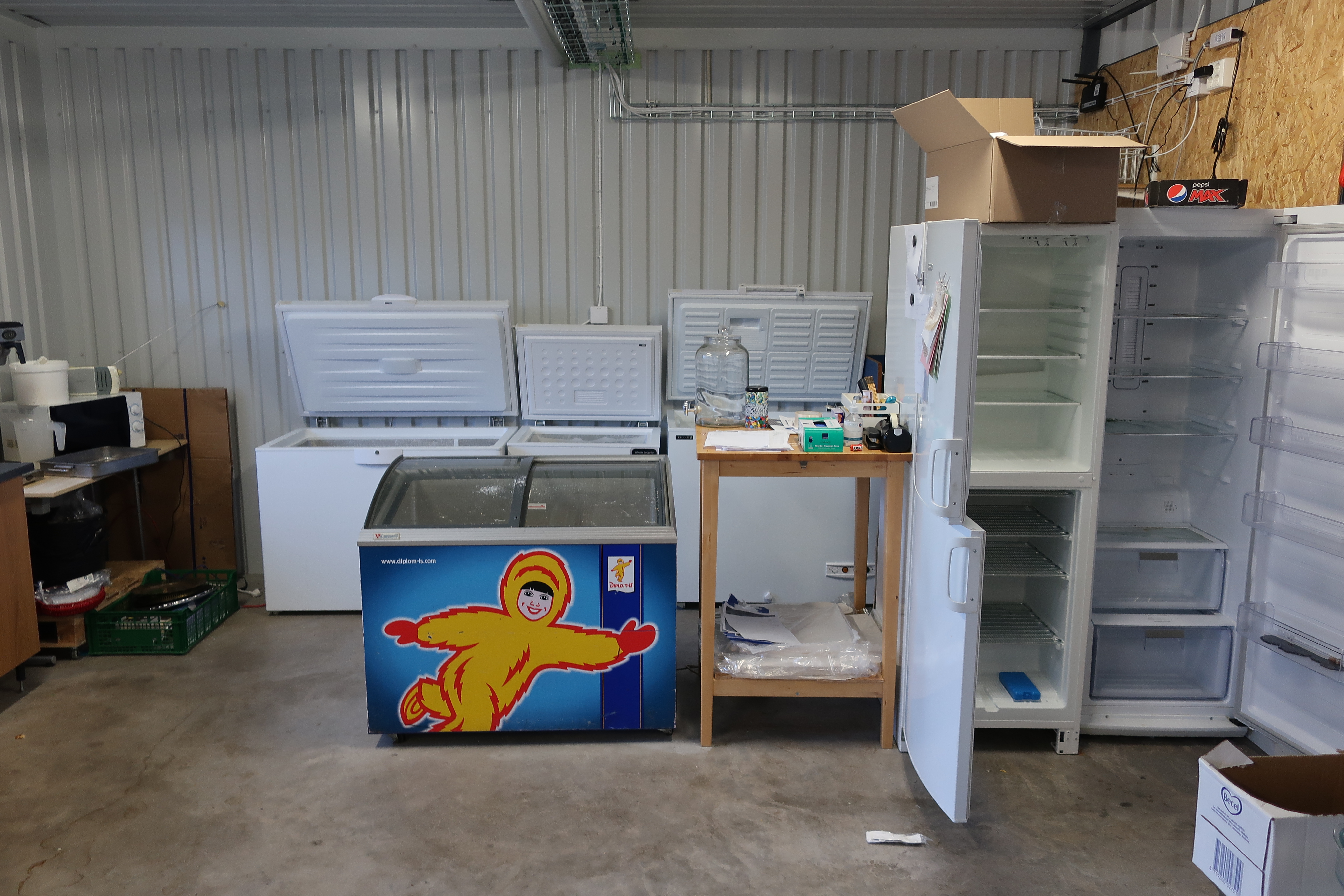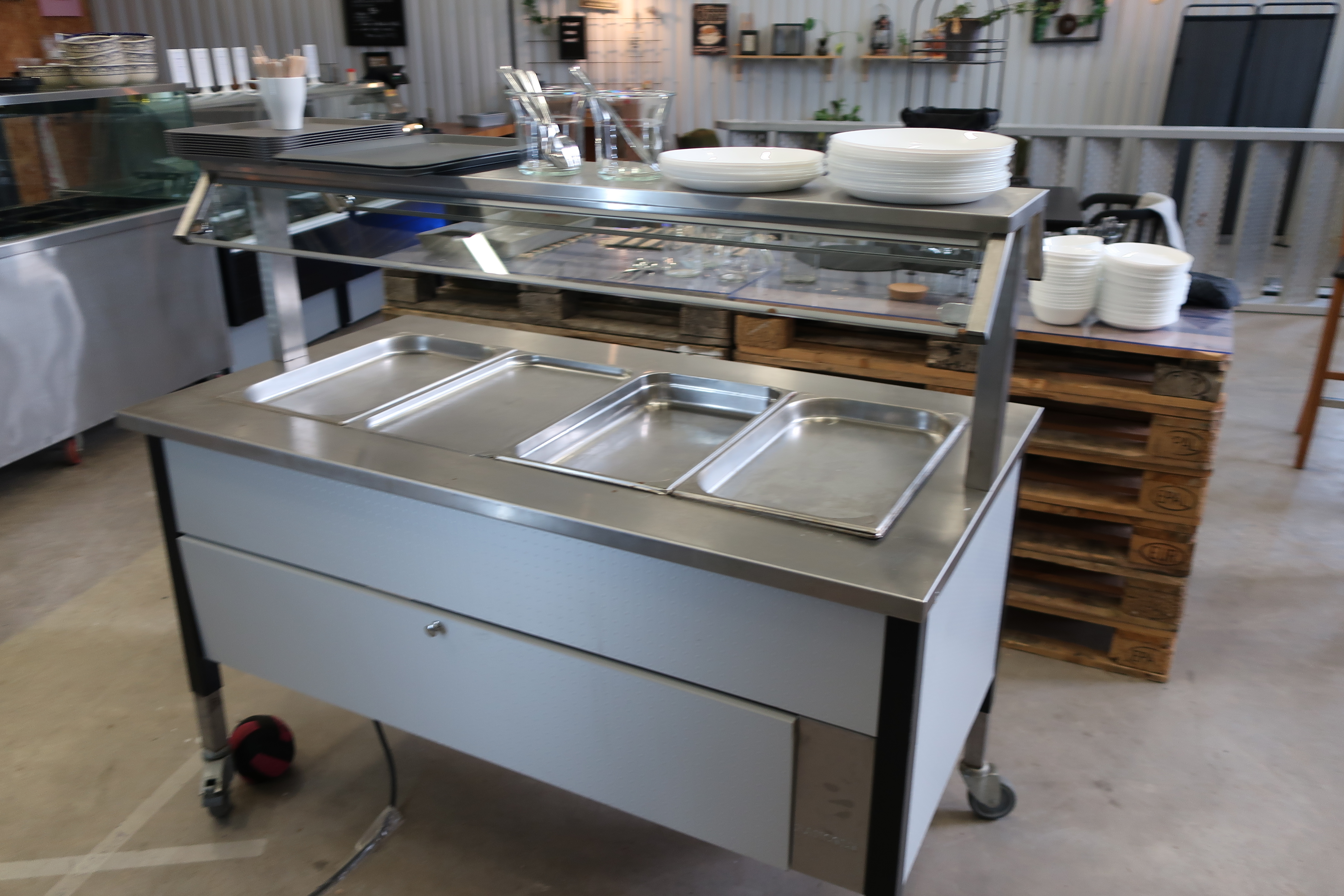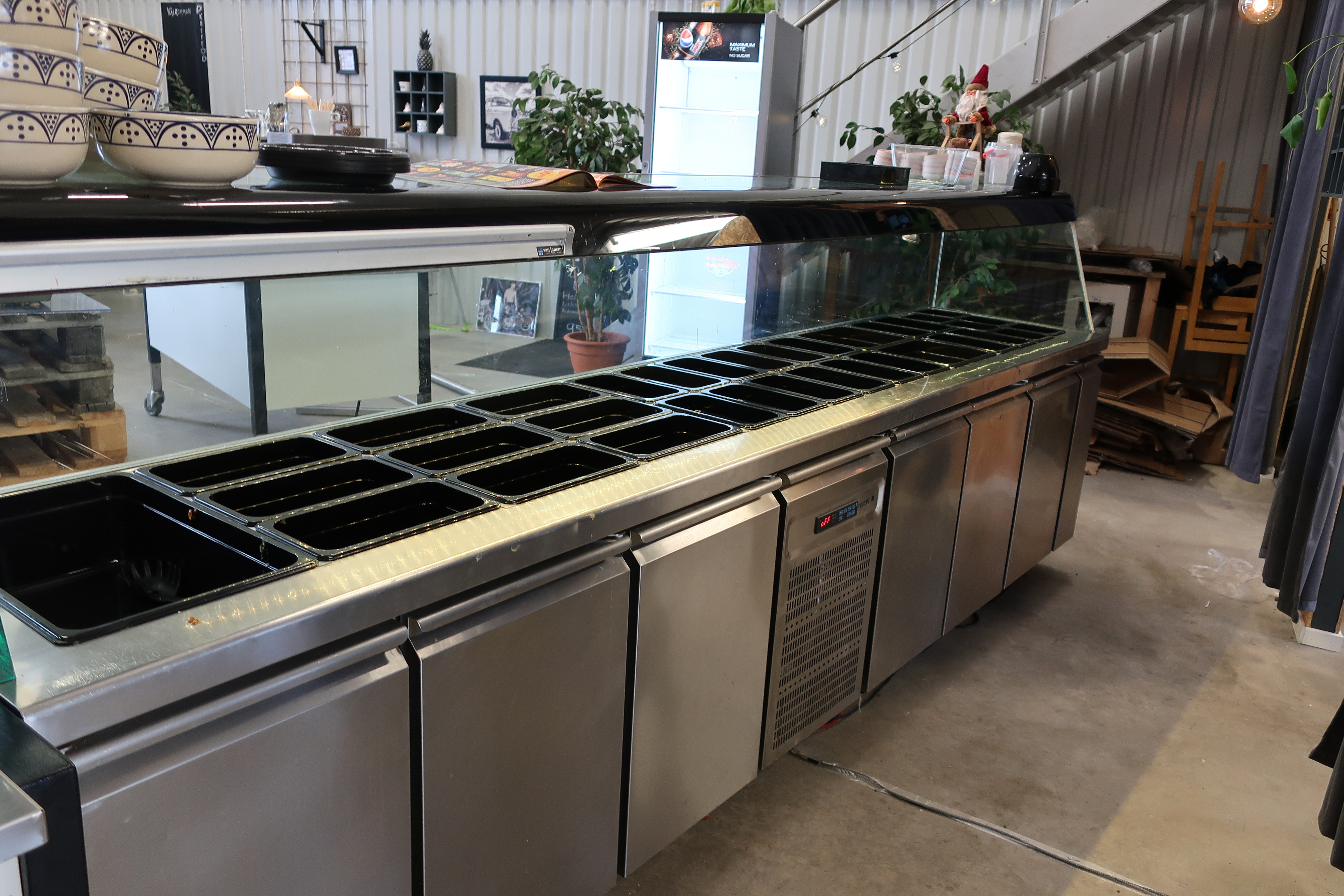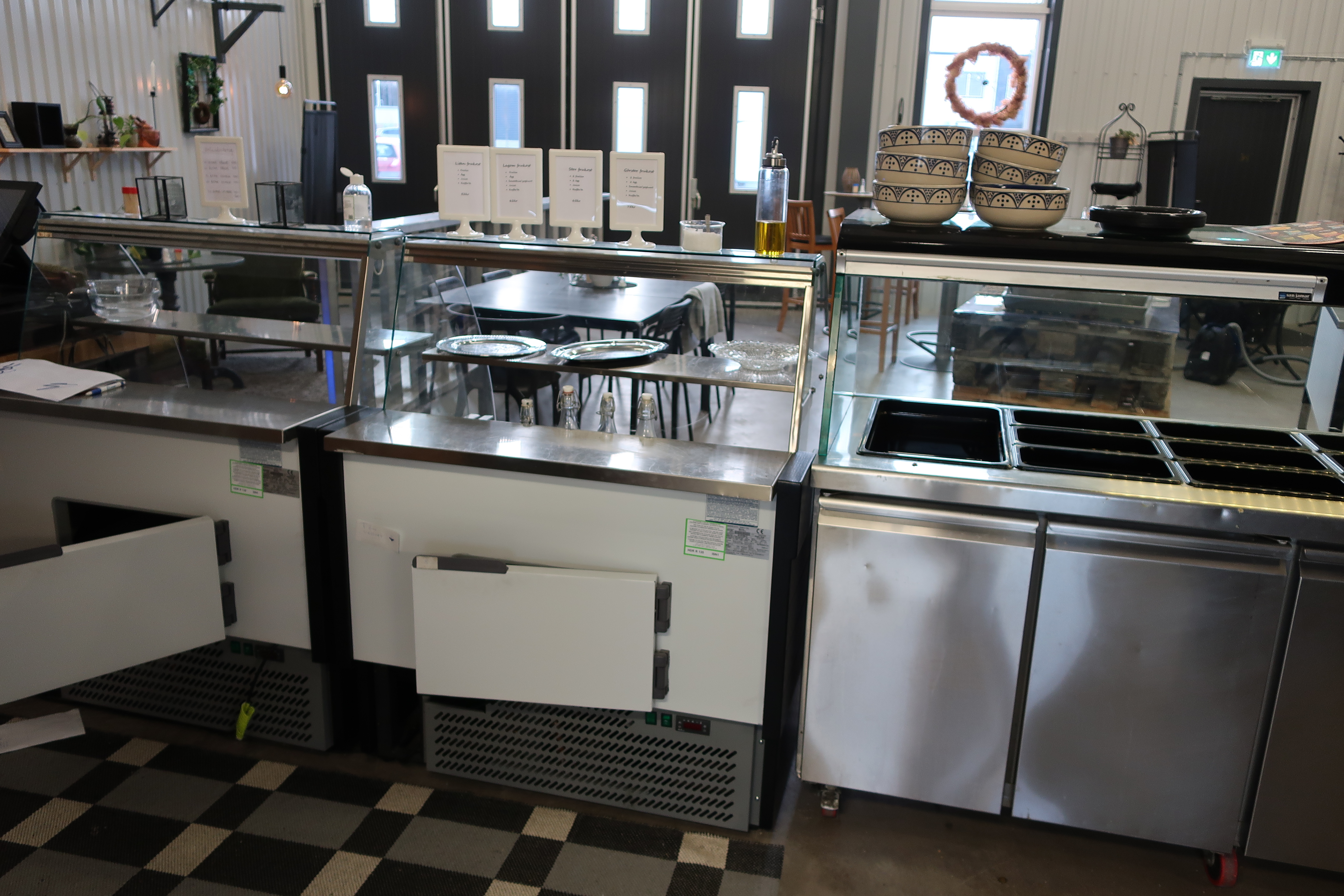 Rancold hot water bath, microwave, plants, 2 pcs Tecnodom K100VVC -2019, Ginox refrigerator with x number of boxes for salad, vegetables etc., 2 pcs Tecnodom FEM04NEGNV ovens -2018 ,, Gram refrigerator, Hendi panini grill, Ikea induction hob, Coffee Queen coffee maker Matsui freezer box, Tefcold freezer box, Electrolux freezer, Samsung refrigerator, various stainless steel benches, phligolite drawers (hot / cold), sofa group.