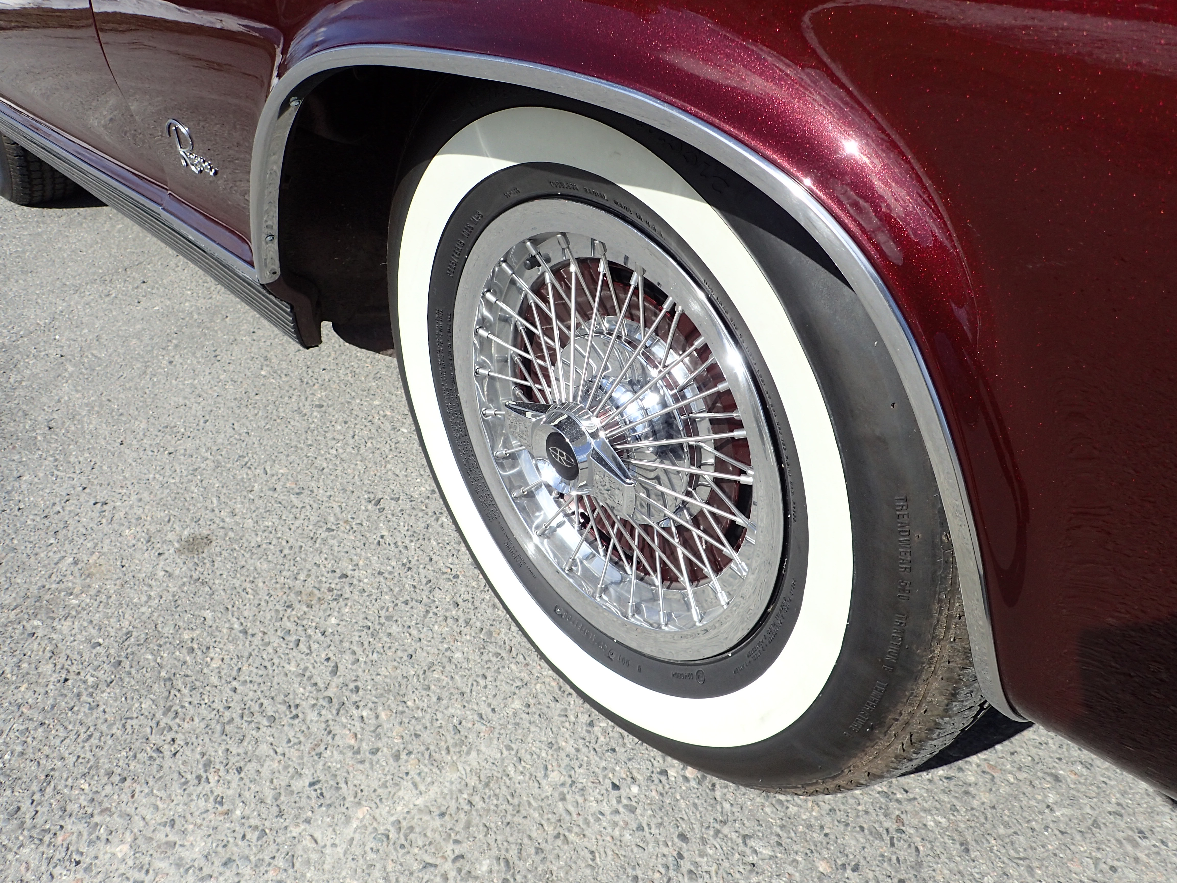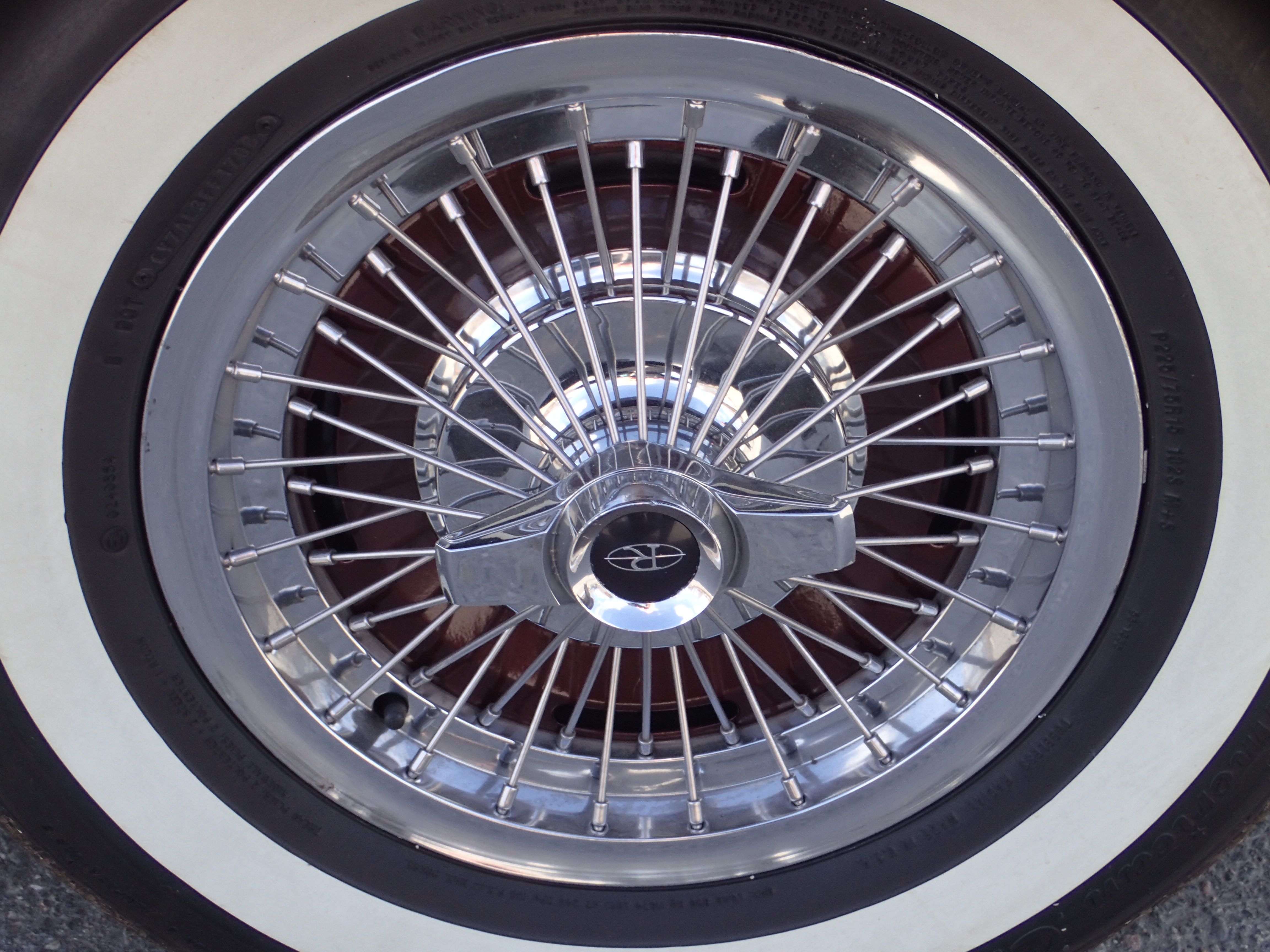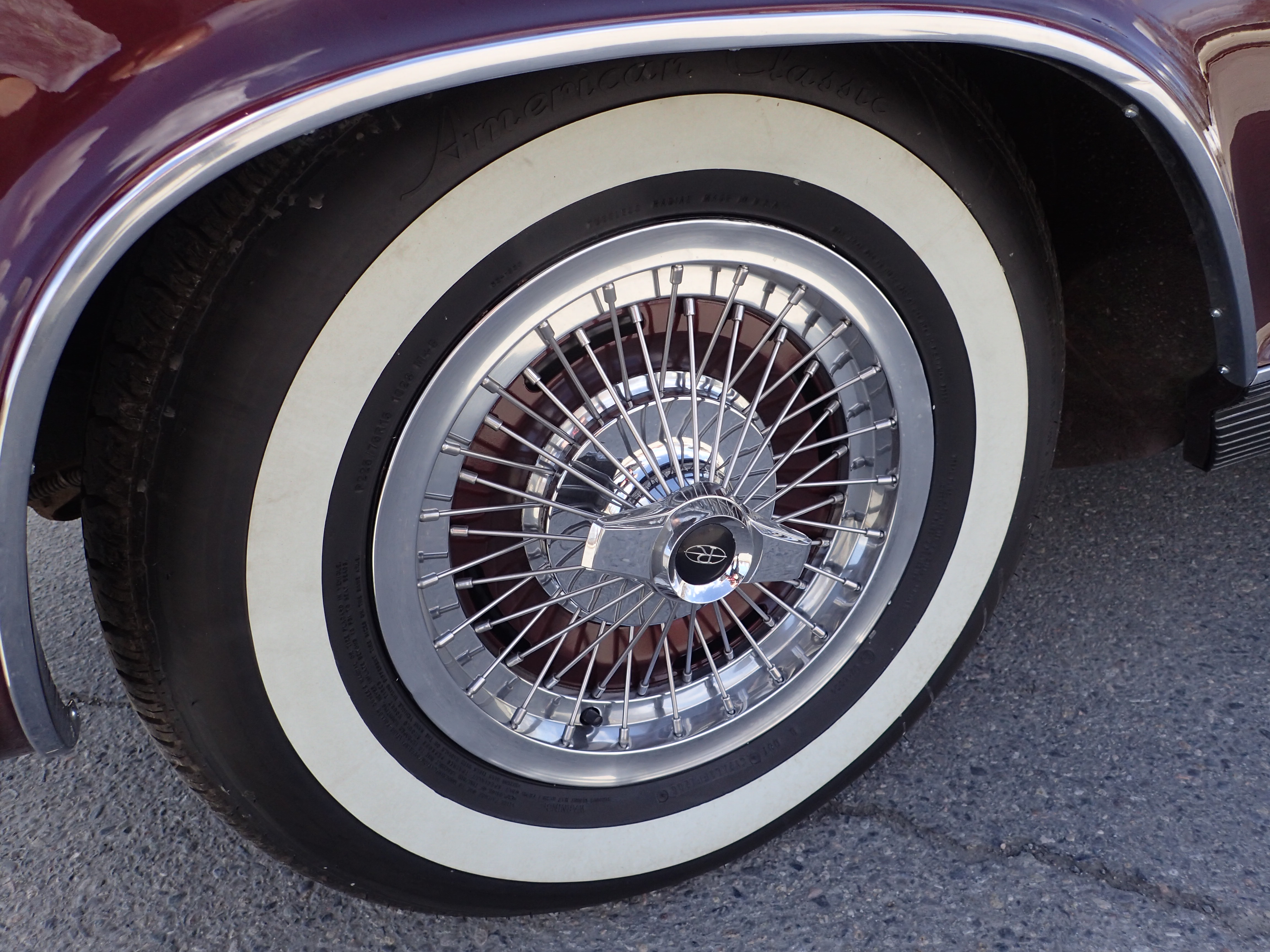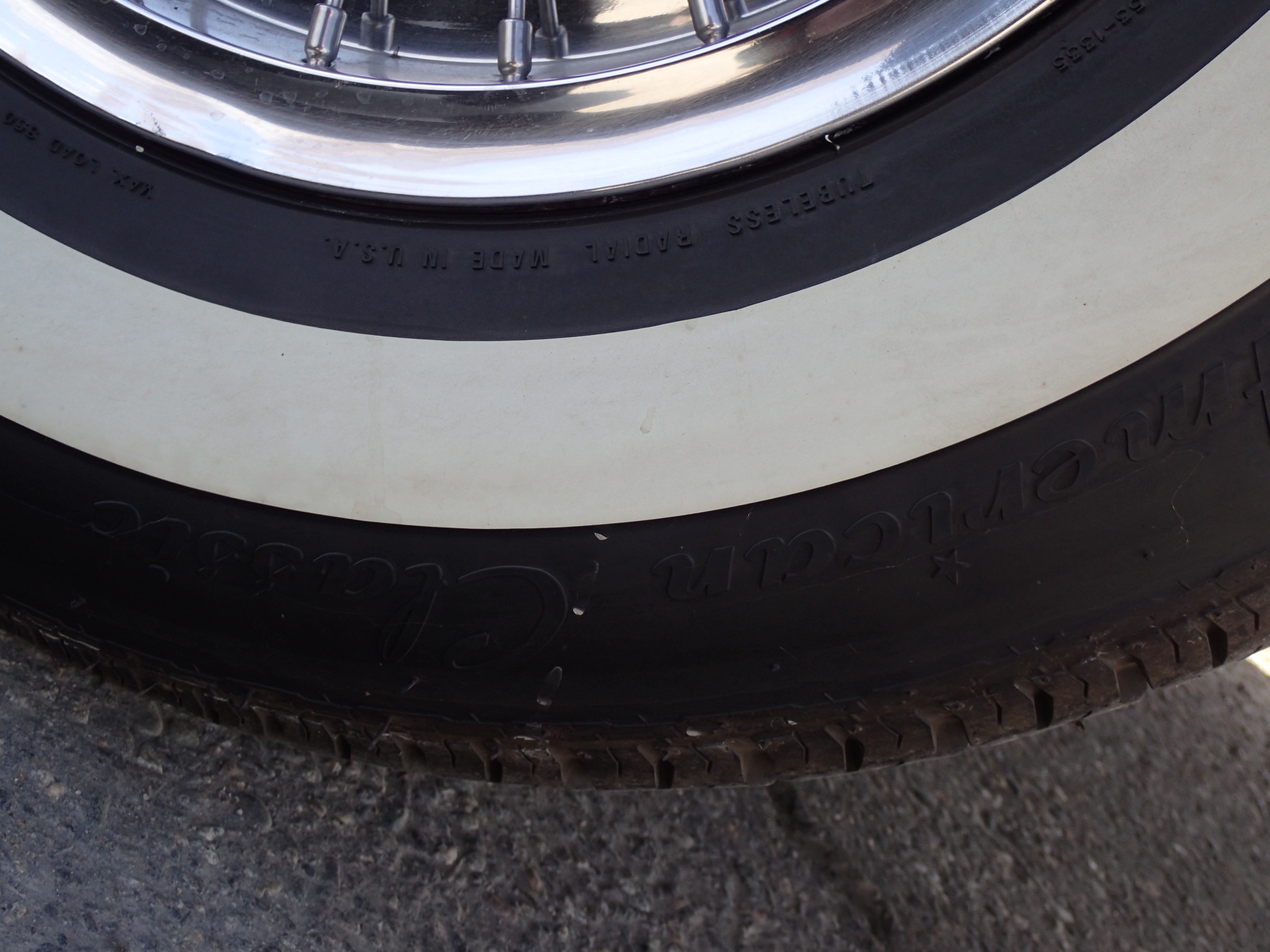 Original tin rims with spoke hubcaps, Coker tires with white side, bought in 2016, max 100 miles with these.
