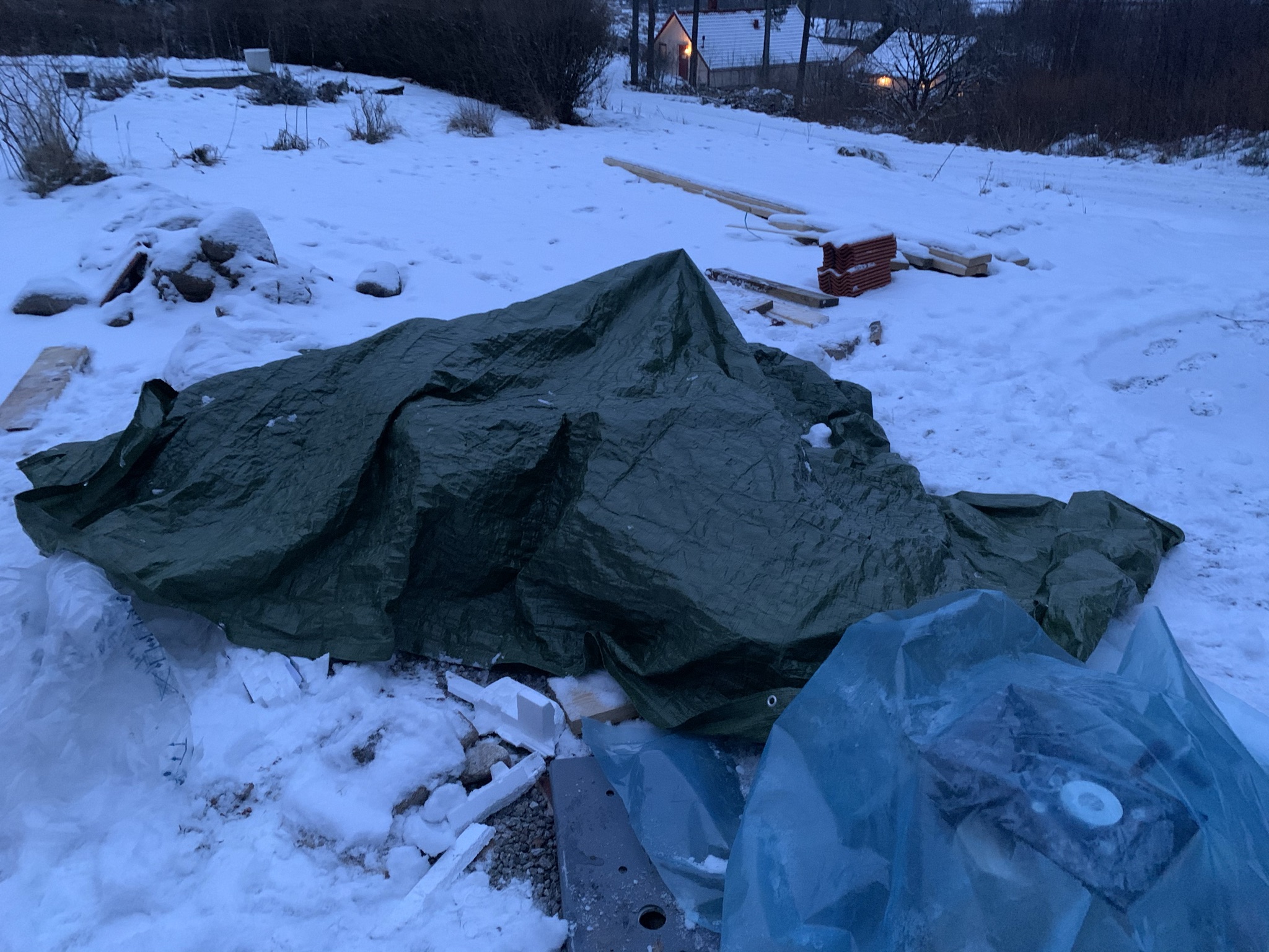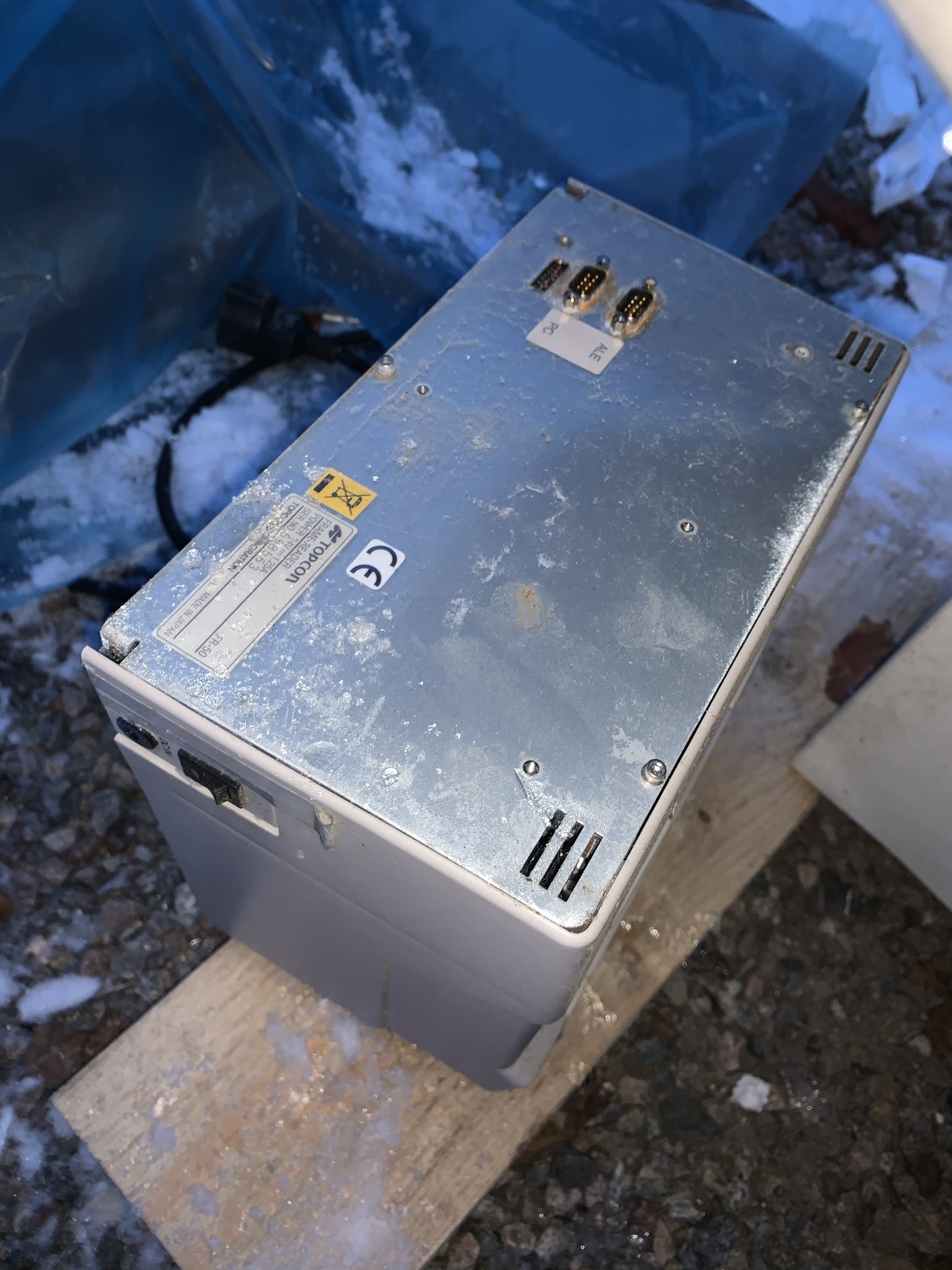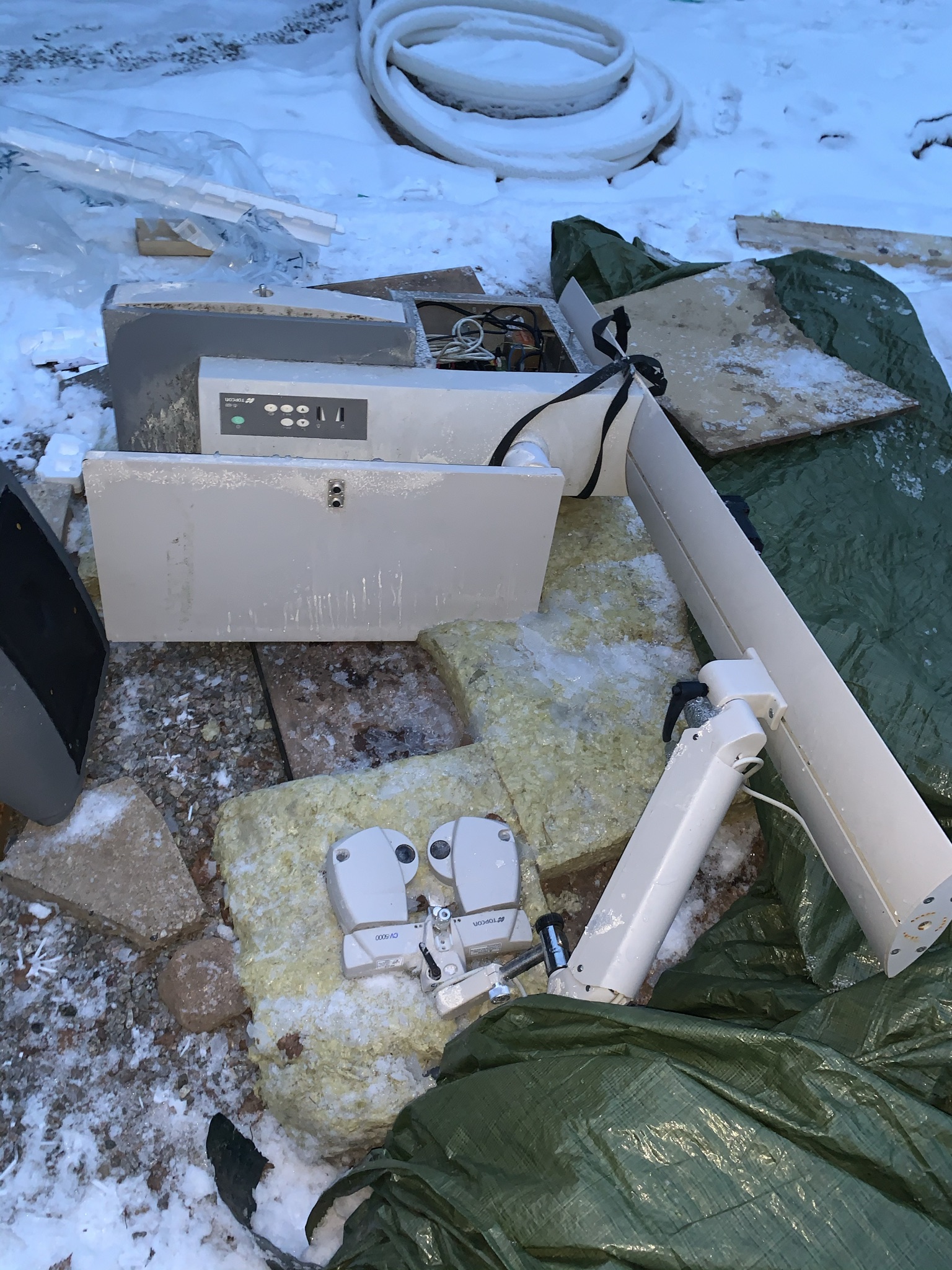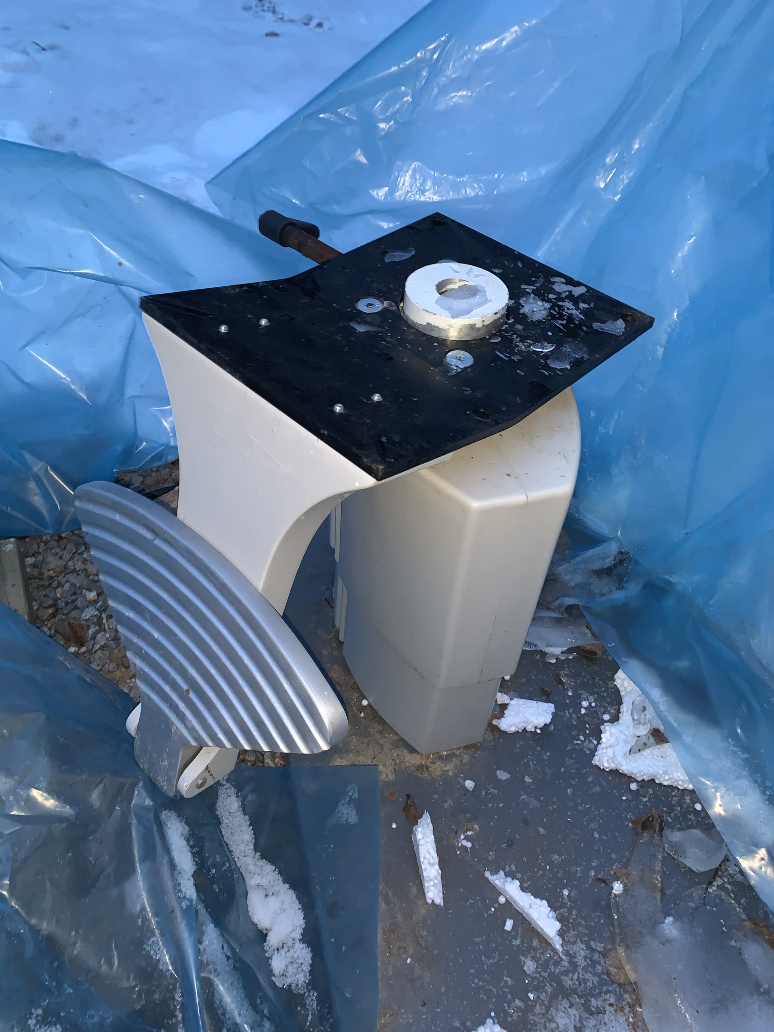 The object is dismantled and is outdoors under a tarpaulin.
