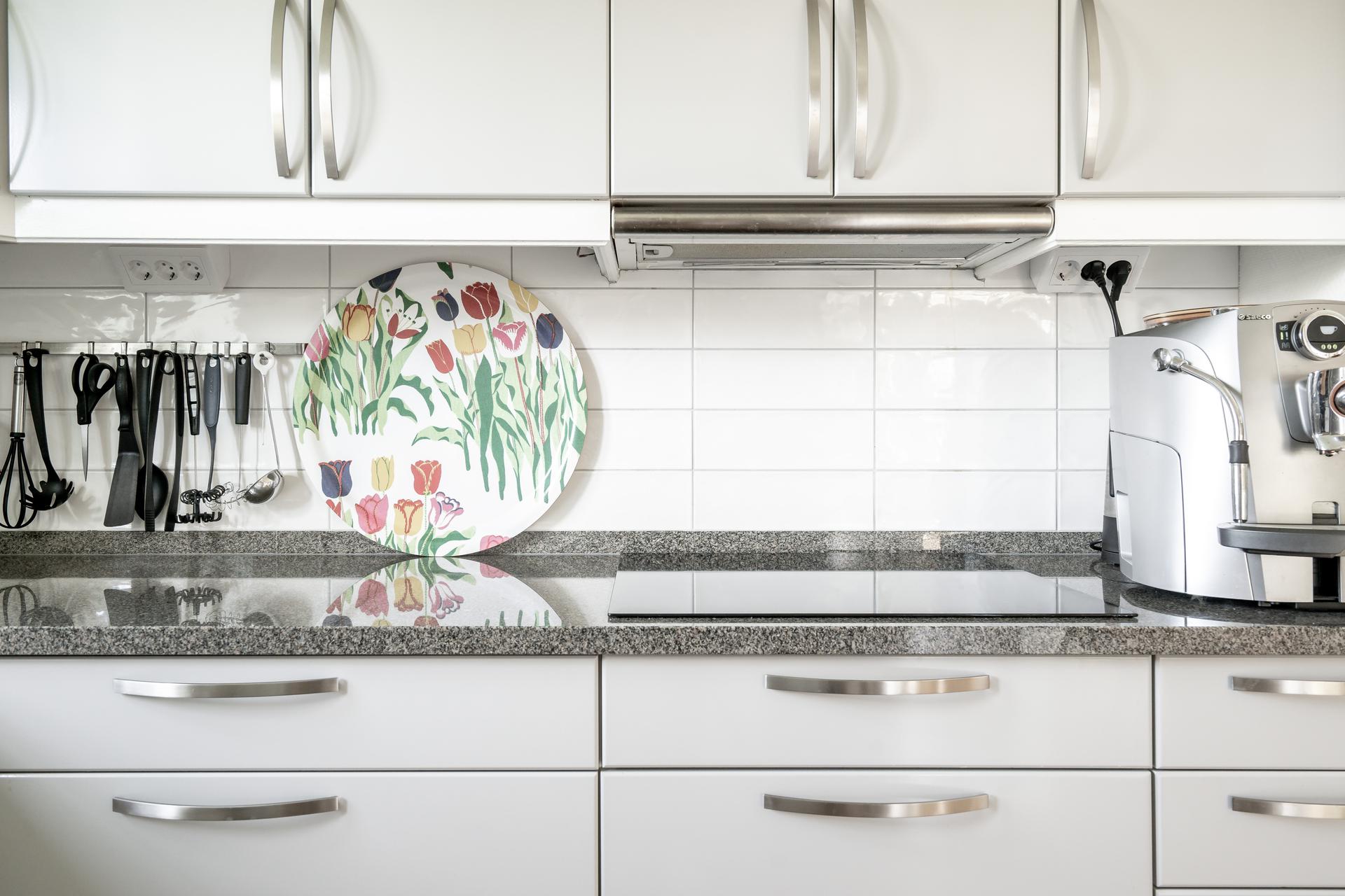 Granite stone slab in the kitchen with stove, fridge and freezer.