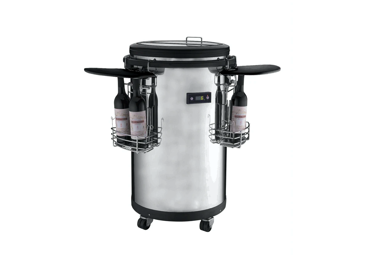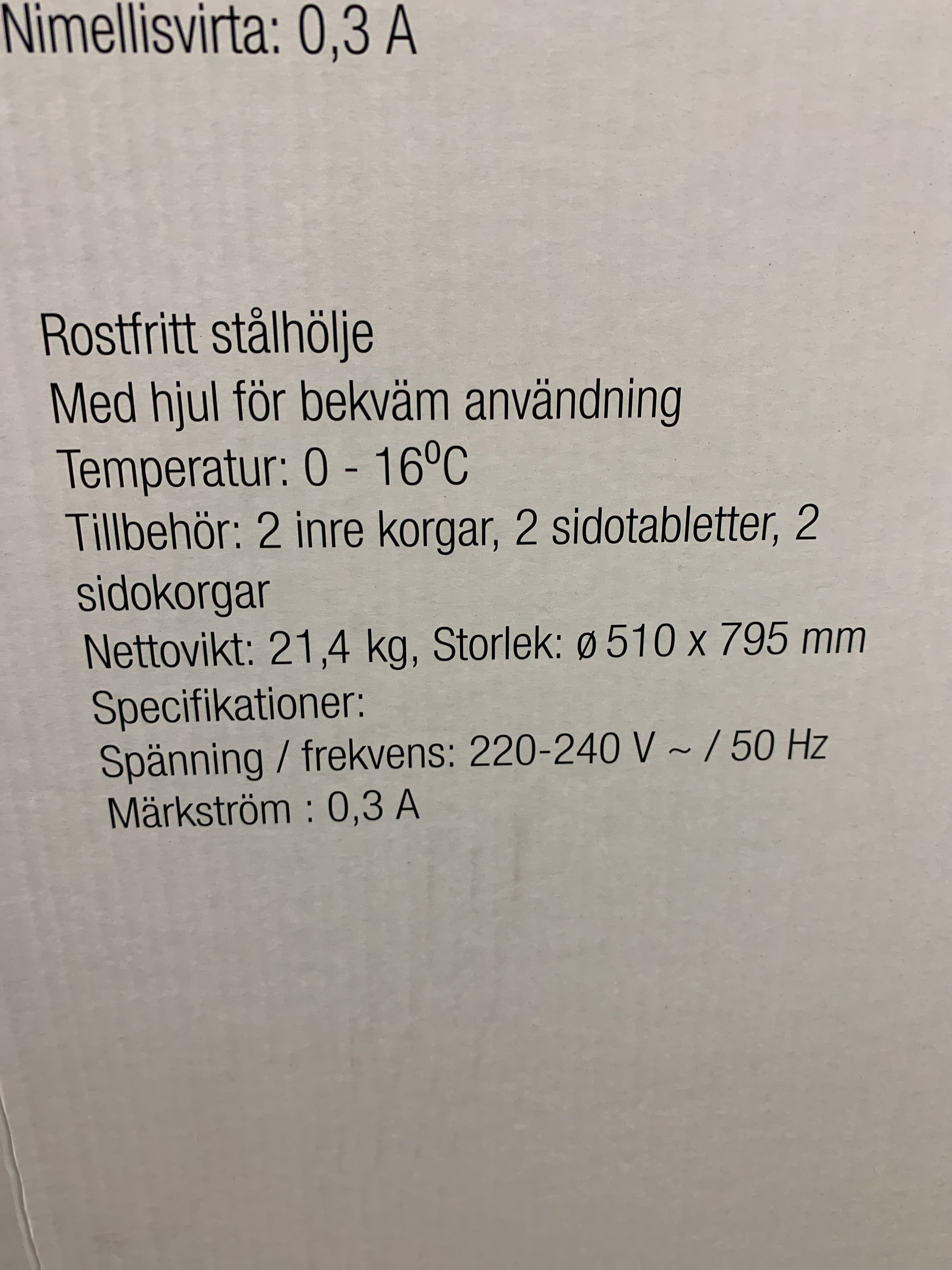 The party cooler is made of stainless steel and has a glass lid with a plastic edge that keeps the cold inside and flexible plastic wheels that simplify for you when you need to move it away. It has a height of 77cm and a diameter of 46cm, comes with a white protective film that must be removed before using the party cool. The temperature can be easily adjusted between 0-16 ° C depending on what you choose to store in it. It is also equipped with two side tables and two baskets for extra storage. Keep in mind that the Partycooler has a higher noise level when it cools down and may sound a little during this time. See energy certificate with sound level. Remember to avoid transporting it lying down. If you do, it needs to stand upright for 12 hours before you start the first time.