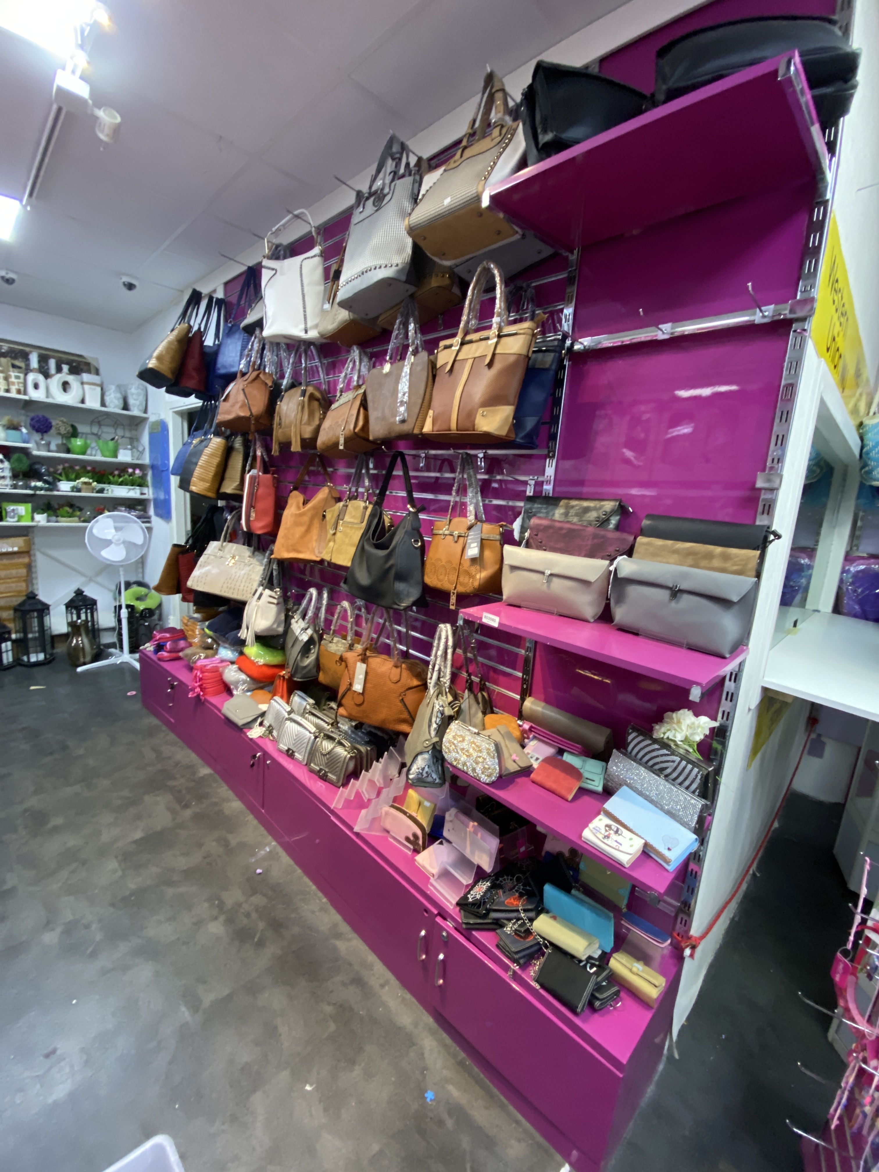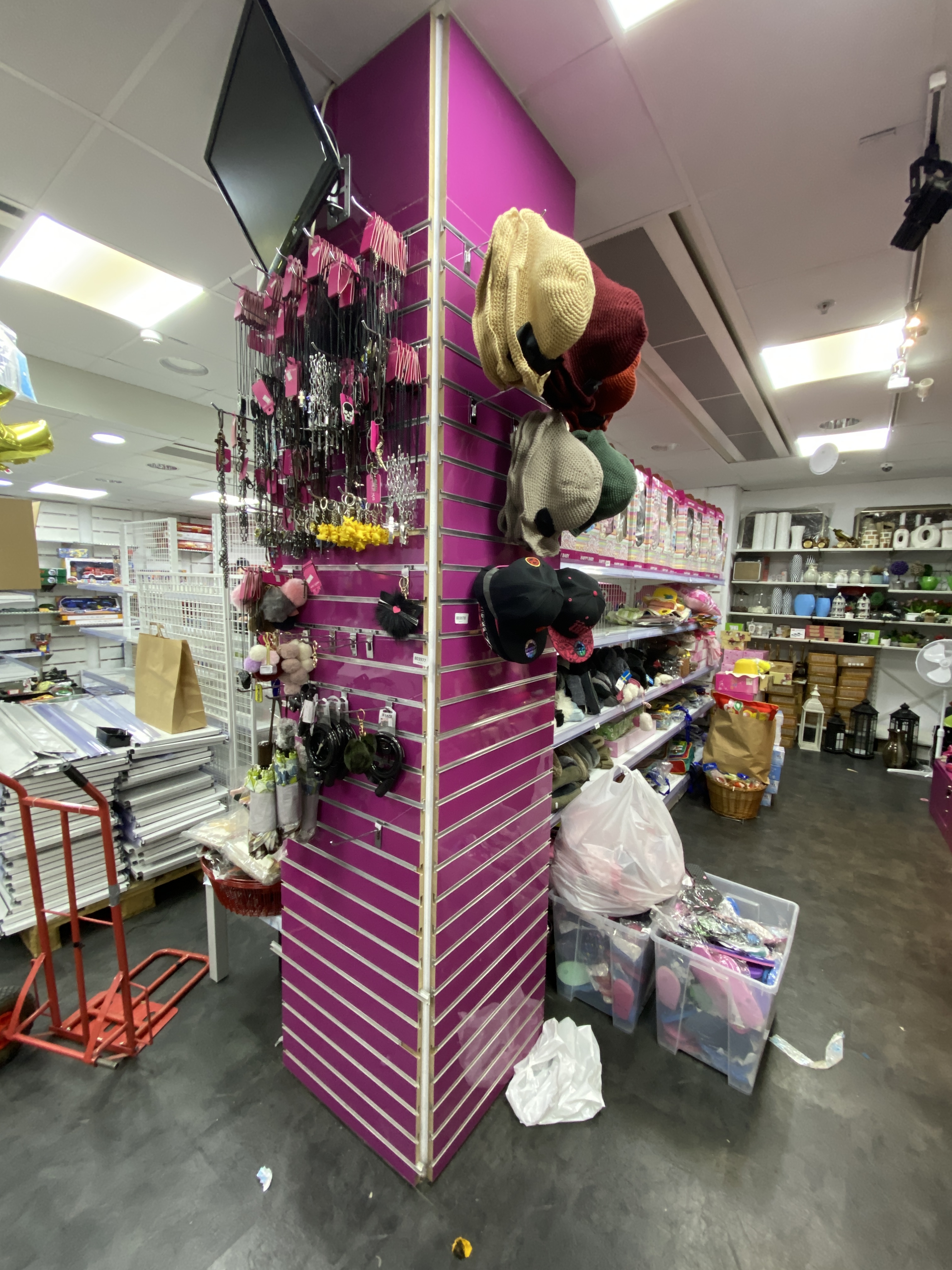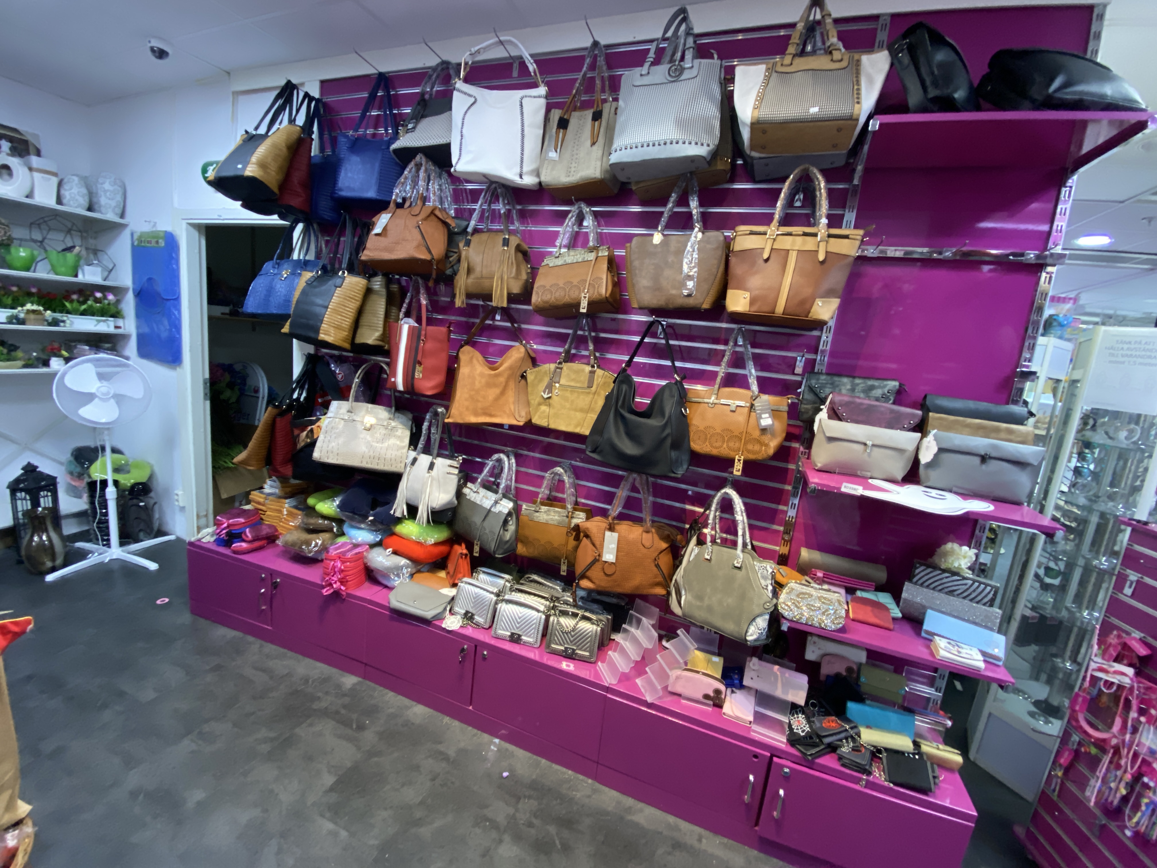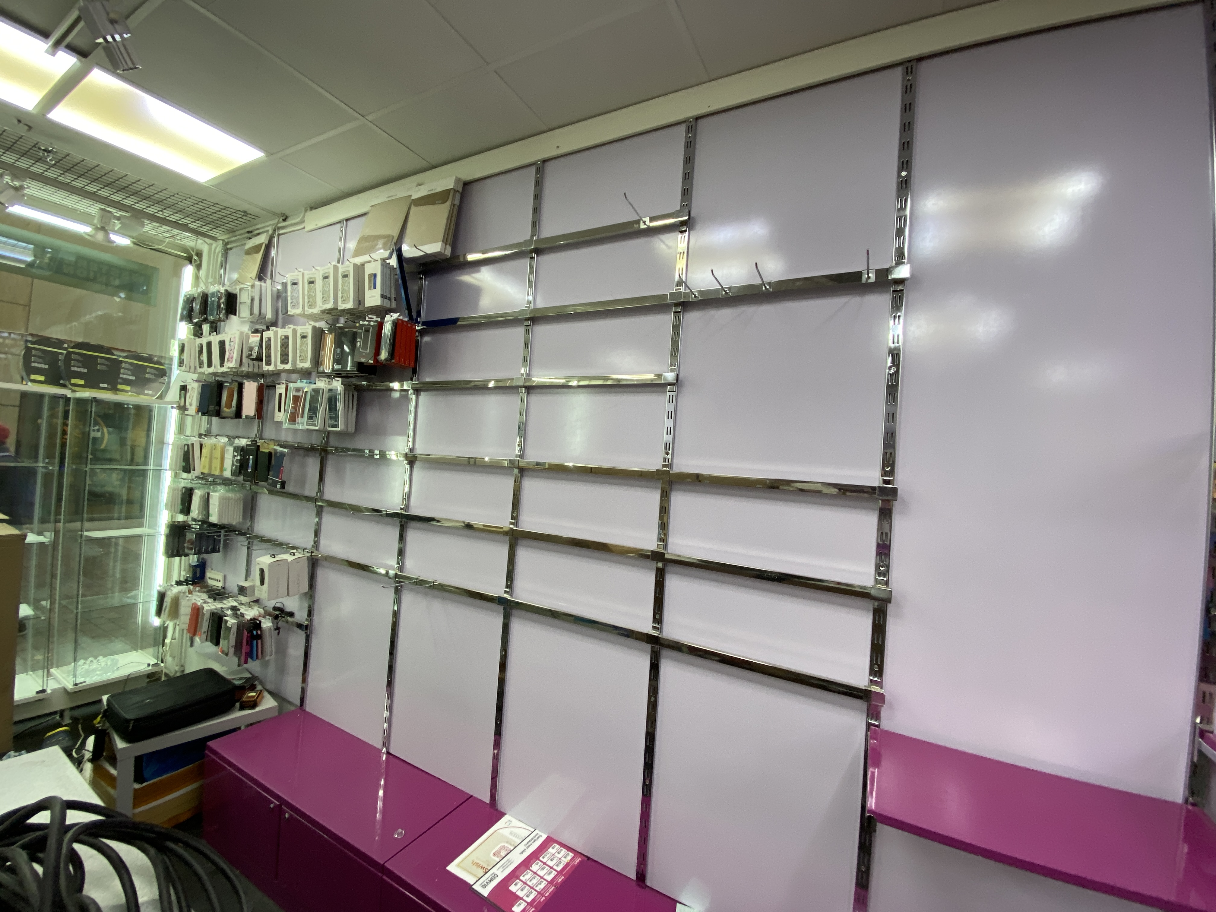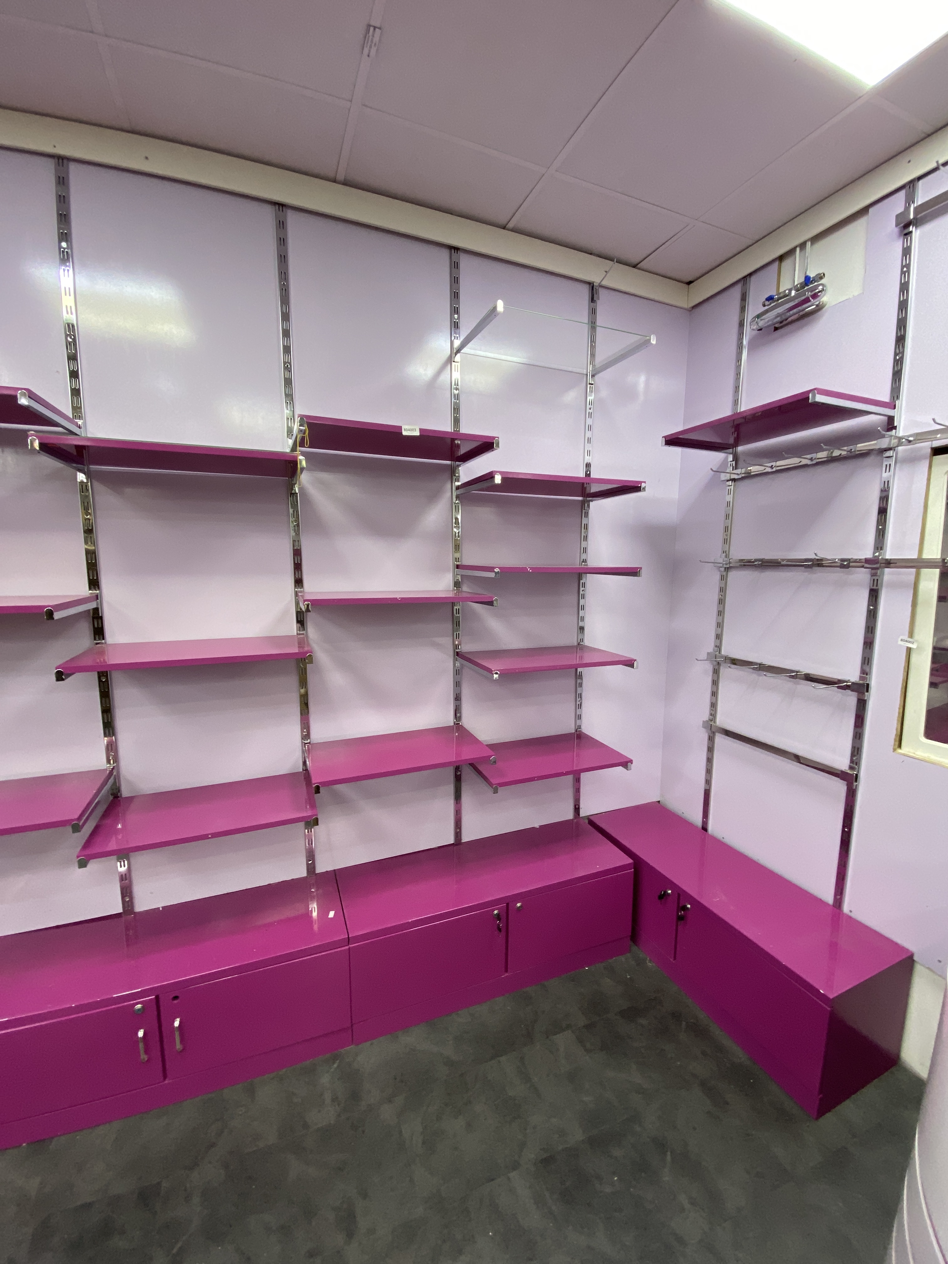 Shop fittings with wall-hung shelves, about 35 sections.