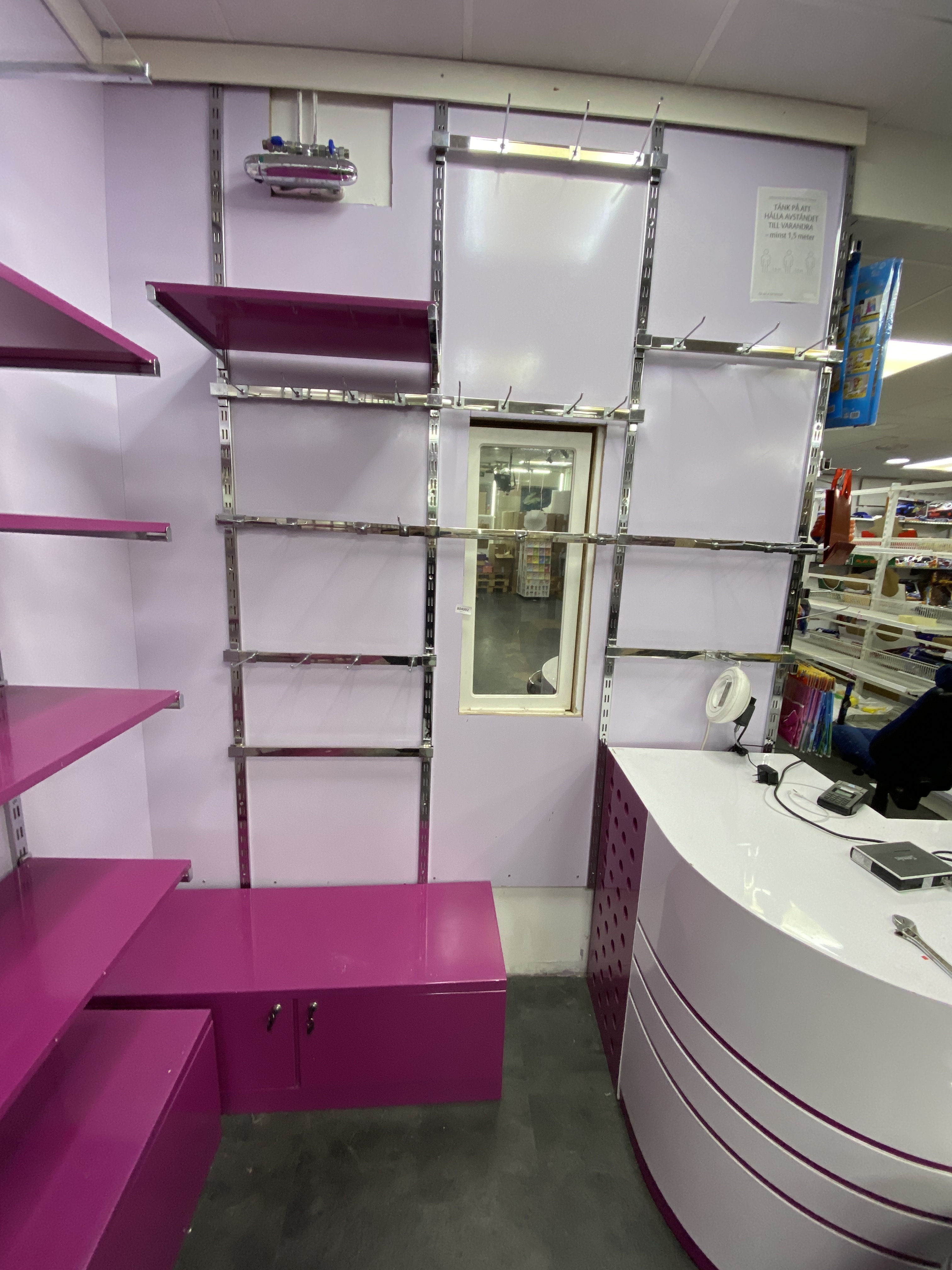 - A section with floor-standing sheet metal shelves with lighting, (4x100 cm)
