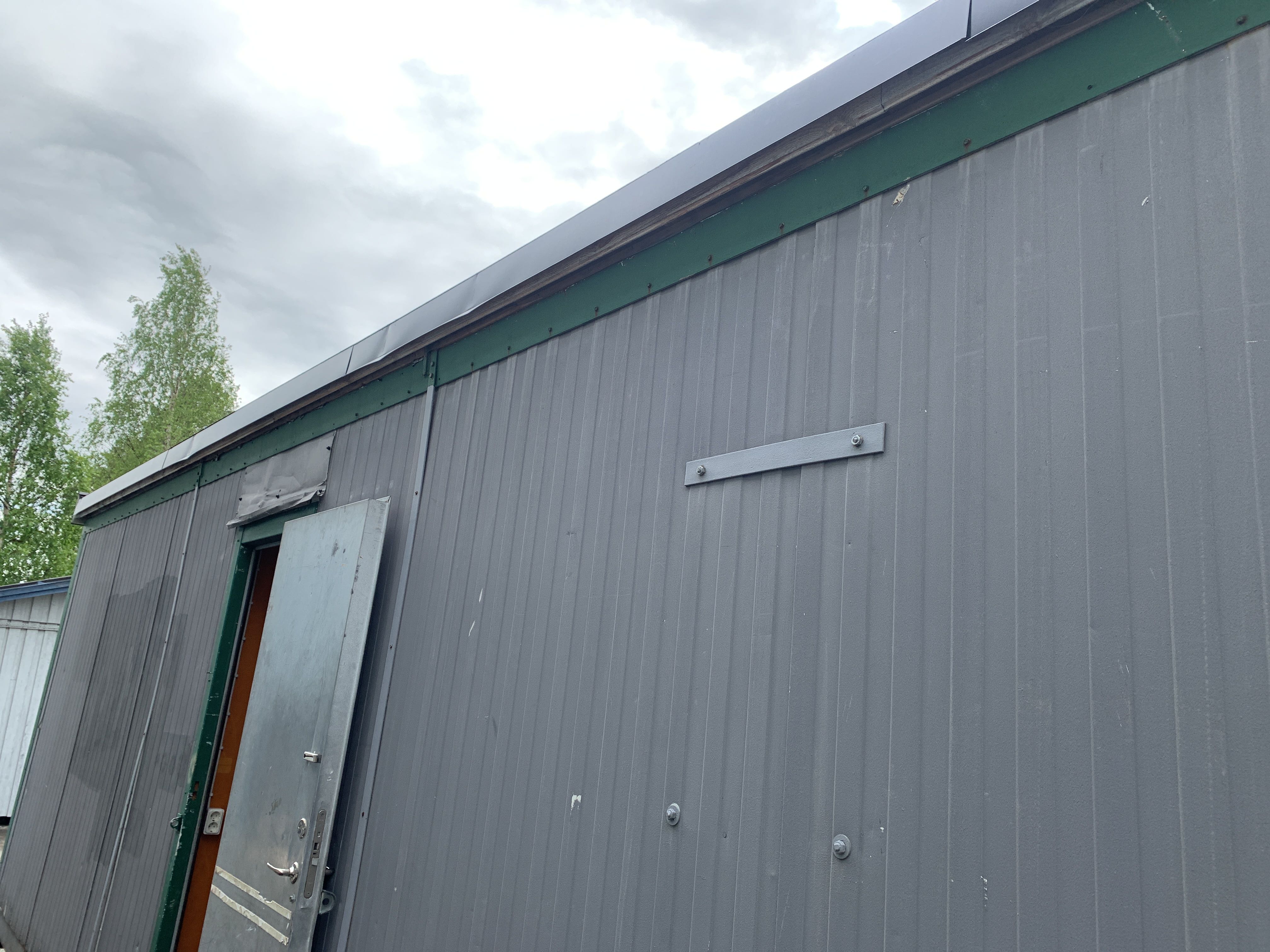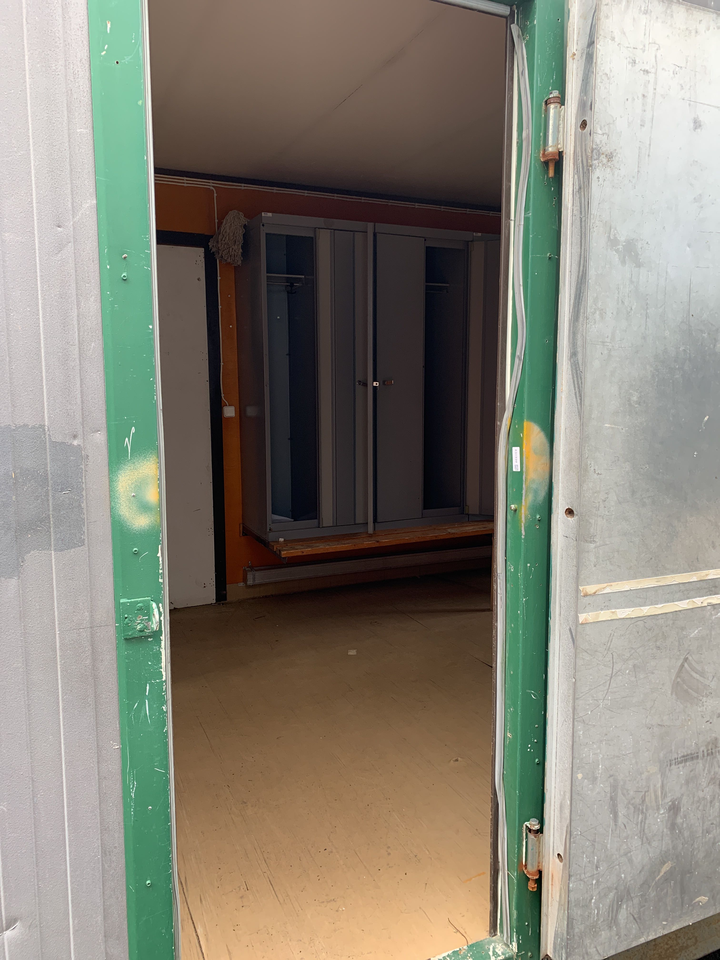 Storage room on demountable frame, furnished as a changing room and storage.