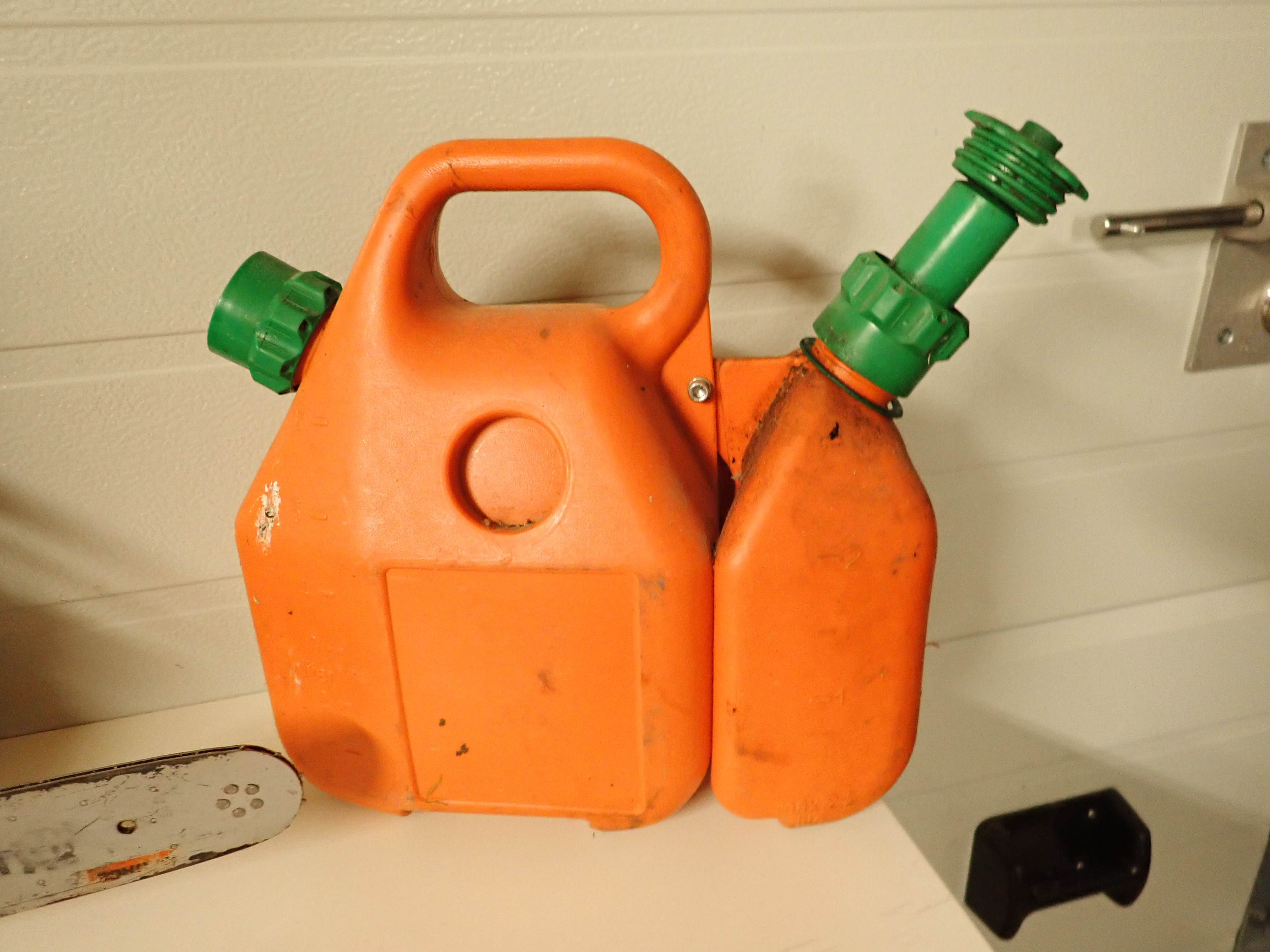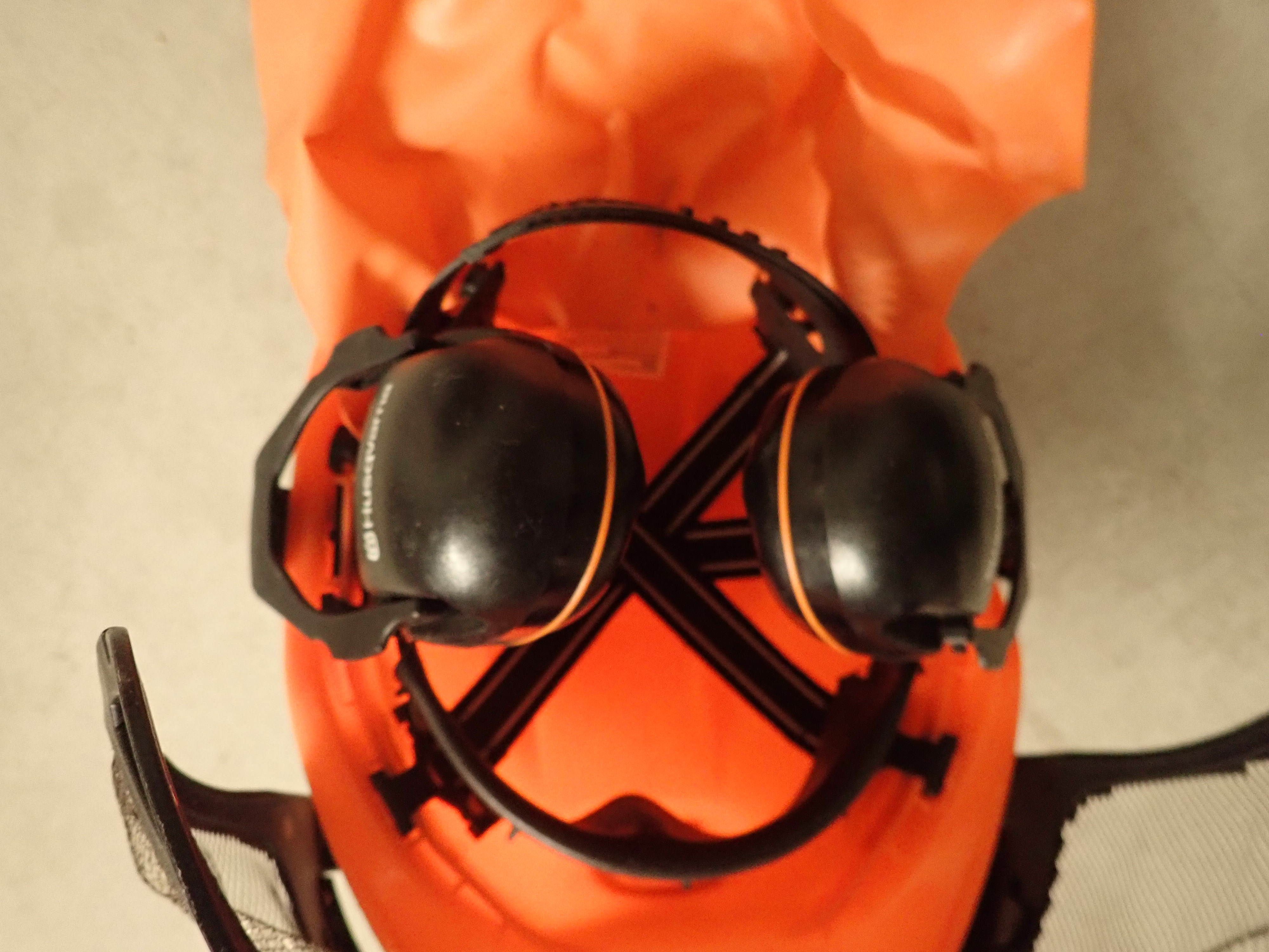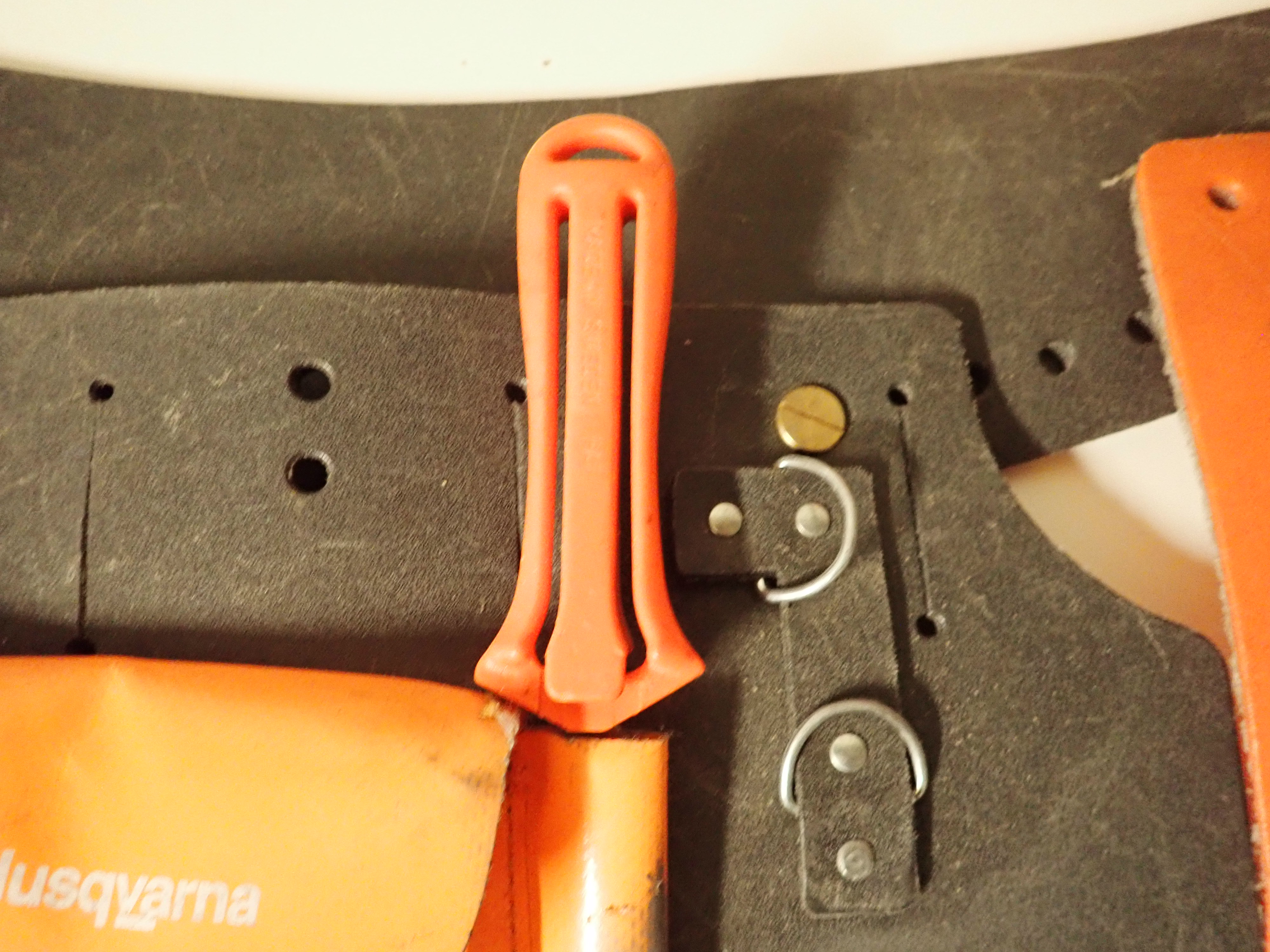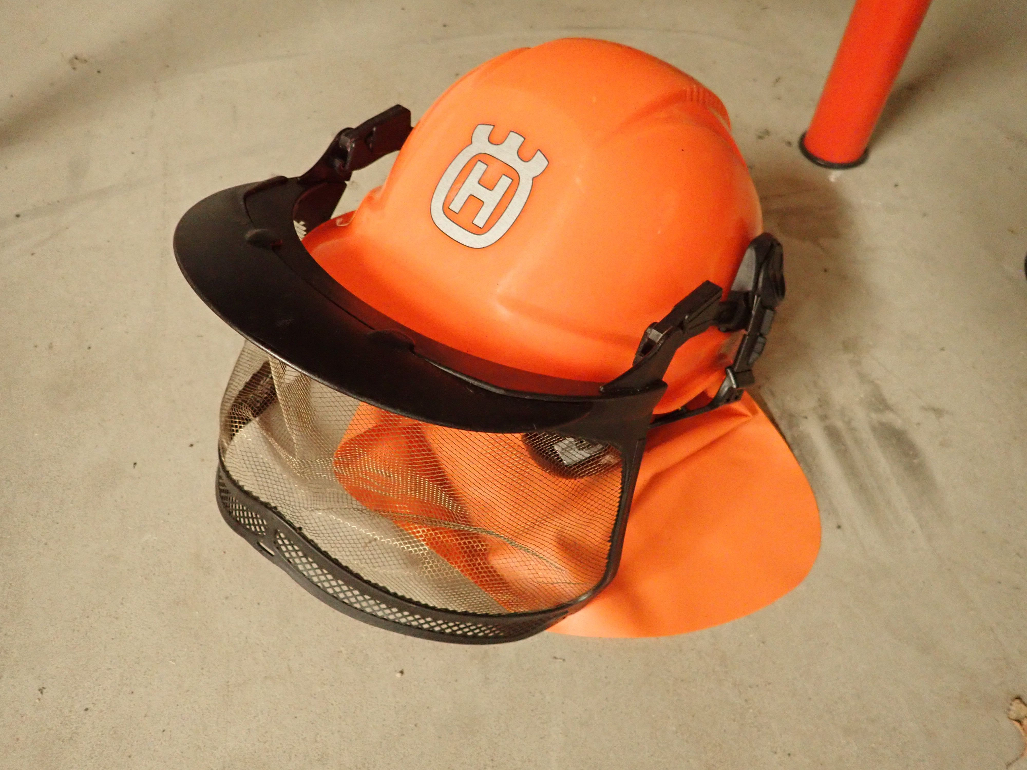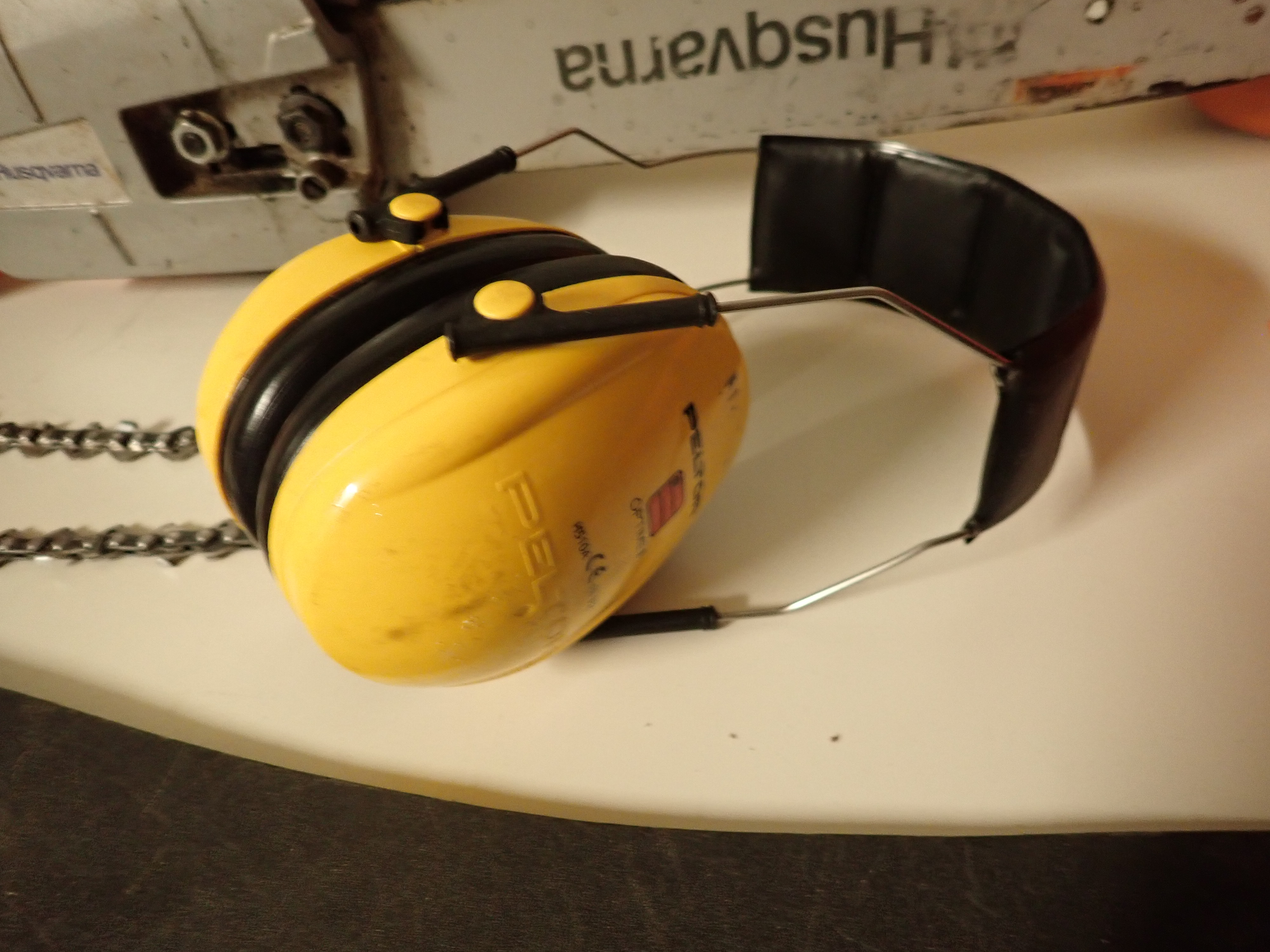 Comes with a timber belt containing various accessories, Kombidunk that lacks one lid, Husqvarna protective helmet with covers, and a pair of Peltor hearing covers.