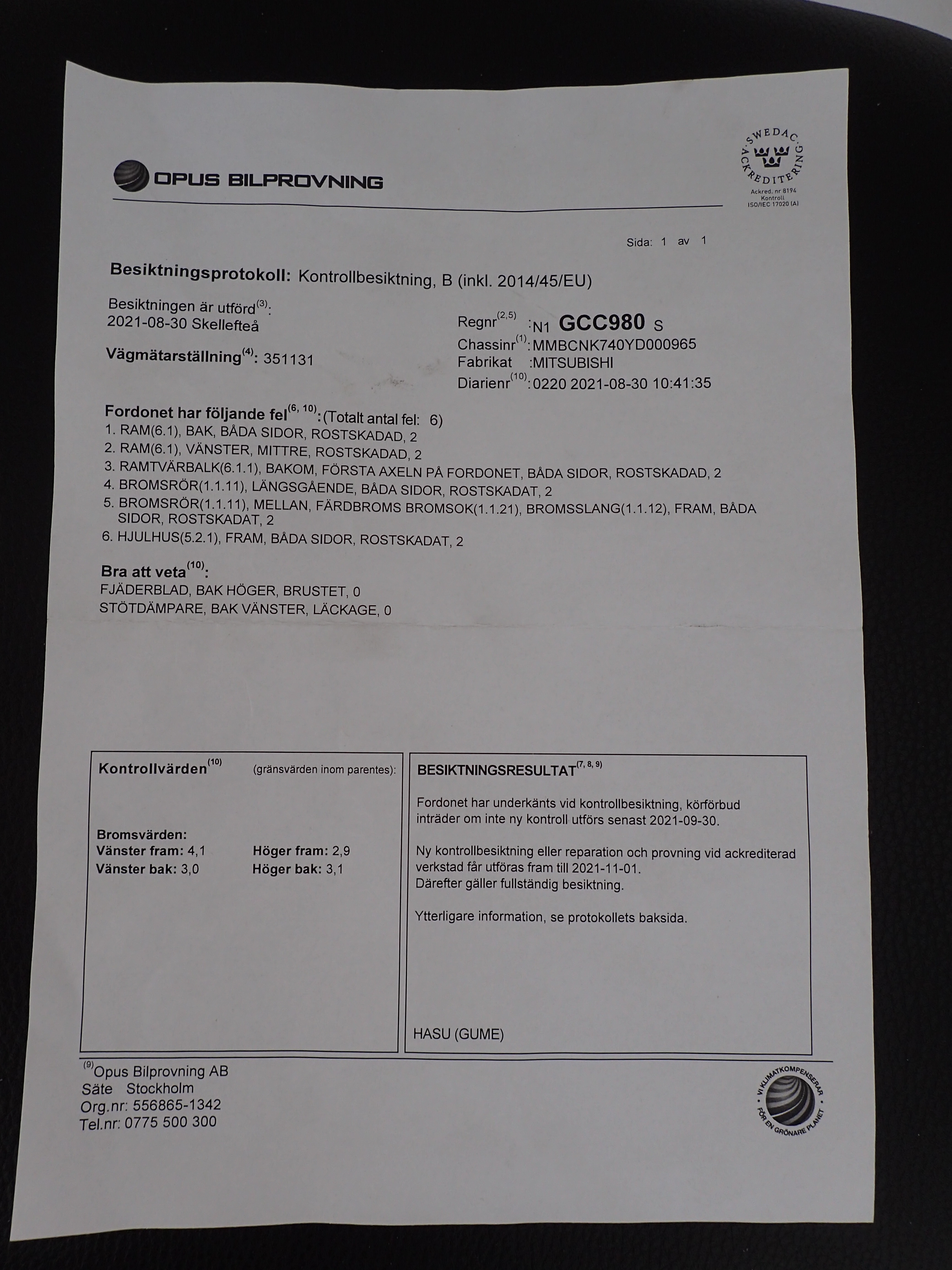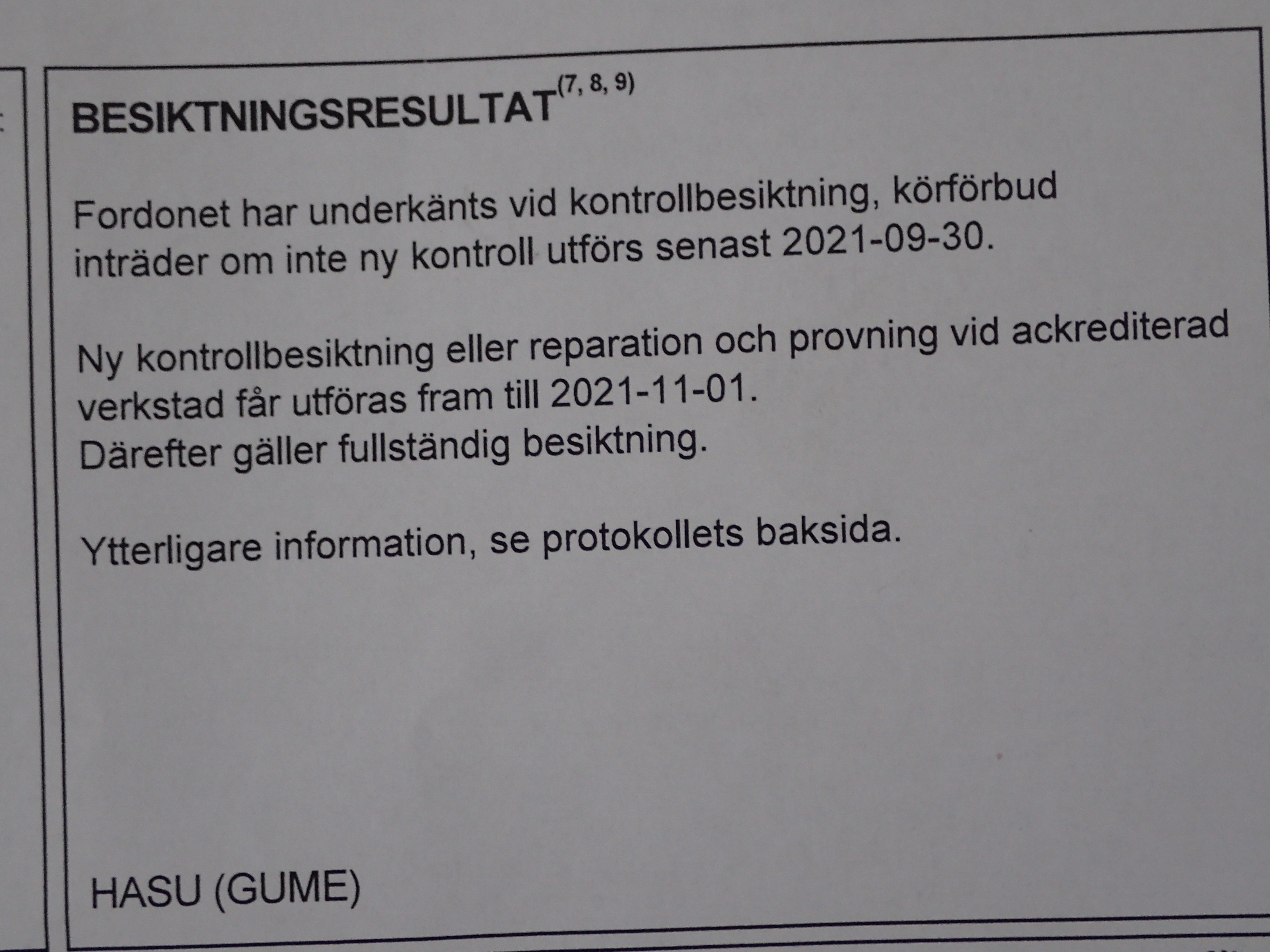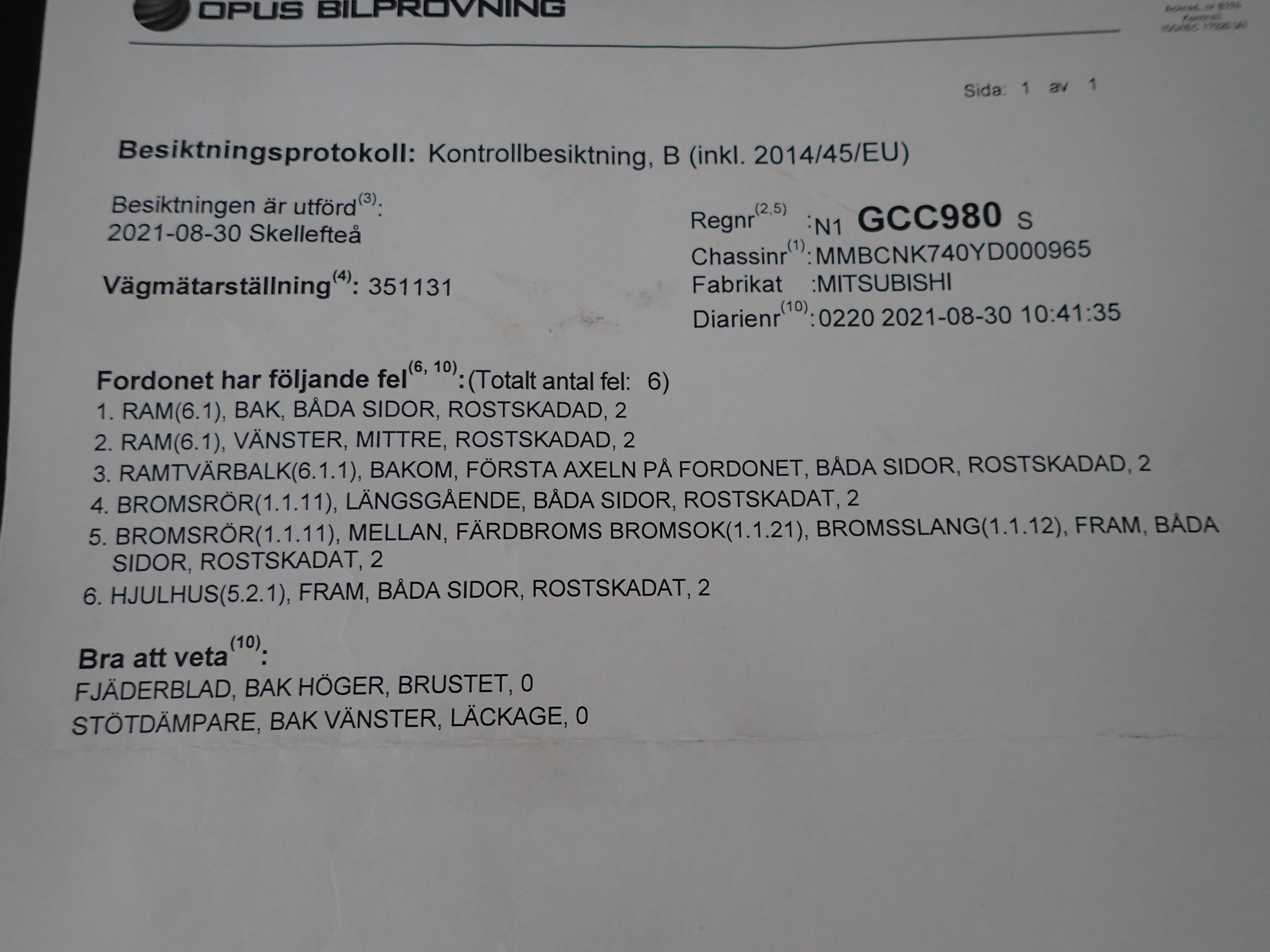 The car is inspected 21-08-30 and received a number of 2s for re-inspection. And 2 pcs good to know. So we consider the car as a repair object.