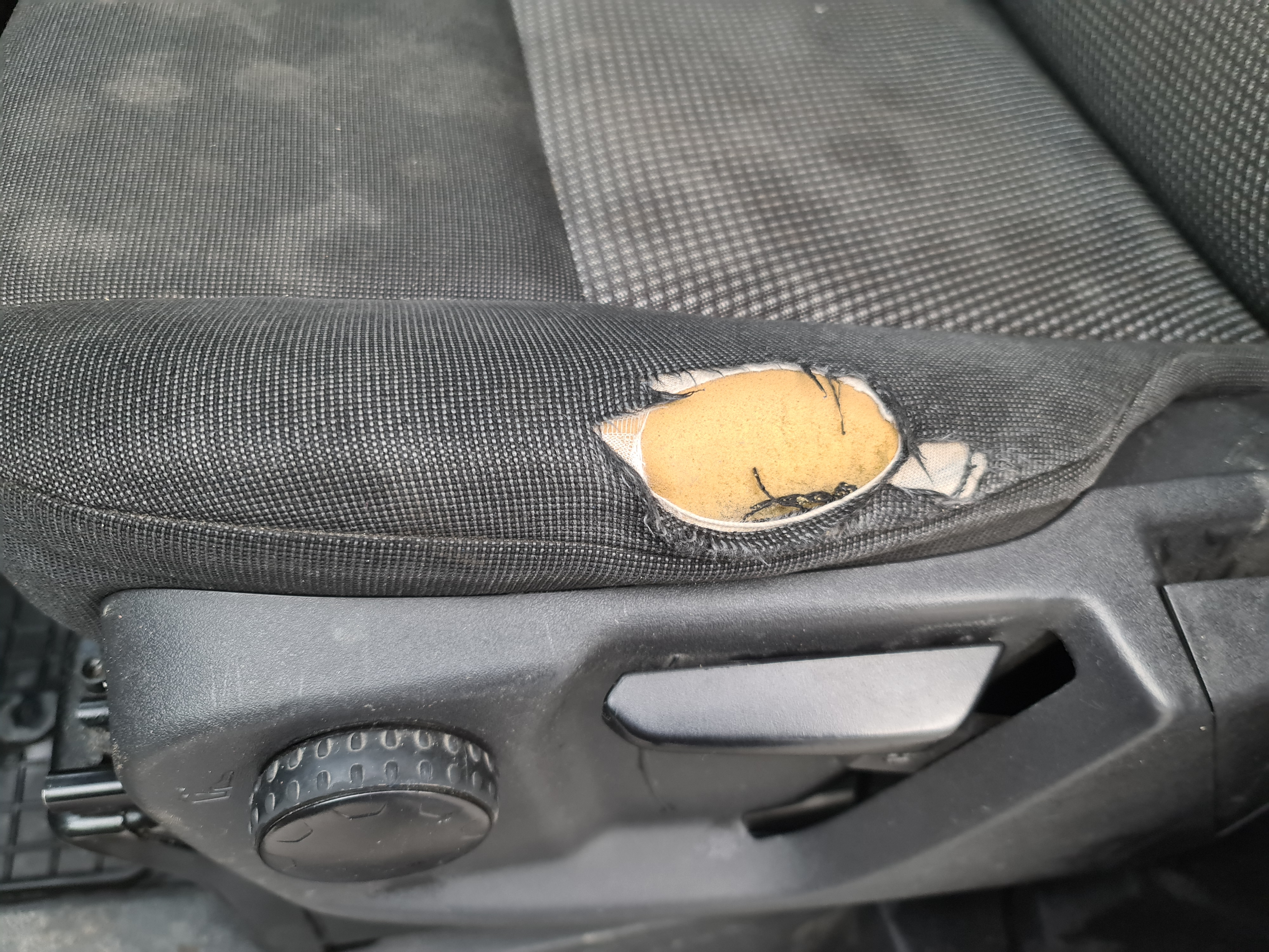 Dirty upholstery and holes in the driver's seat.