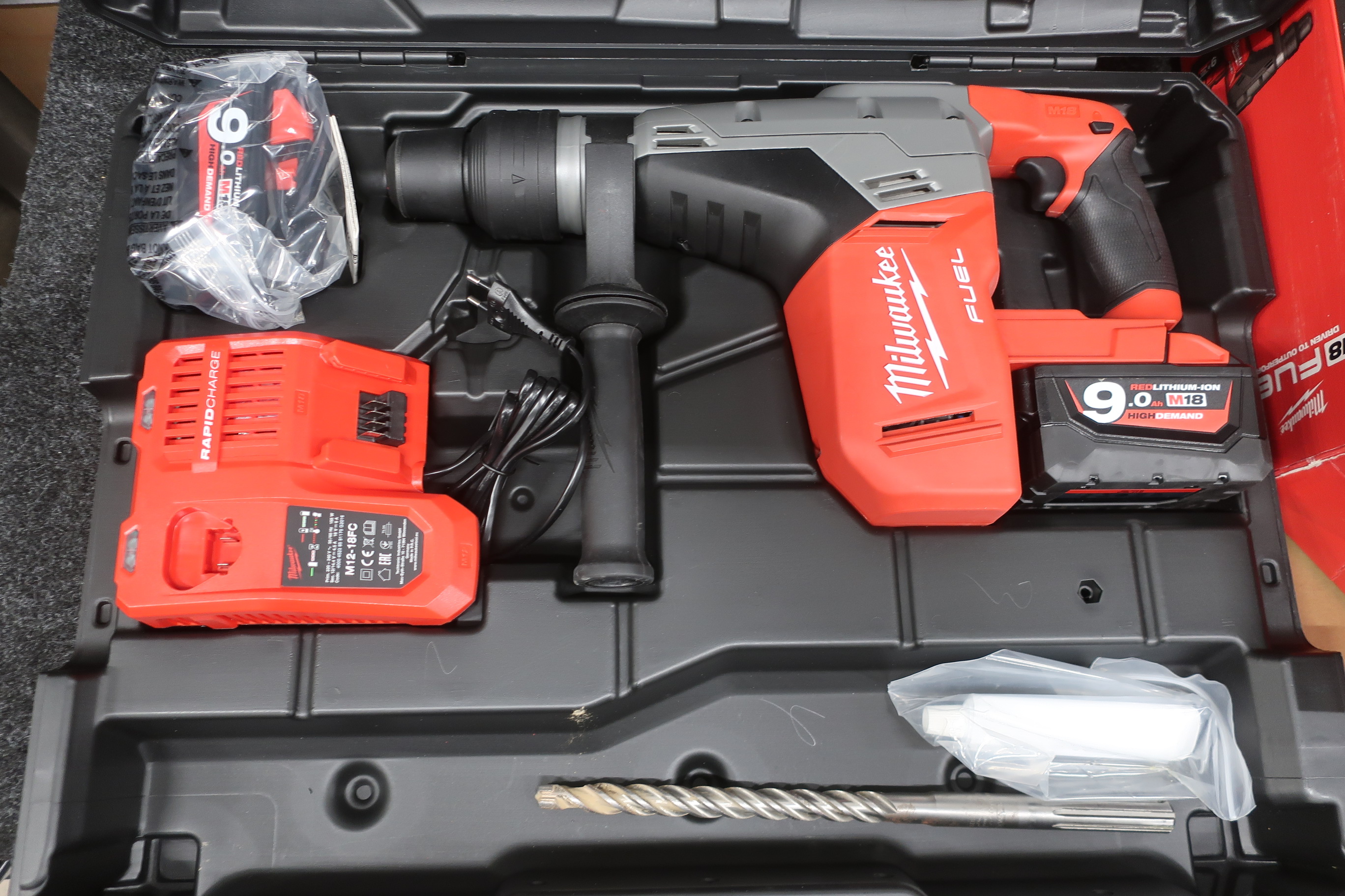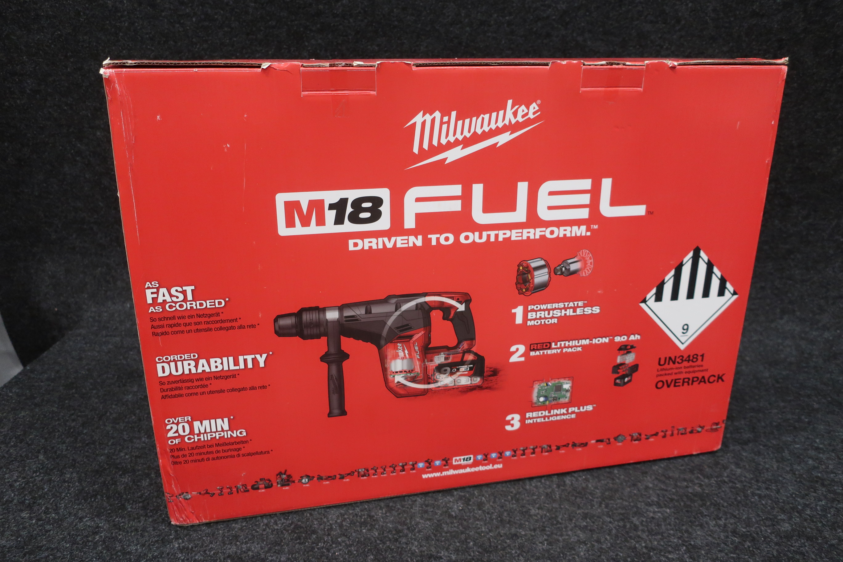 18V hammer drill with carbon brushless motor and SDS-Max bracket. It has an impact strength of 6.1J and a drilling capacity in concrete of 40 mm.