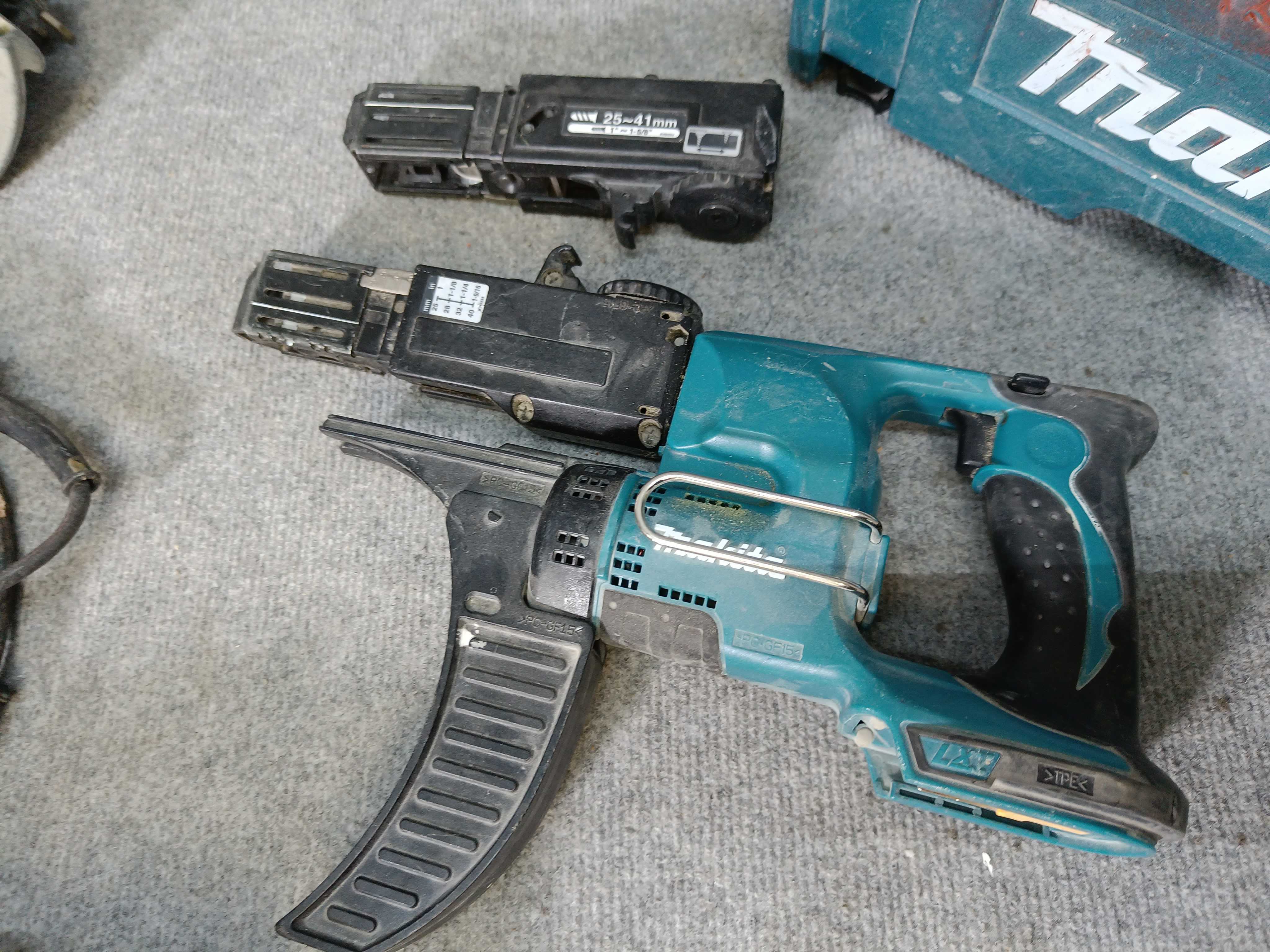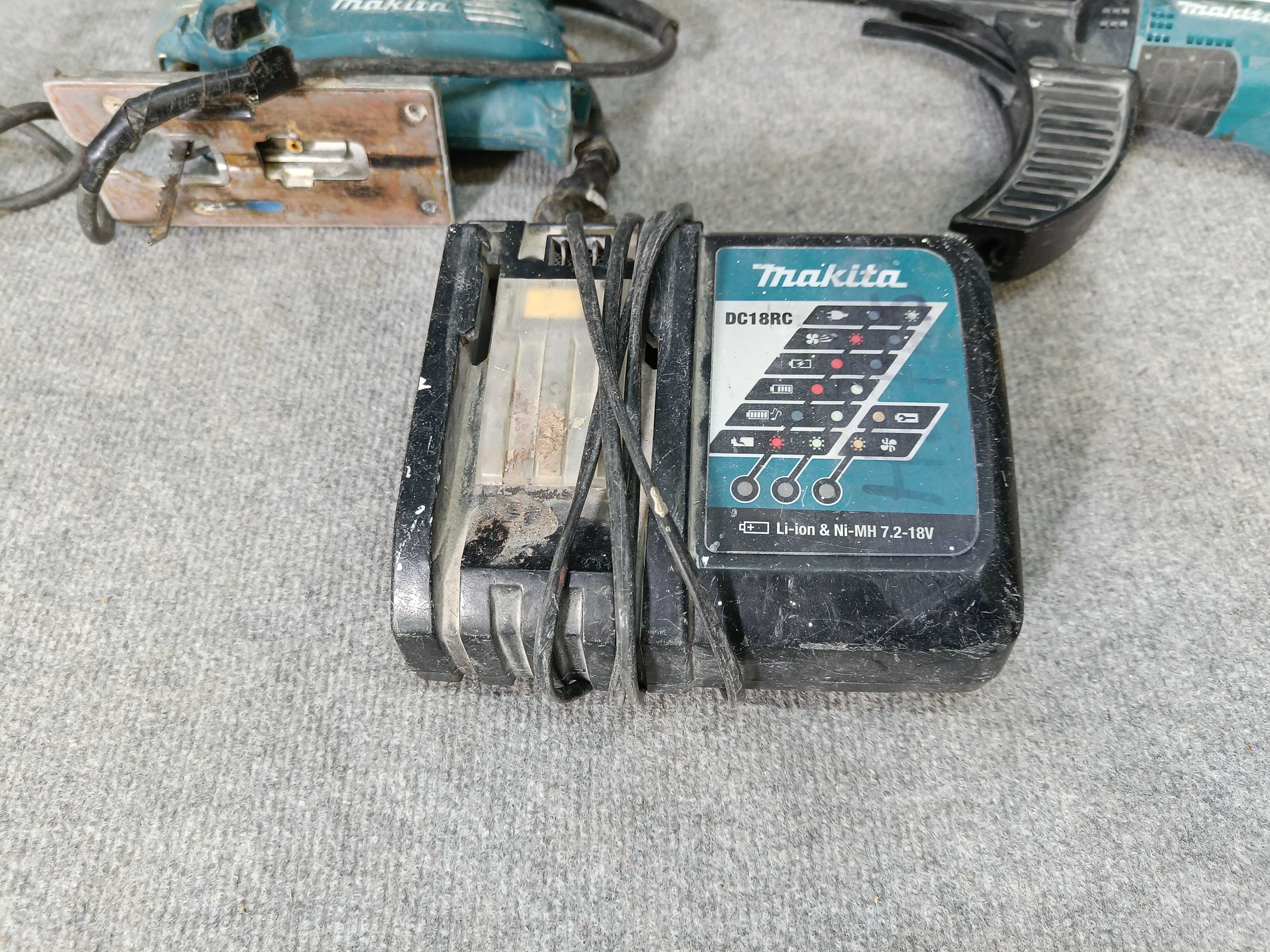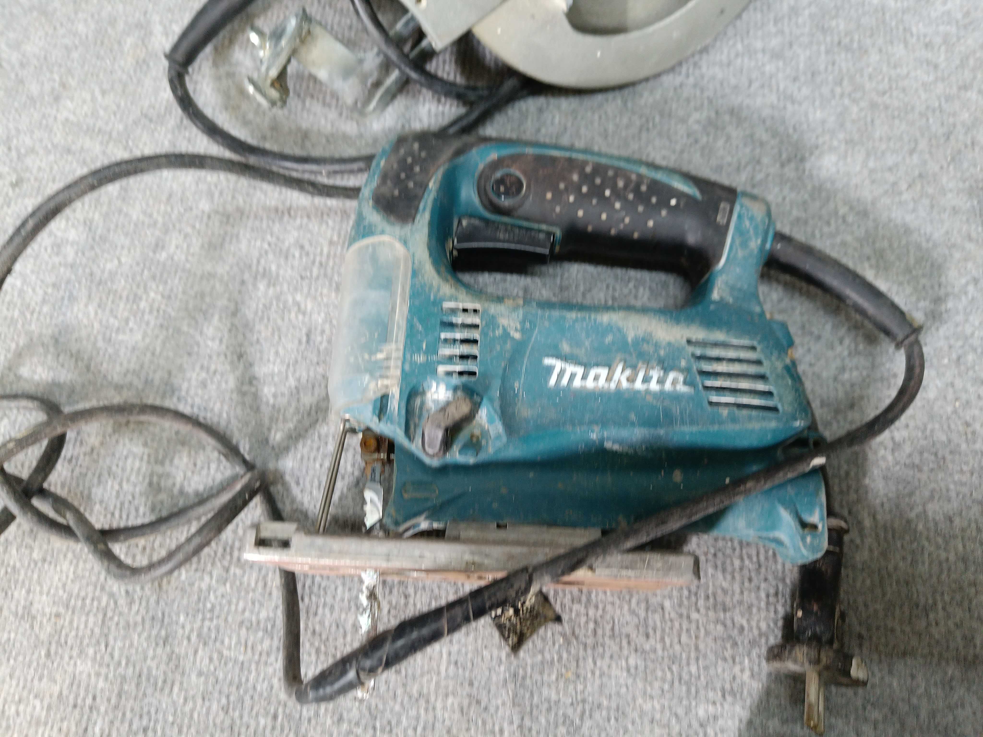 - Circular saw, jigsaw, screwdriver (battery missing), charger, drawer.