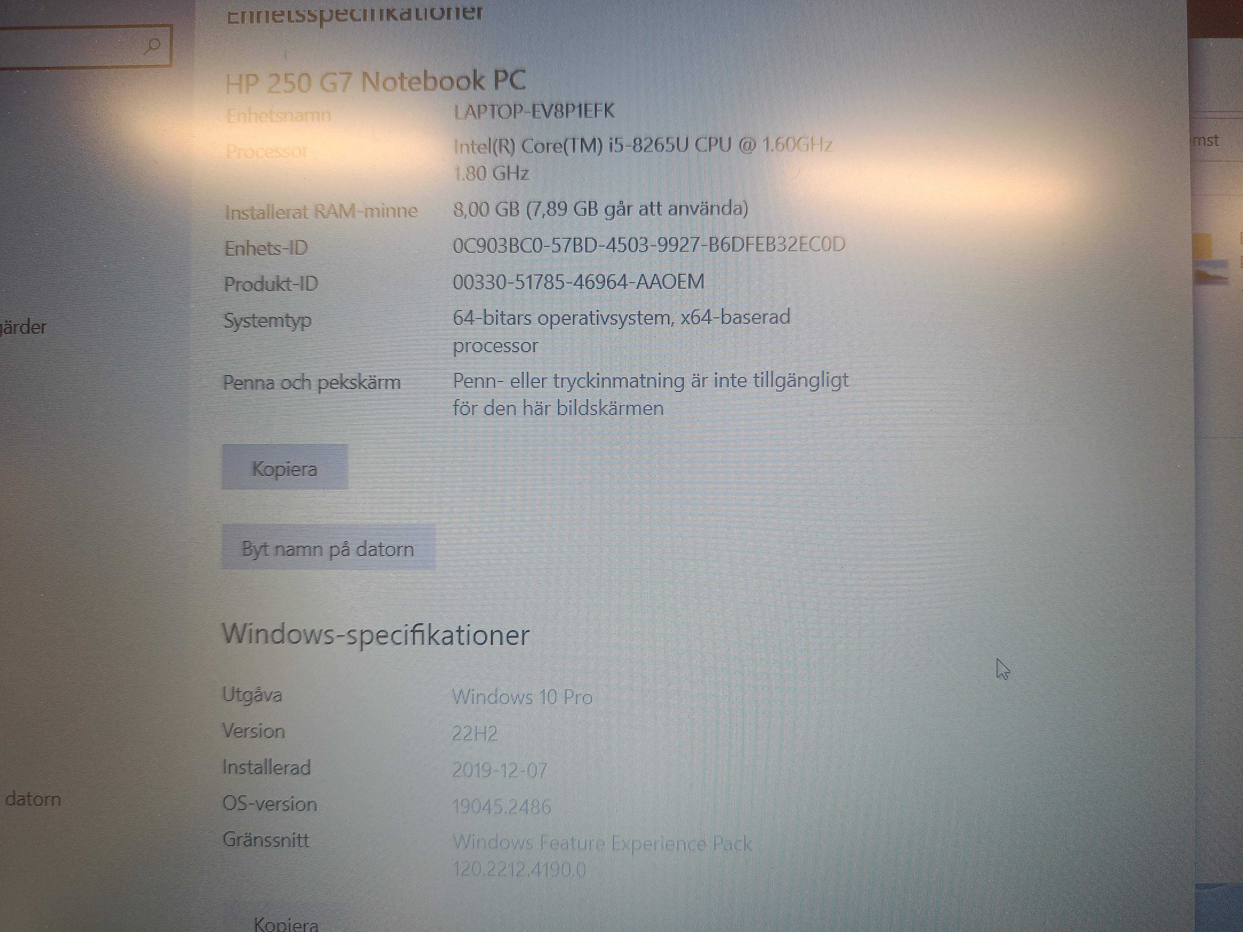 1 HP 250 G7. Windows 10 Pro, Processor I5-8265U
