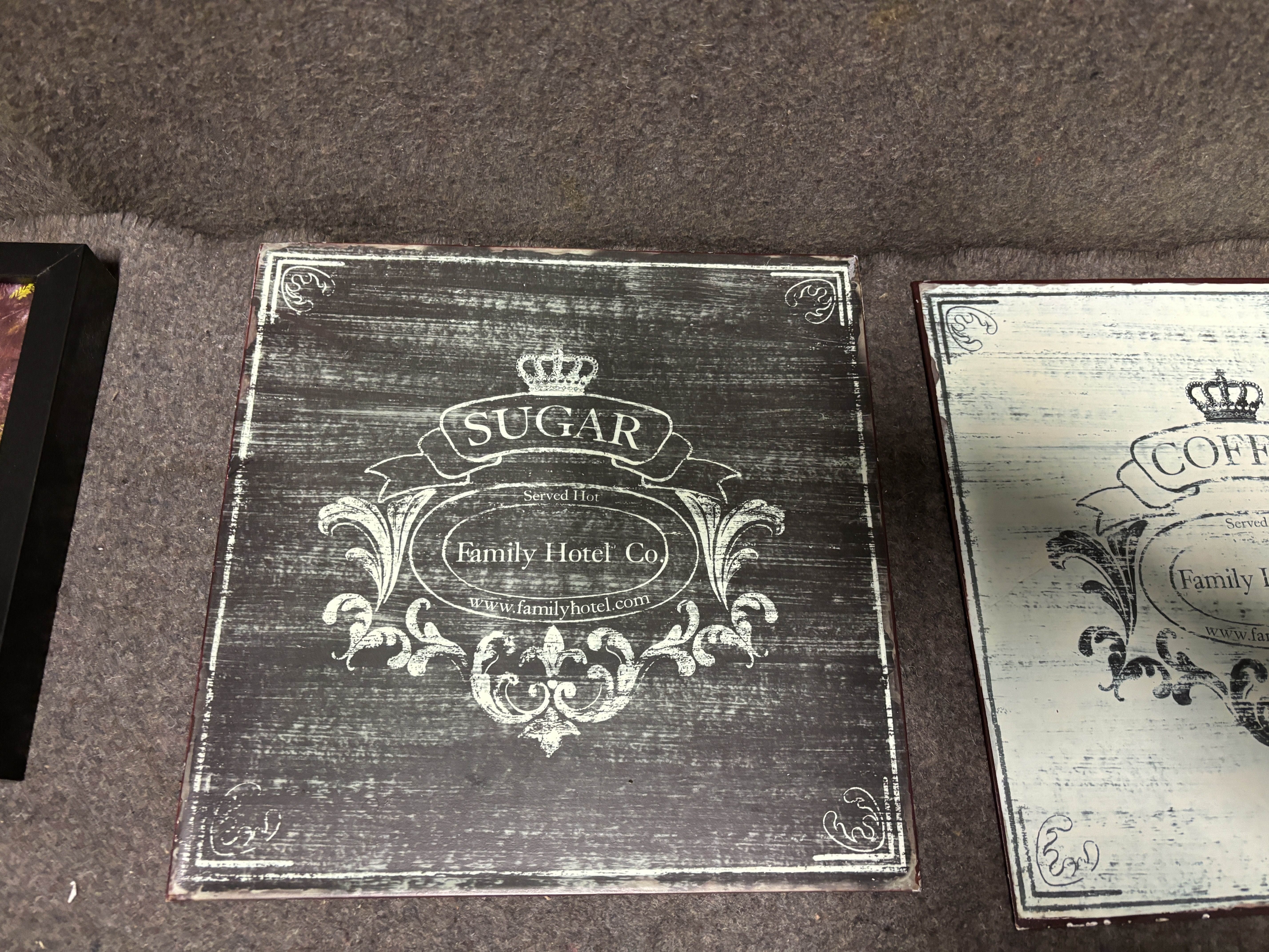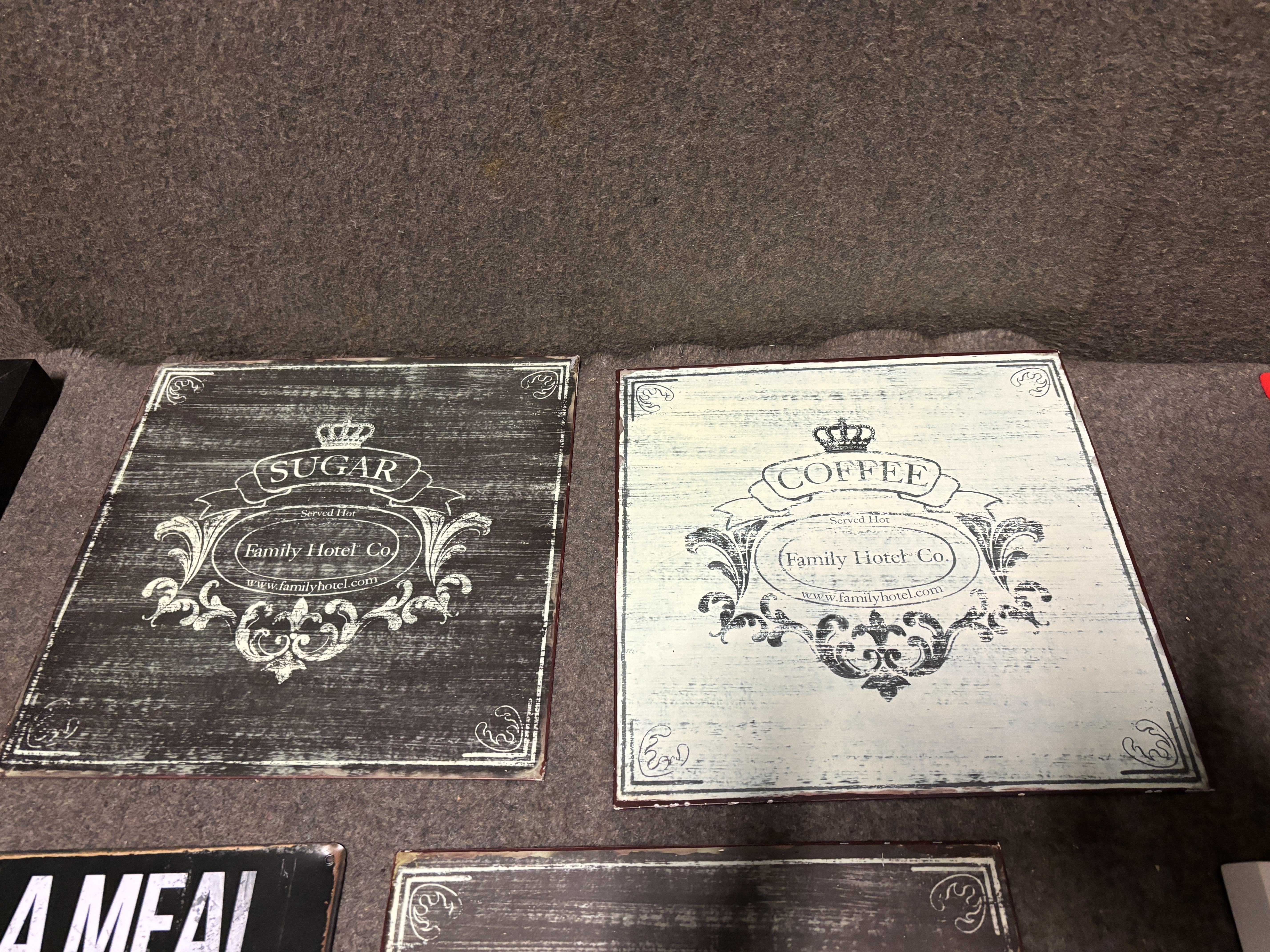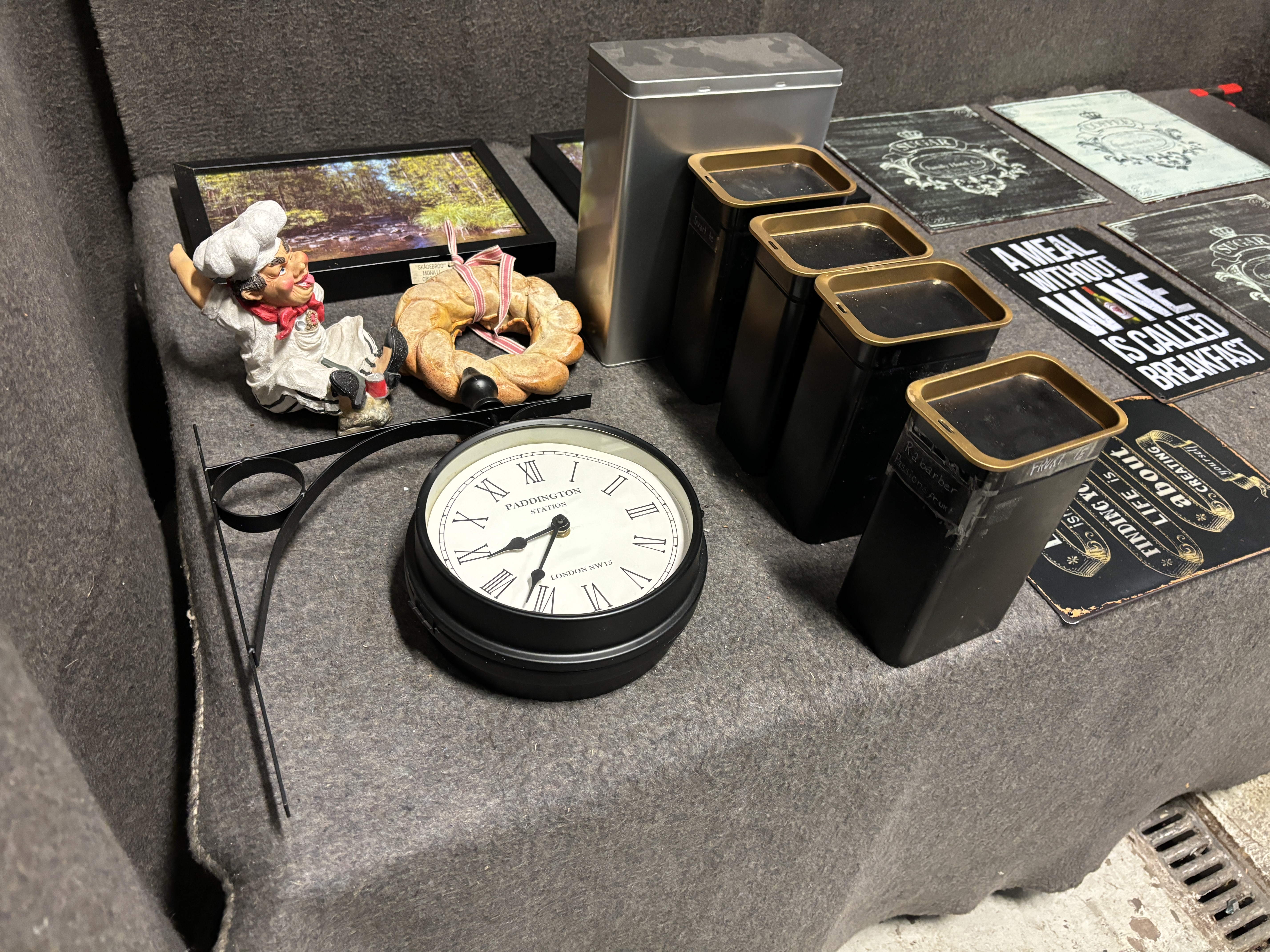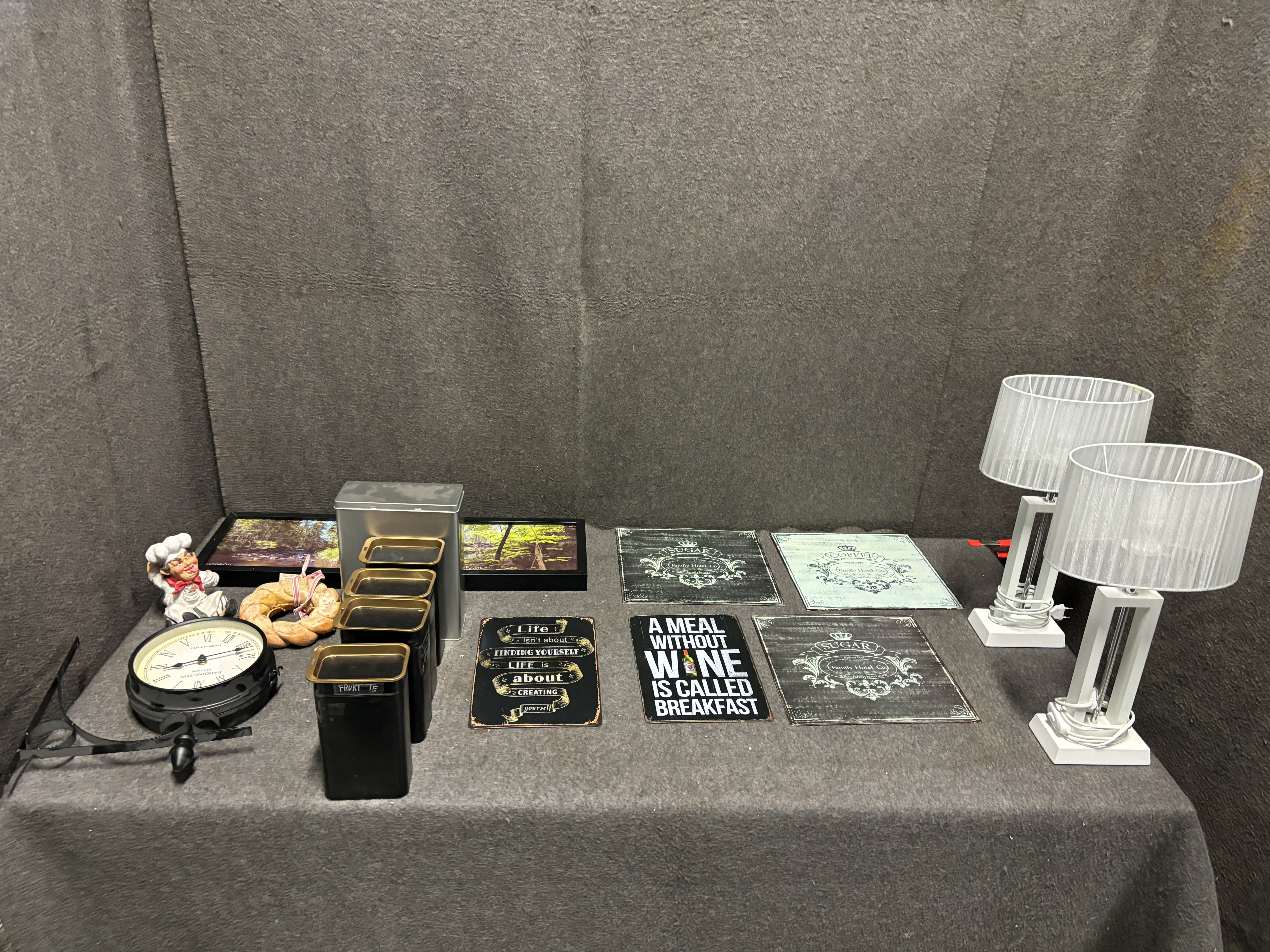 Tin signs, lamps, clock, tea cans etc