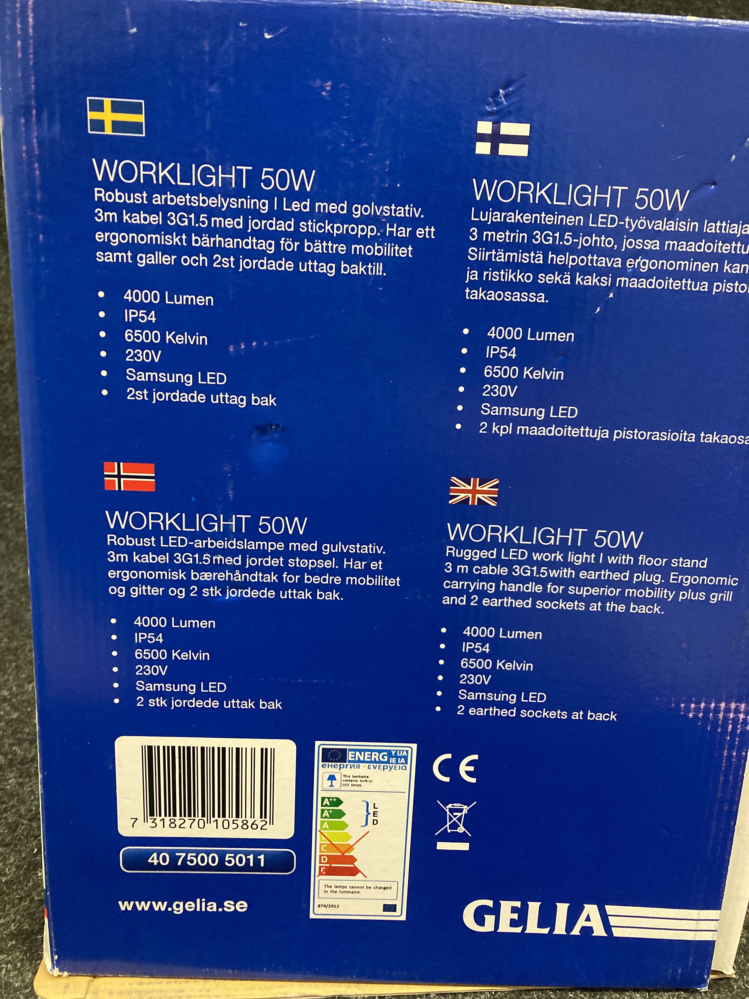 A 50W work lamp that generates 4000 lumens. The LED lamp is equipped with a stand and frosted glass and has a burning time of 50,000 hours.