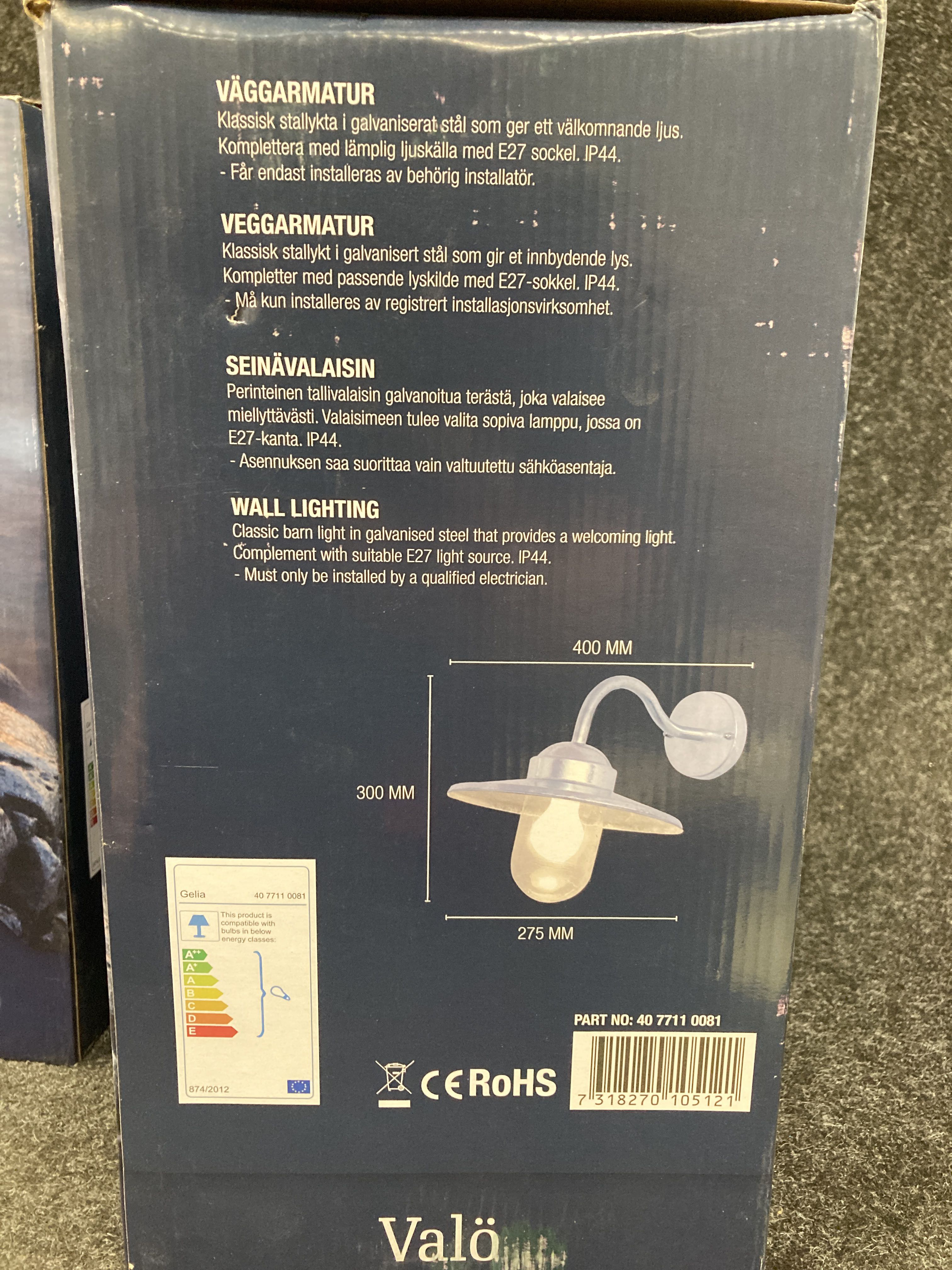 Wall luminaire in lantern model, intended for outdoor use. The luminaire is completed with light source with E27 socket and max 60 W (not included).
