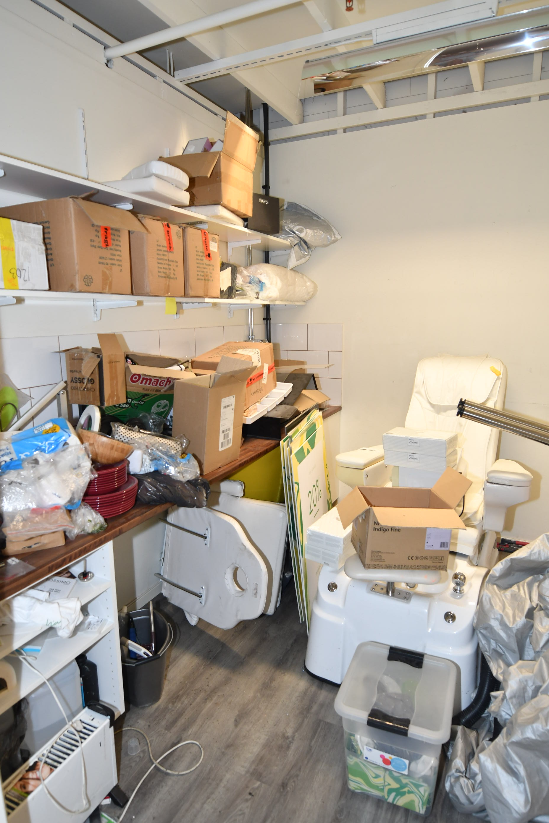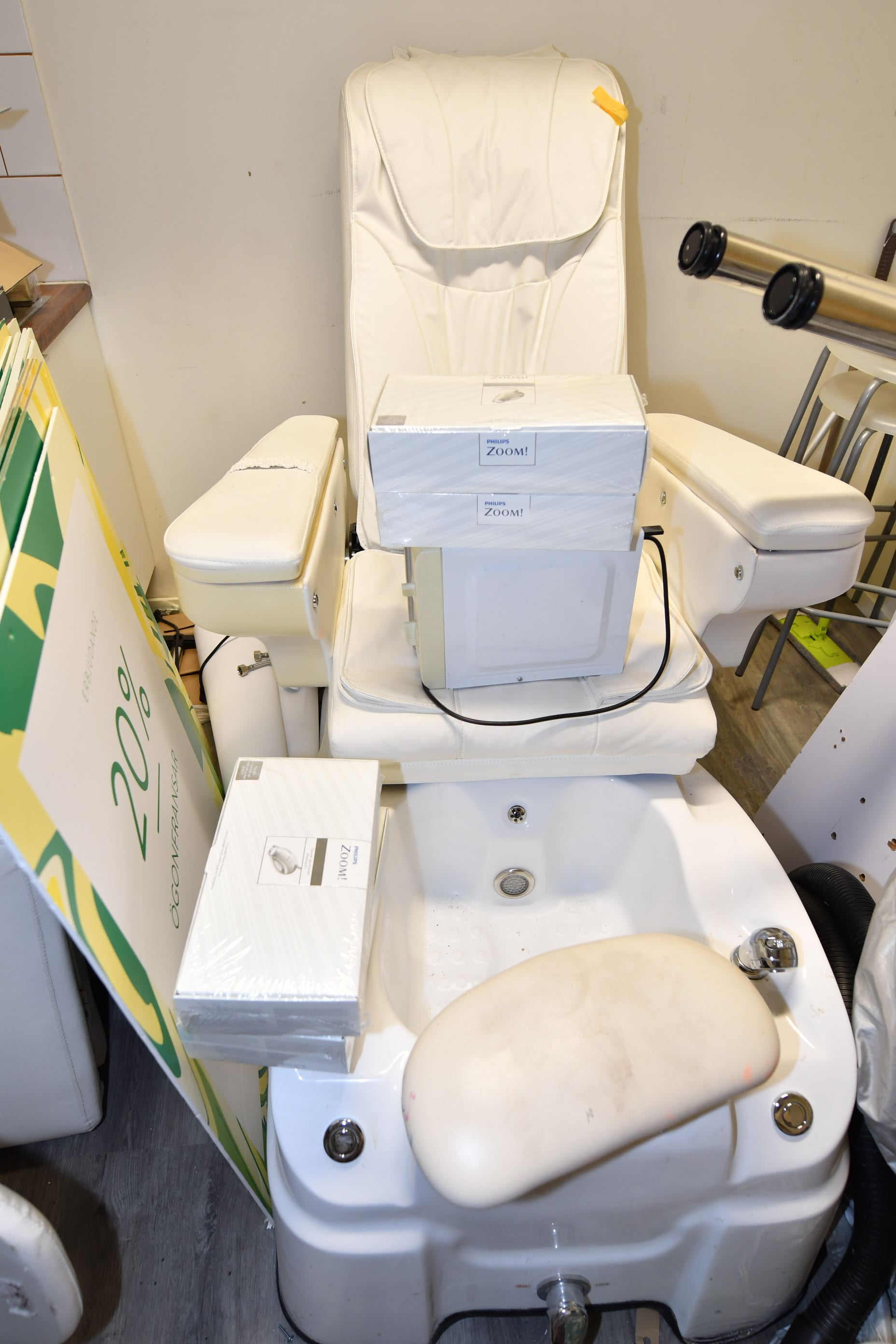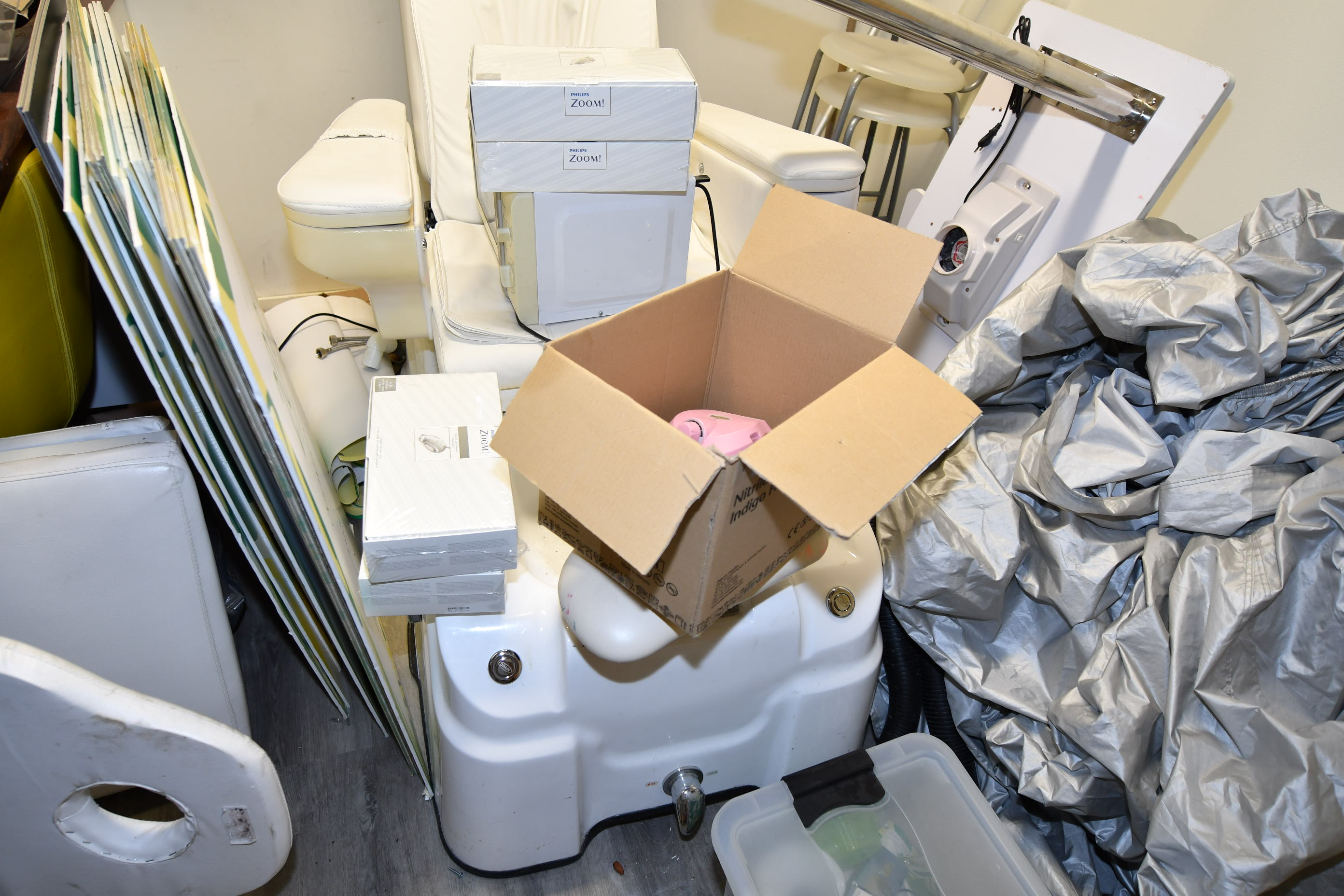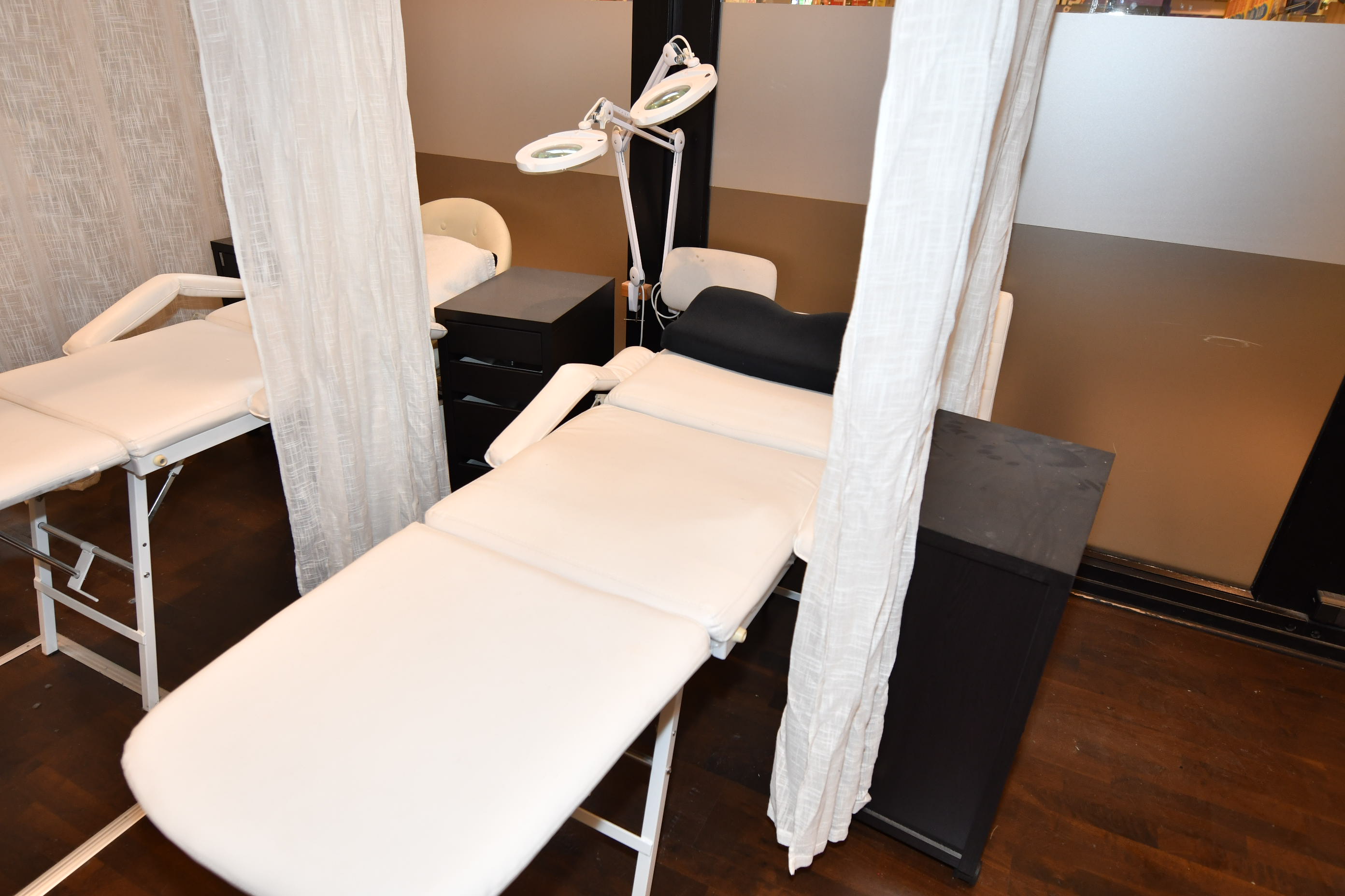 Nail sculpting equipment, eyelash extensions, pedicure equipment, treatment benches, treatment chairs, fairly large stock of lashes, towels, furniture, signs, chairs, etc.