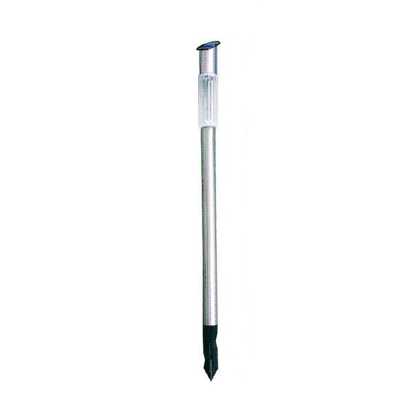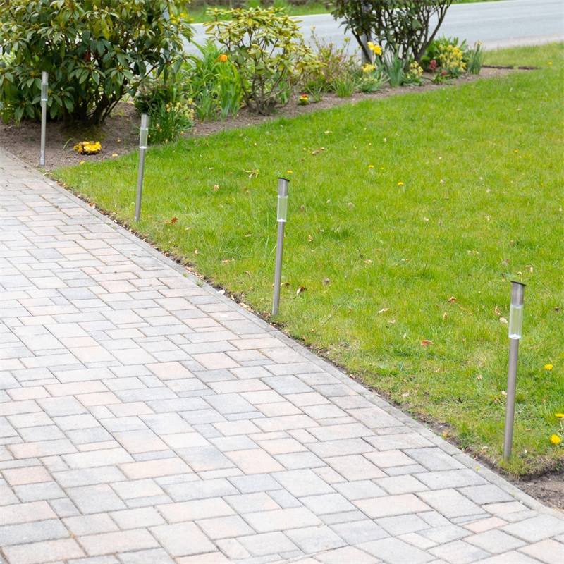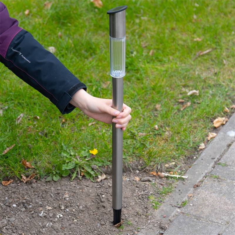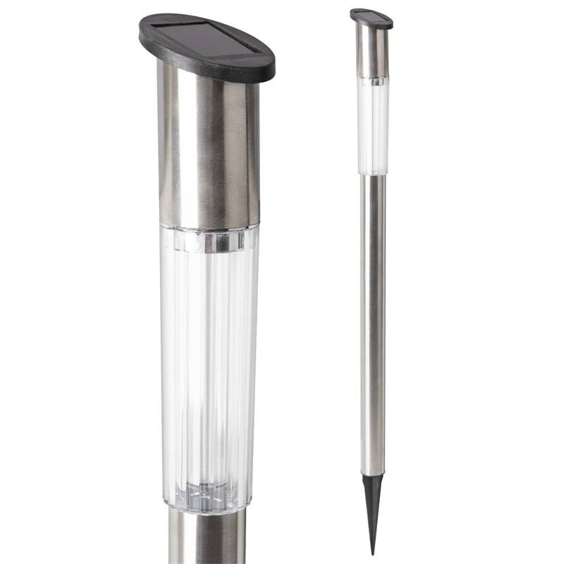 Stylish garden lighting in stainless steel, lit with warm white LEDs that are charged by the sun during the day and lit when darkness falls.