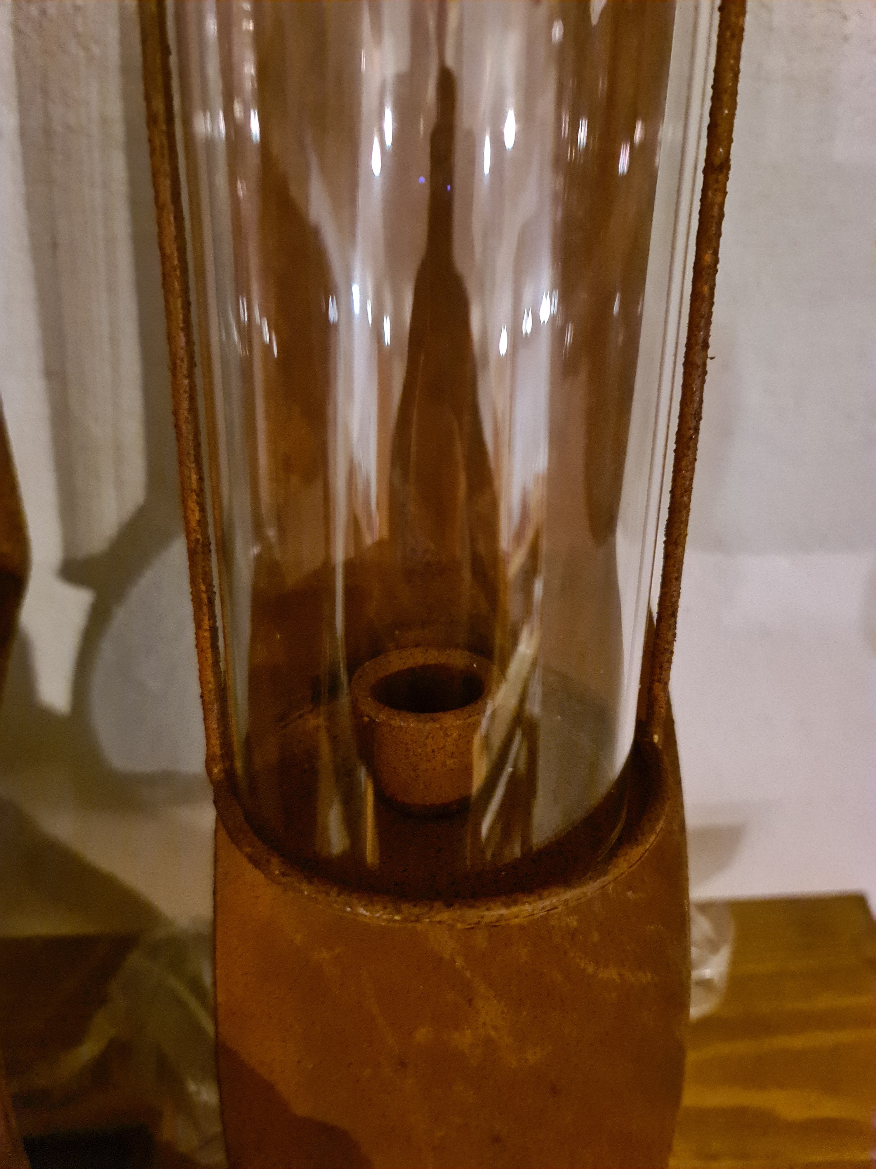 2 lanterns with storm glass for candles, wall-hung, metal, rust, height 56 cm, width 11 cm