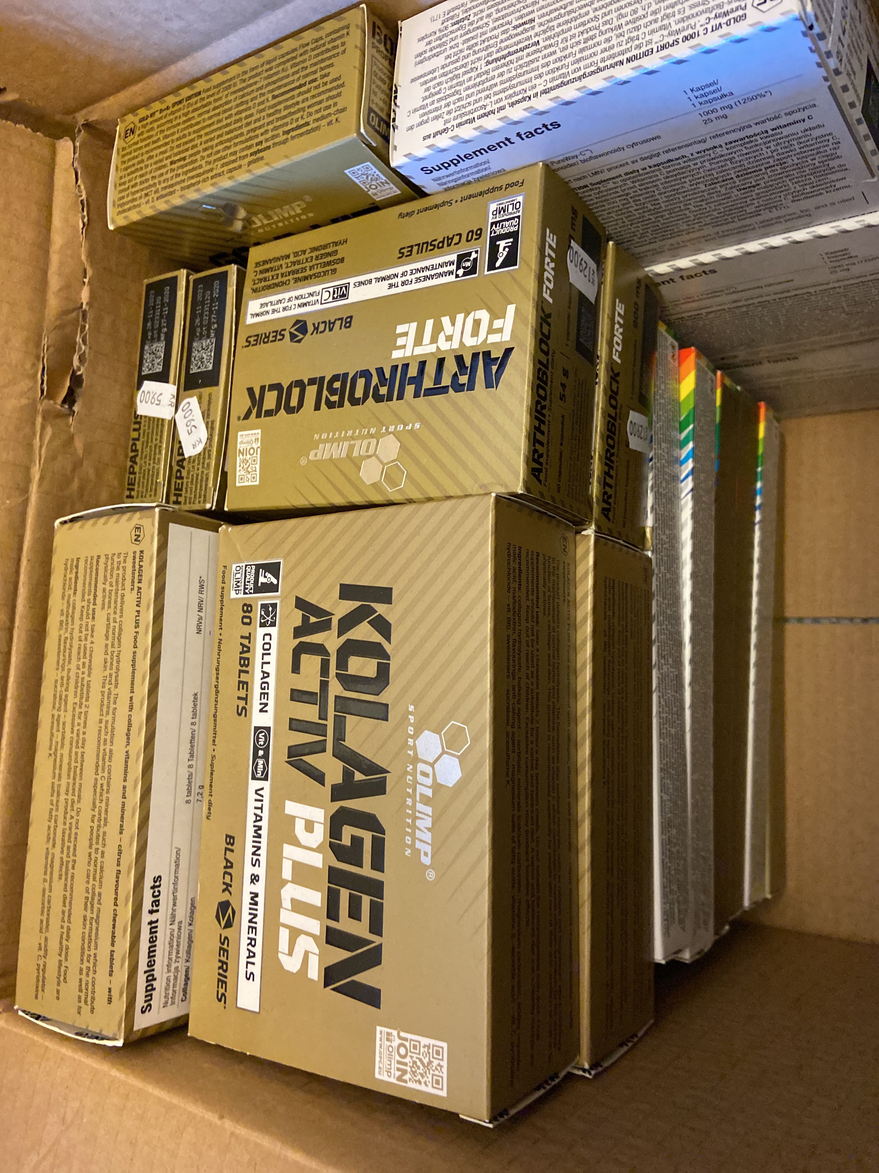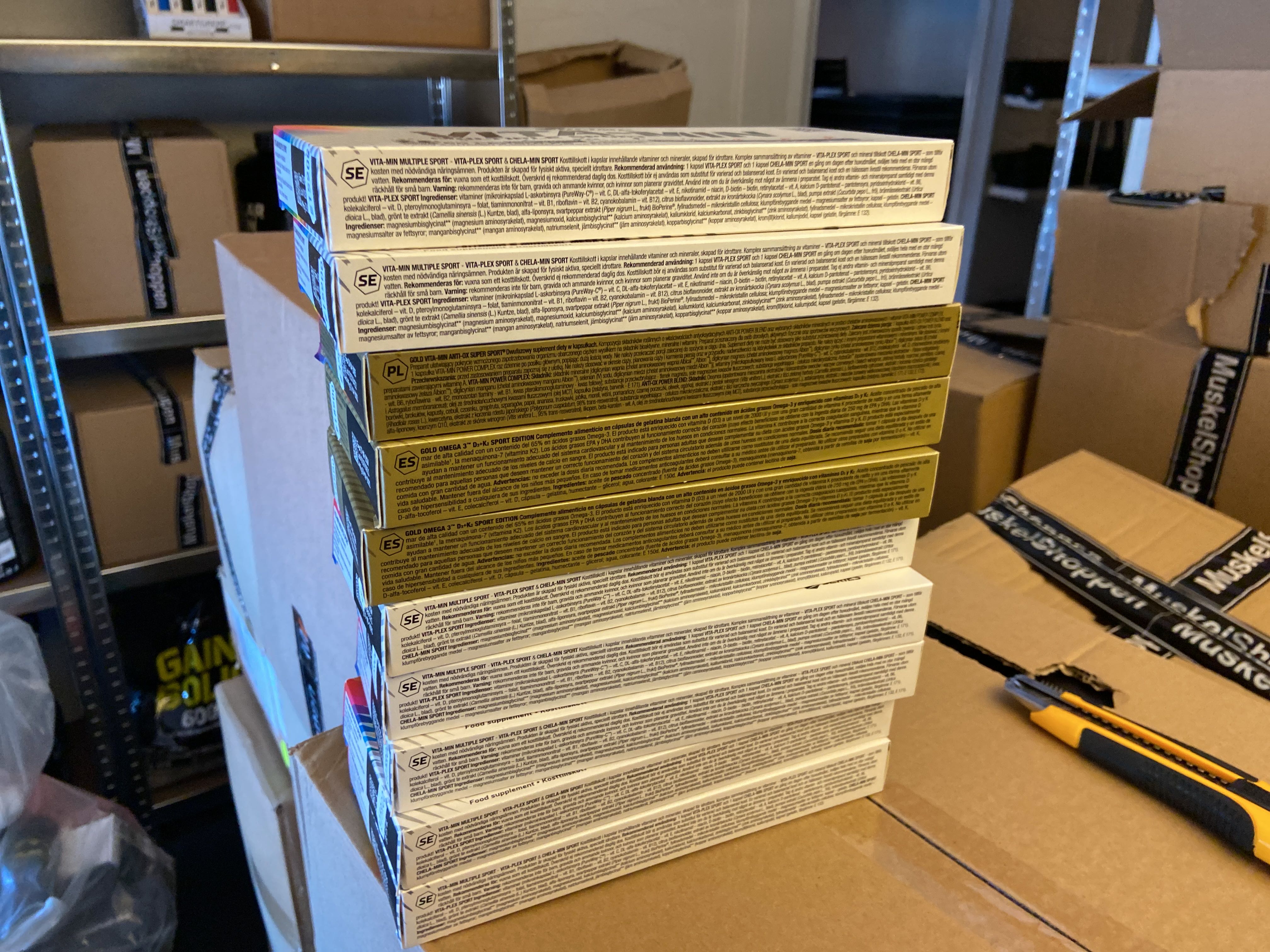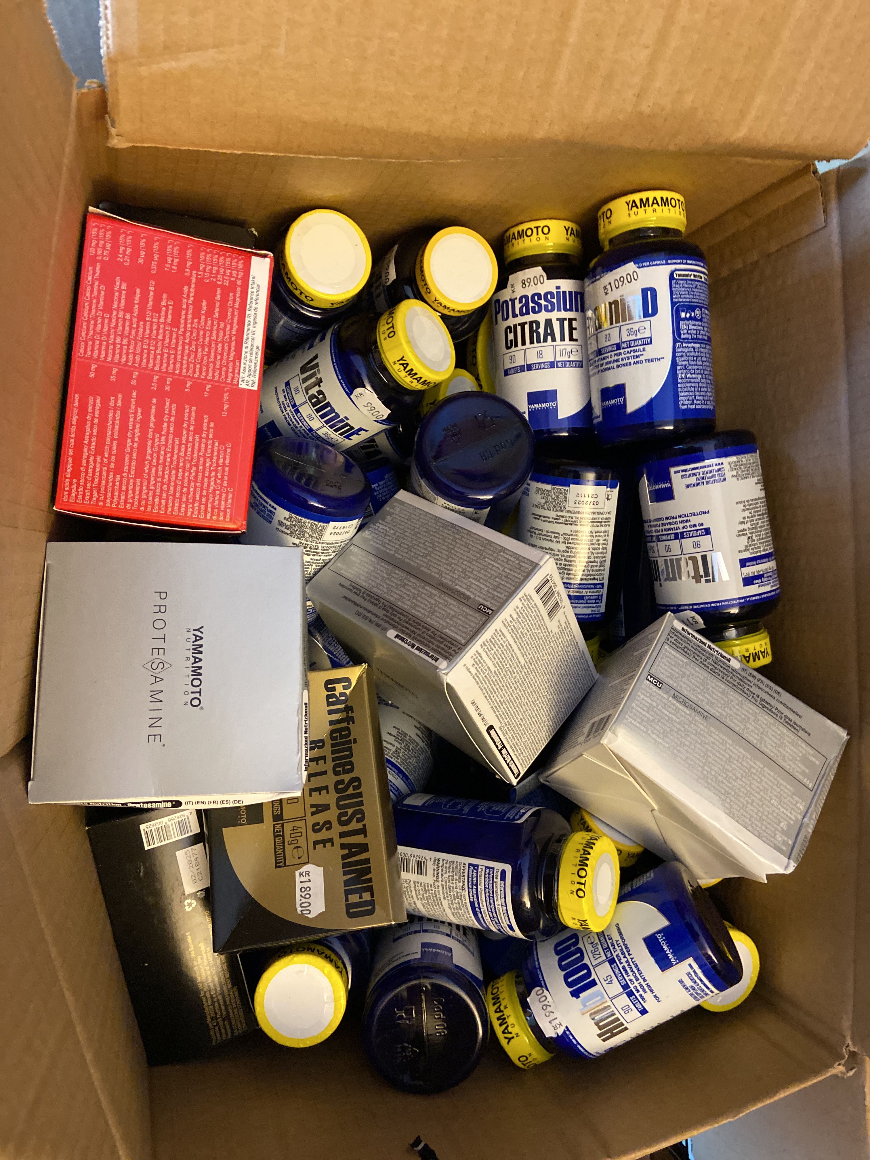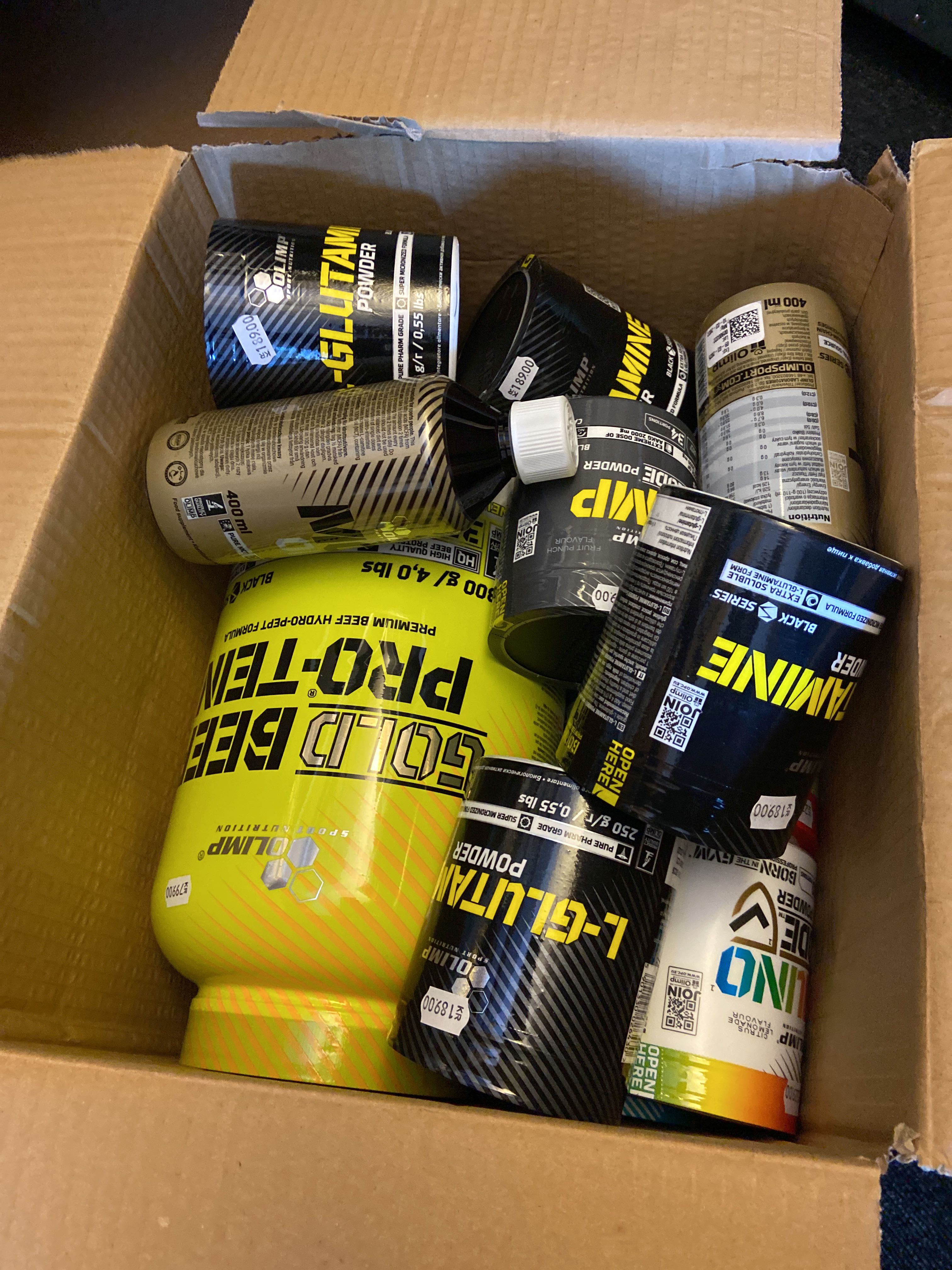 The lot contains, among other things, BCAA, EAA, Protein powder, PWO, Glycocharge, Gainers, Glutamine, Casein, Vitamins & minerals, Carbohydrate, CLA, HMB etc.