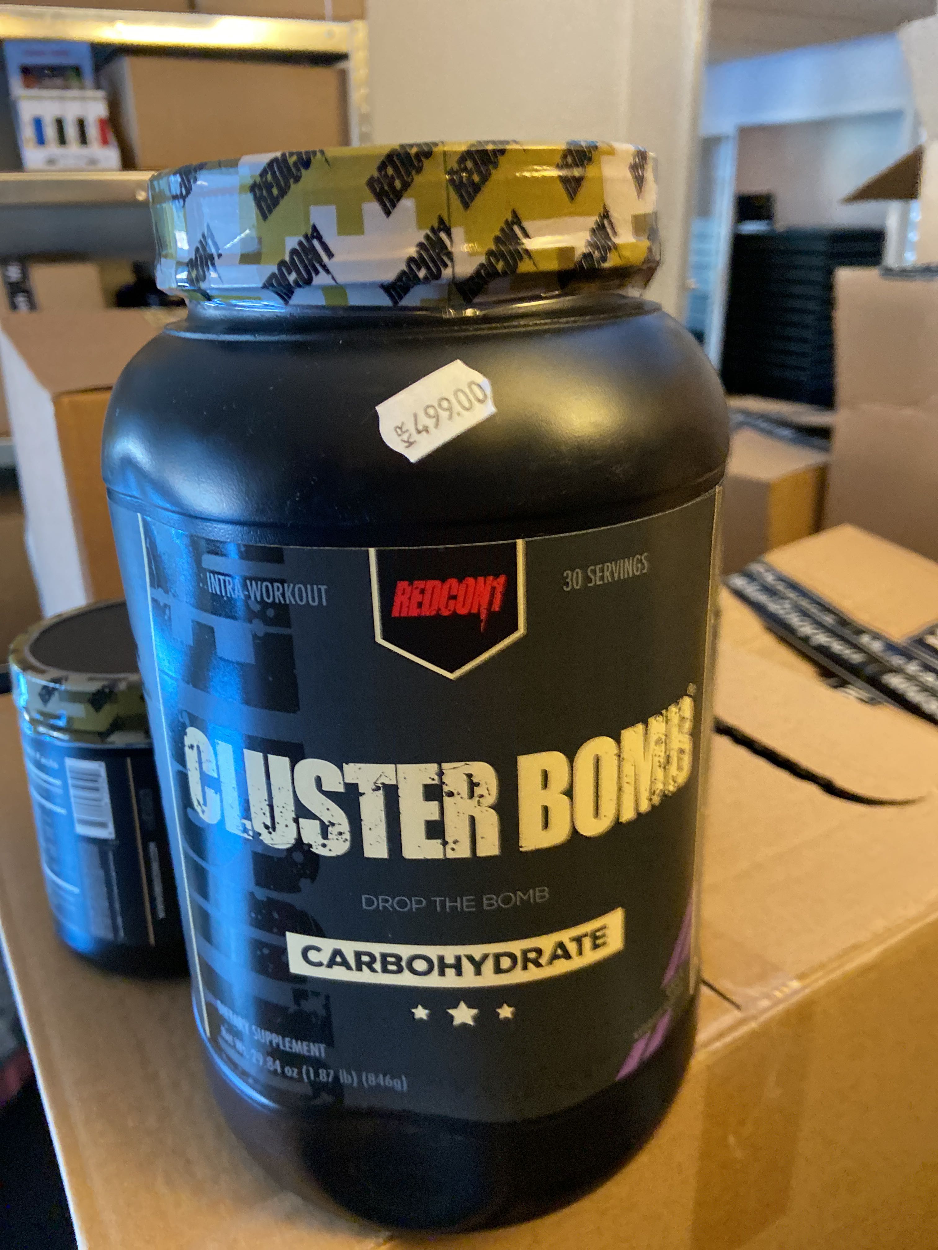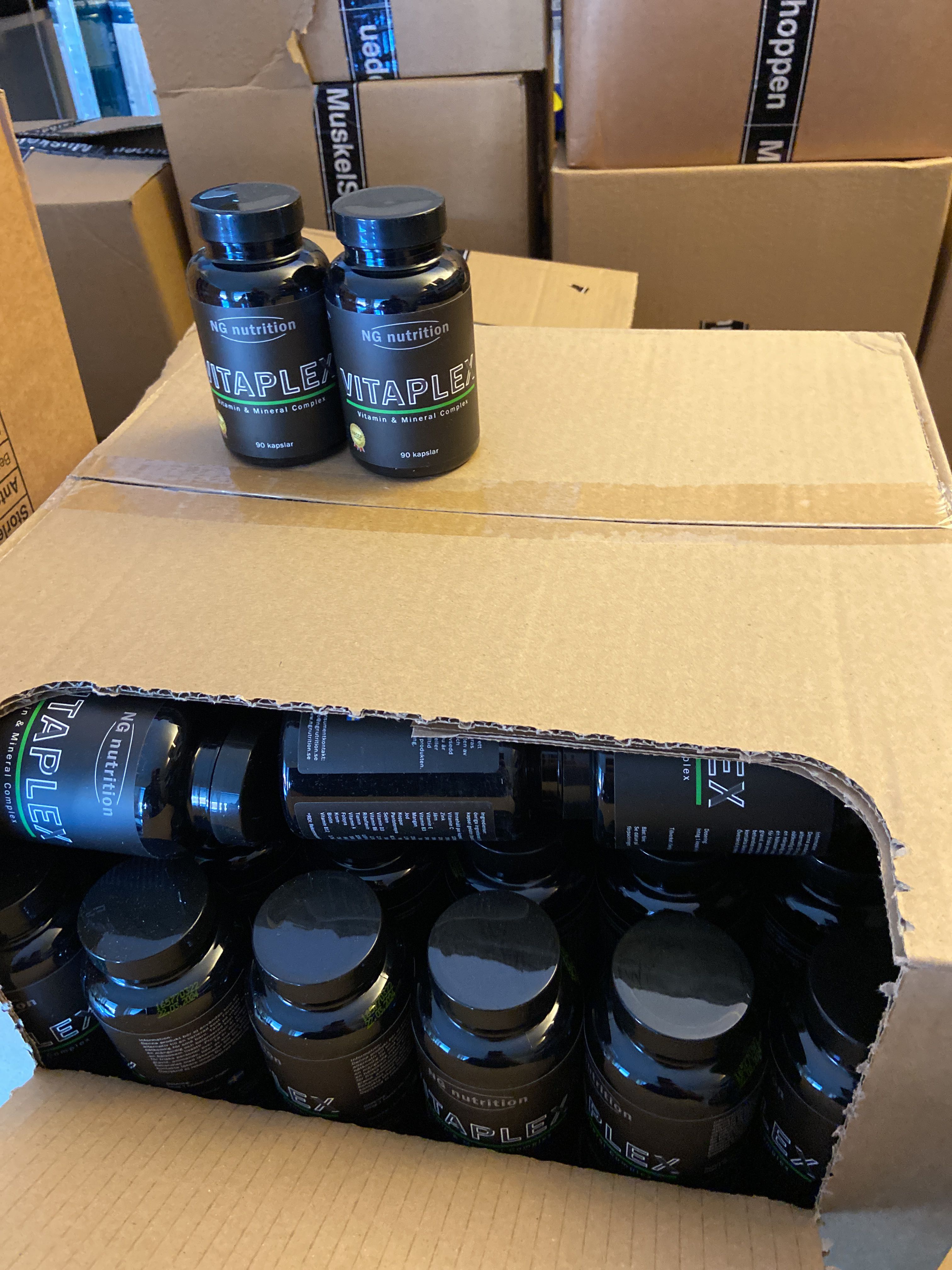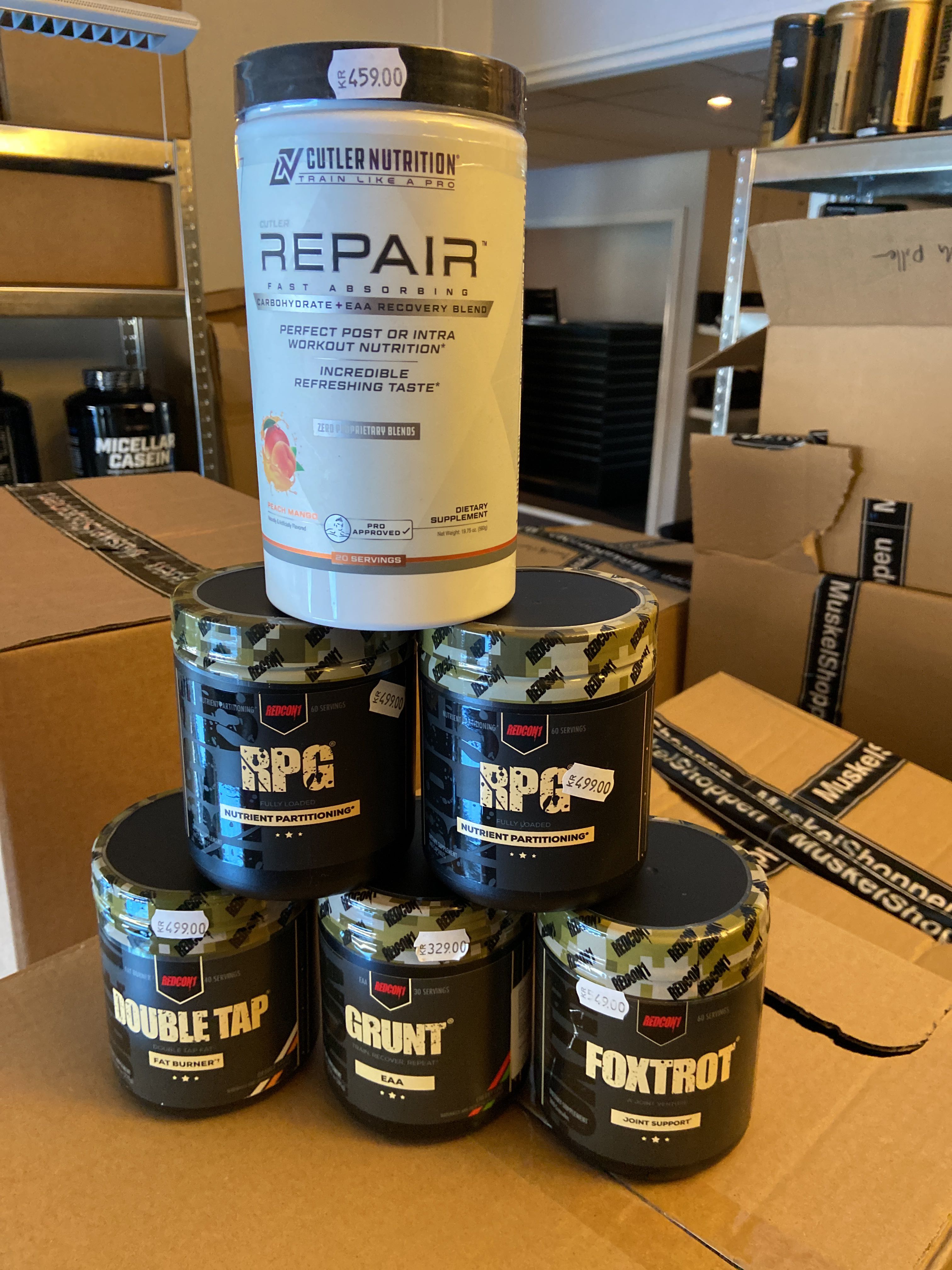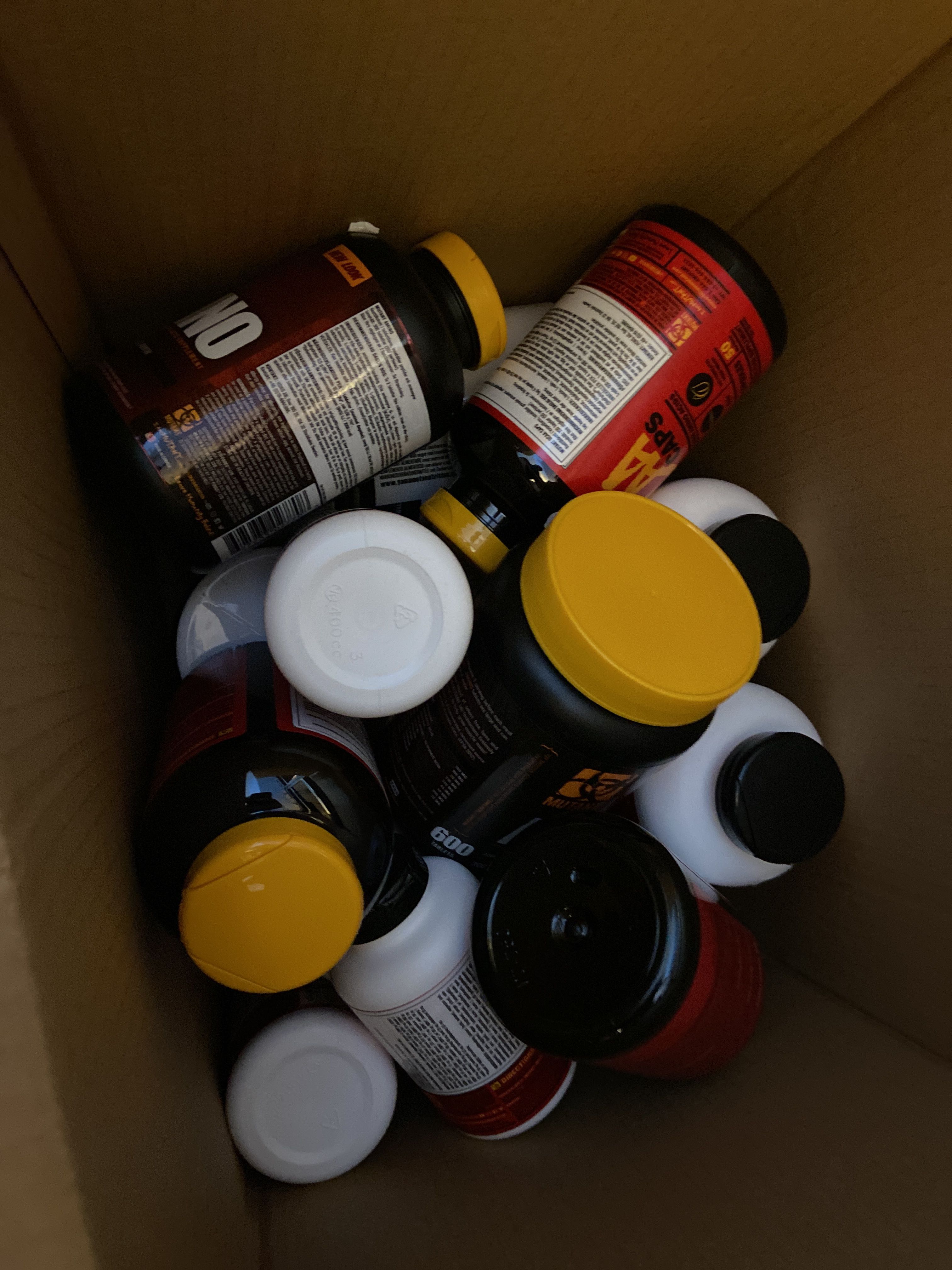 Large batch of nutritional supplements for strength-oriented sports.