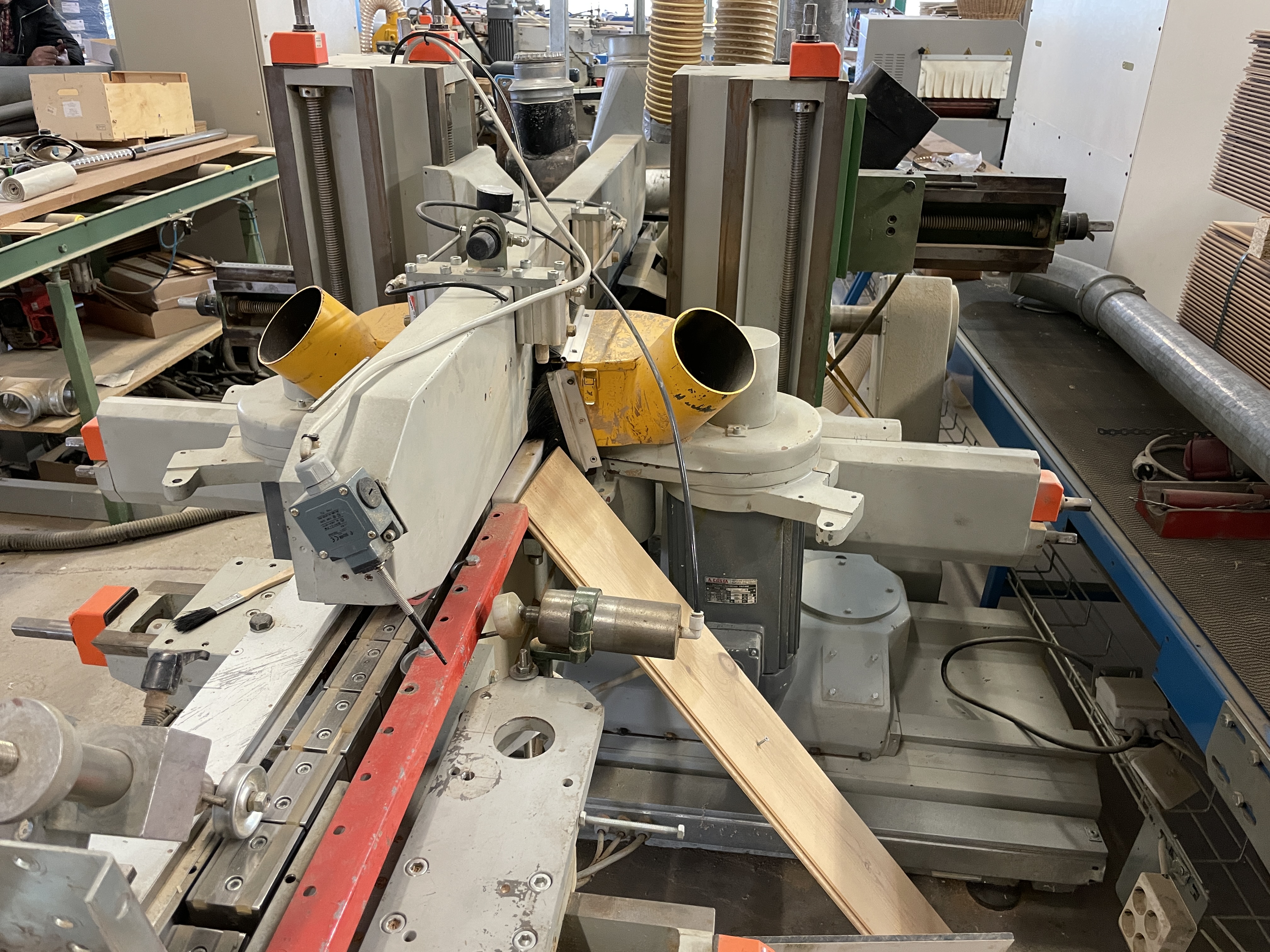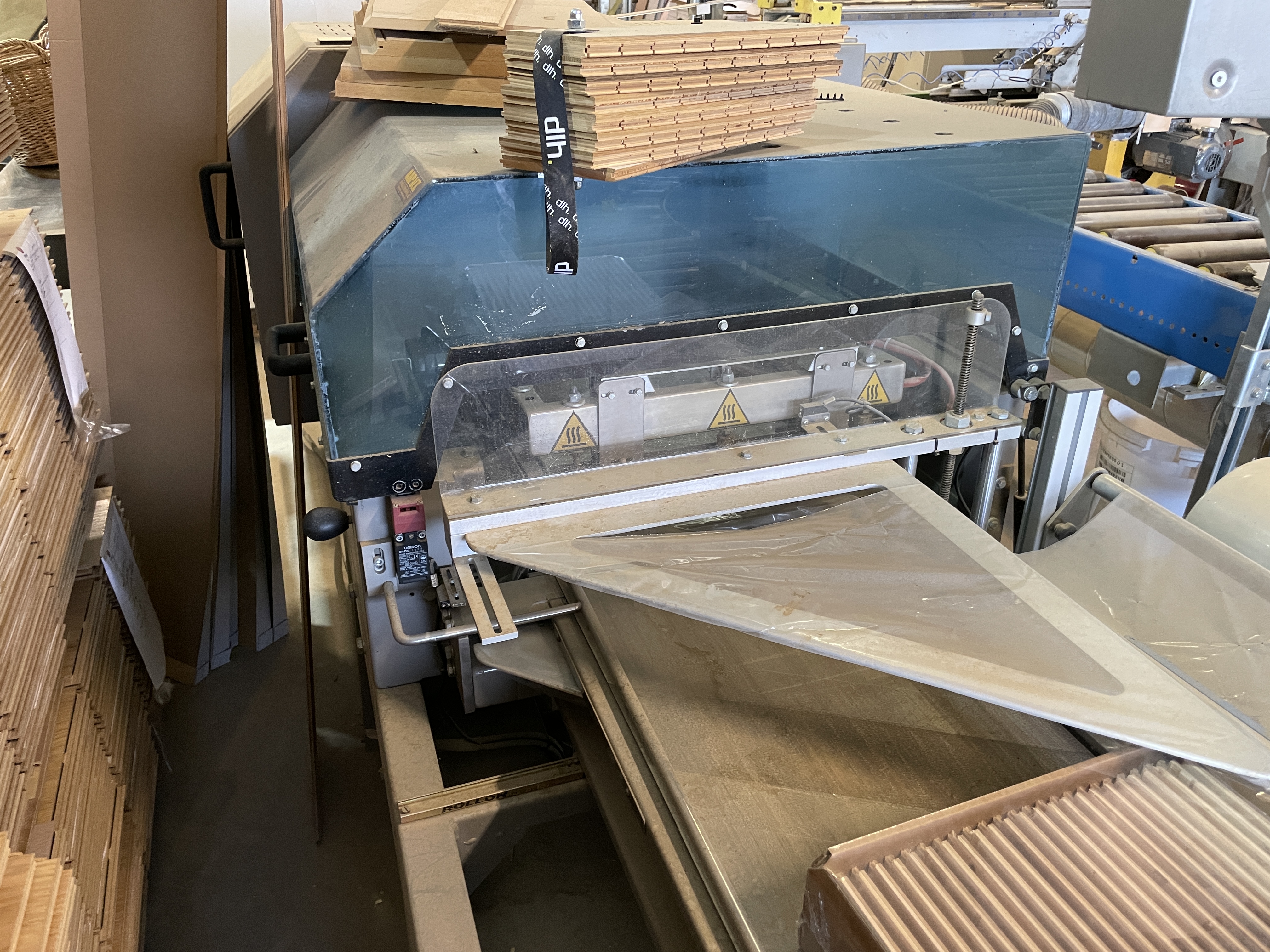Profiling line for herringbone parquet floors, with snap lock.
