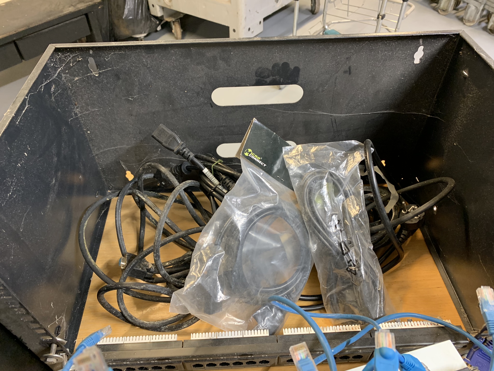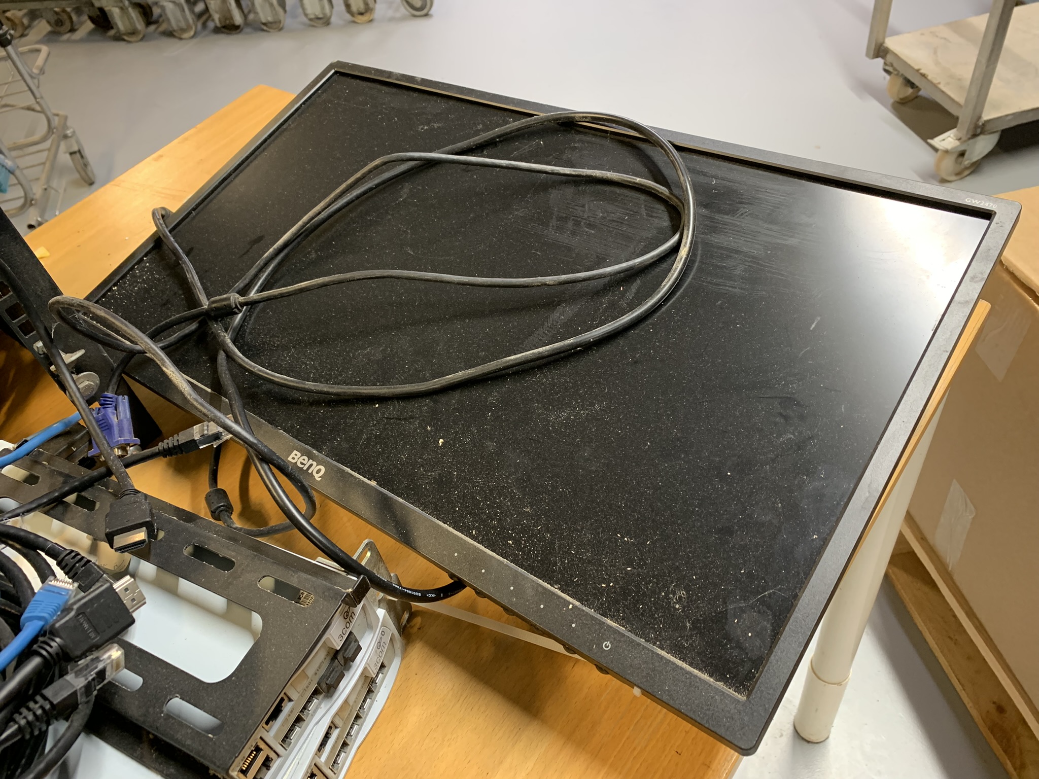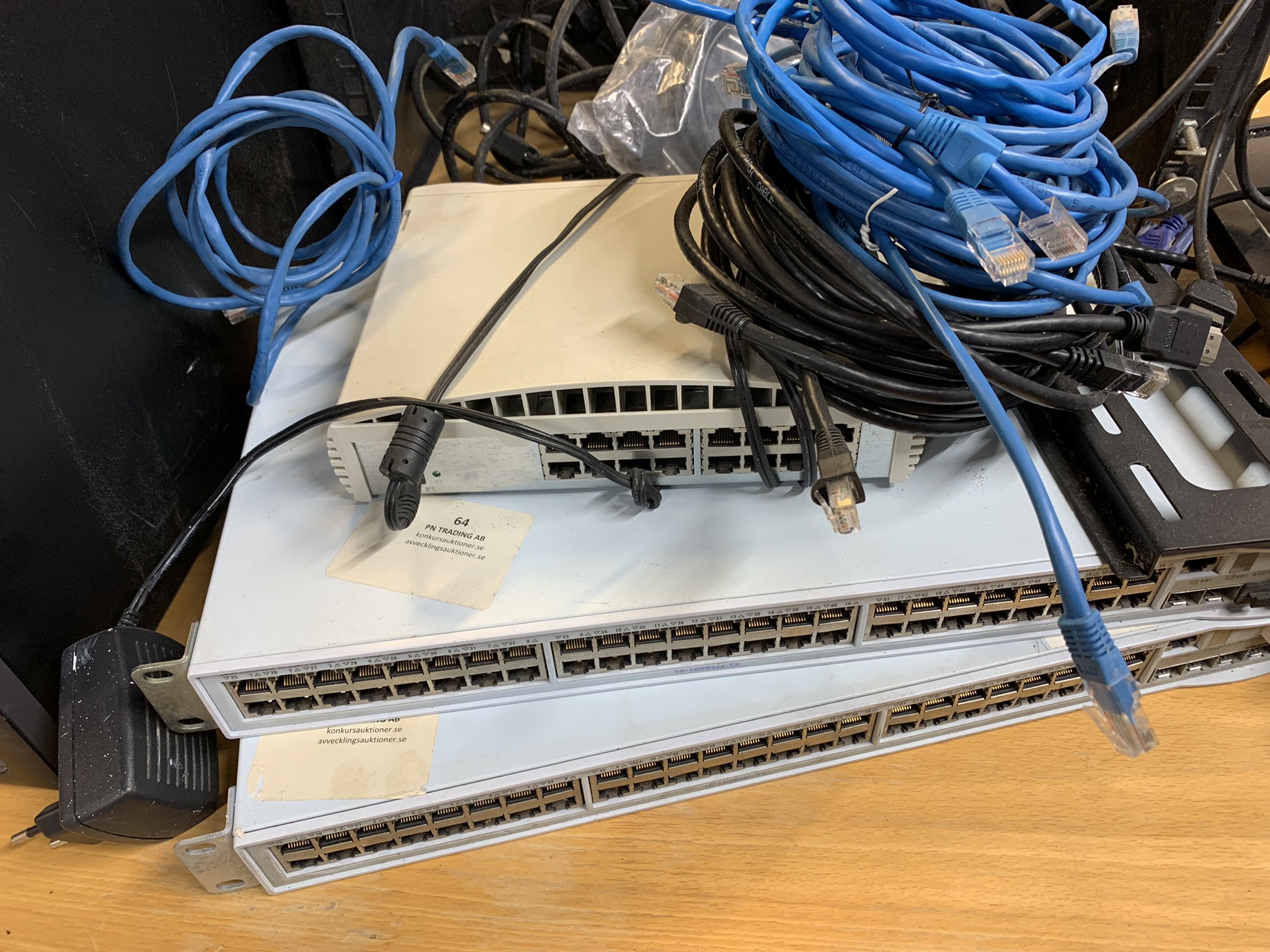 4 PCs, 1 monitor, various network cables, power connector cable, monitor cable,